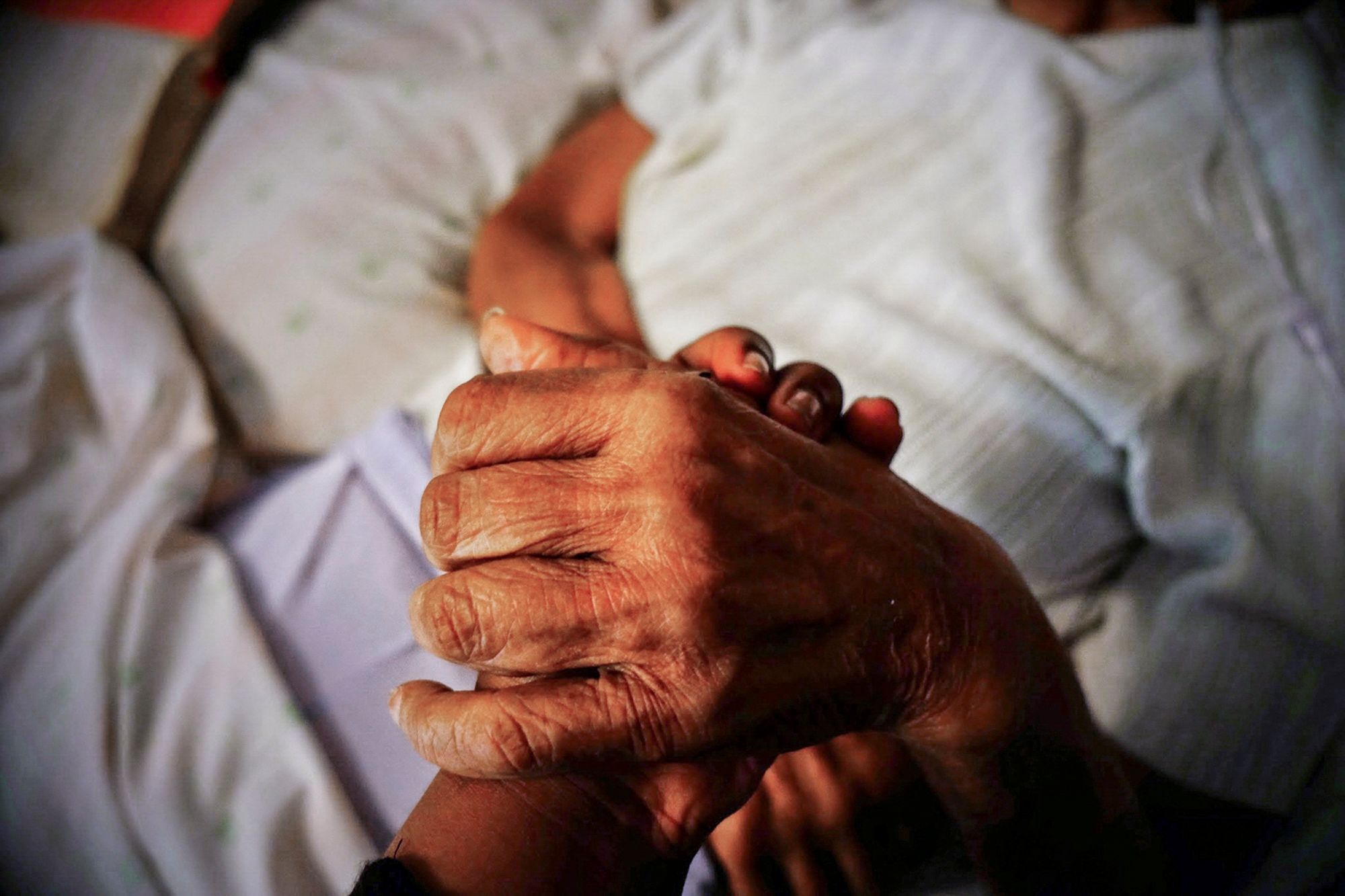 Grandma, in excruciating pain and barely able to breathe, asks to hold my hand and that I pray over her. This is the second night after my arrival. My grandma passed away a week later. Saying a prayer over a religious elder is a special occasion. I'm not very religious, yet my Grandma trusted me. It is a moment I will always remember. Dalark, Arkansas.