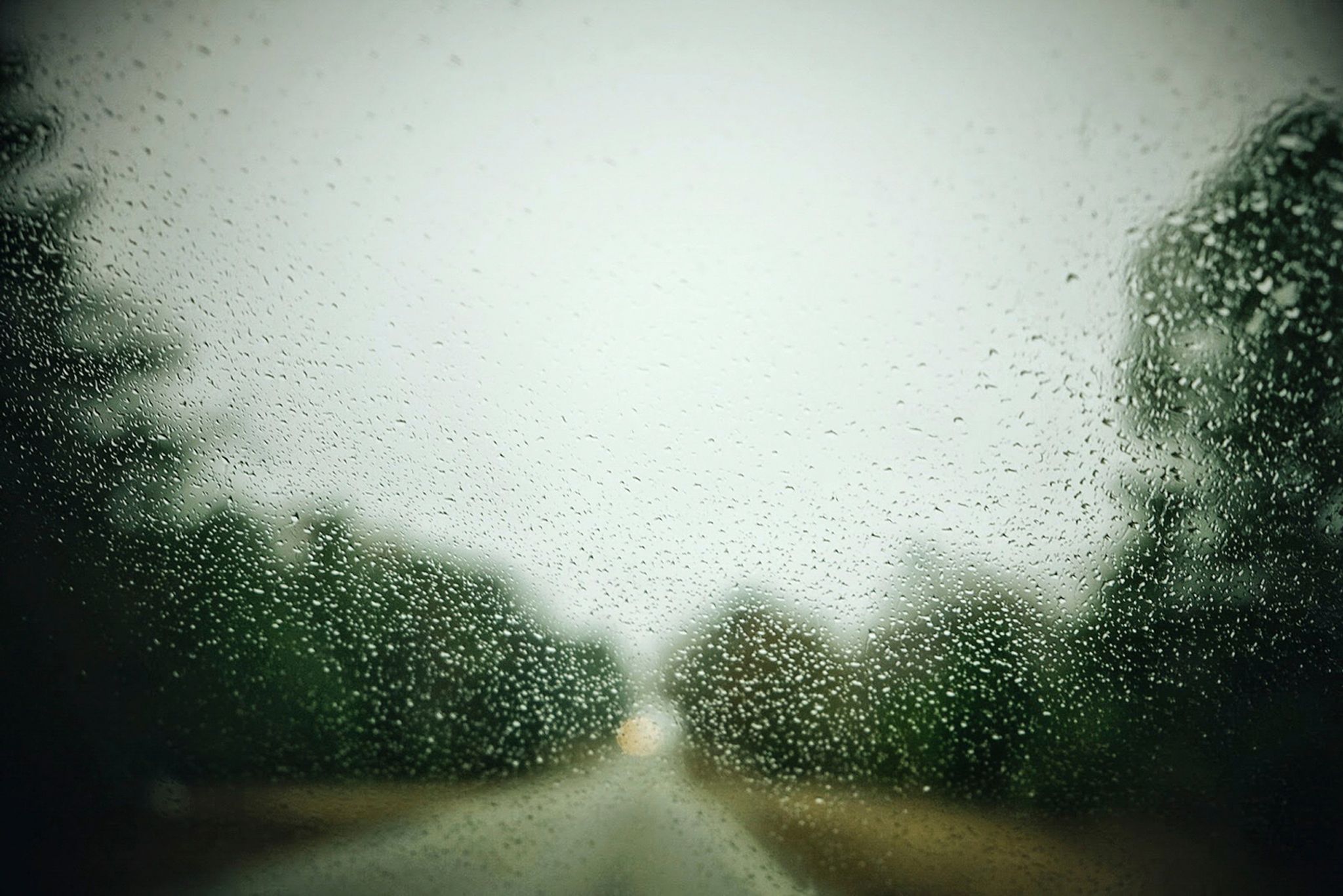 Raindrops on the windshield, driving into Dalark, Arkansas.