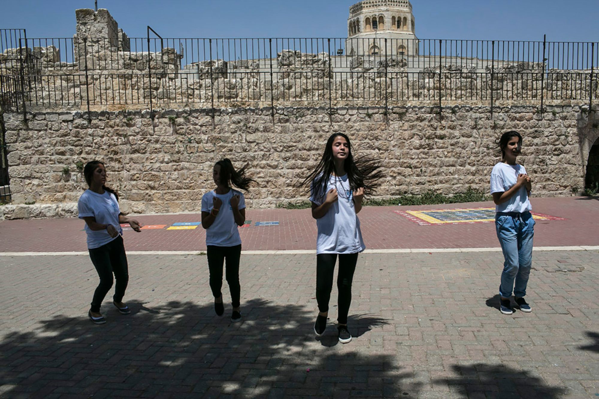 Palestinian teens enjoy Bourj Al Laq Laq---one of the most vital community centres in East Jerusalem, offering recreational and educational space for the Palestinian community (open air is precious in the 0.9 square kilometers walled in city). The Palestinian community of the Old City live in one of the most tense environments for Occupied Palestinians, including the youth (primarily boys) are frequently harassed and impending demolition orders and fear of losing their Jerusalem status hangs heavy. Space to simply be is rare and precious, and Bourj Al Laq Laq and the Dome of Rock are some of the few paces in the Old City Walls that young girls could be girls and run freely.