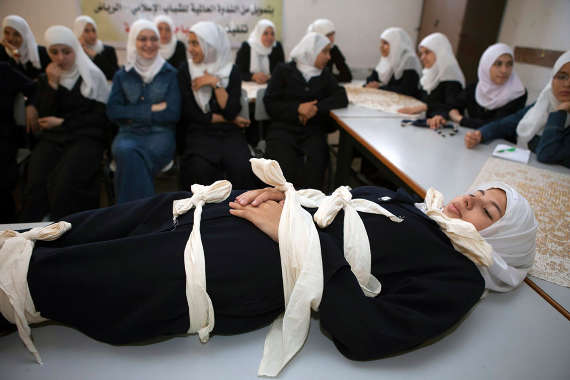 A young Gazan teen is tied up in a first aid course demonstration as her classmates giggle. In the immediate aftermath of the Israeli "Operation Cast Lead" war on Gaza, the trauma and loss of life were so vast (according to the Palestinian Centre for Human Rights, 926 civilians lost their lives) that women associations began teaching first aid courses to children. This was to help the children feel they had agency, both a coping mechanism and also practical measure to save lives. Occupied Palestinian Territories, Gaza, Gaza City