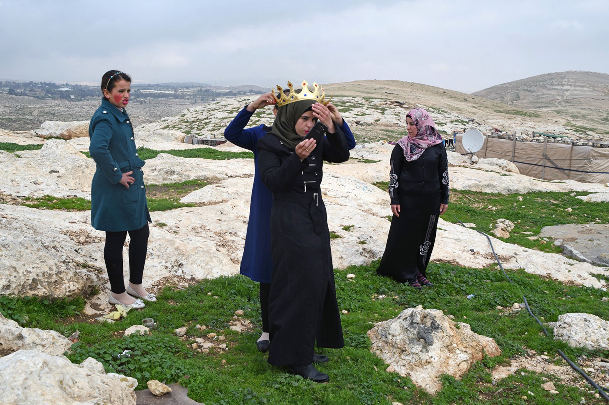 Bedouin women (mothers and teens alike) of Palestinian community of Zanba play “queen for a day” with props left over from a visiting mobile community theatre / ngo. The women in Bedouin rural communities are generally extremely conservative, but Zanba is a rare treat of playfulness. They felt ancient "Amazon warrior" like in their confidence, warmth, and natural leadership. The community is under threat of continued demolitions of their modest structures and fear they could be forced of their land. Occupied West Bank, 2018.