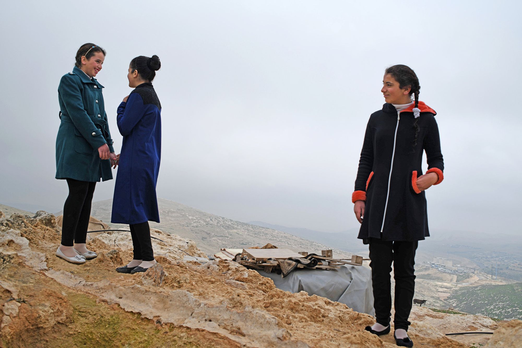 Bedouin teens of Palestinian community of Zanba enjoy the disruption of the usual daily life when a humanitarian organization comes with a theatre for the small children. With their mothers and younger siblings occupied, they took opportunity to play. The community is under threat of continued demolitions of their modest structures and fear they could be forced of their land Occupied West Bank, 2018.