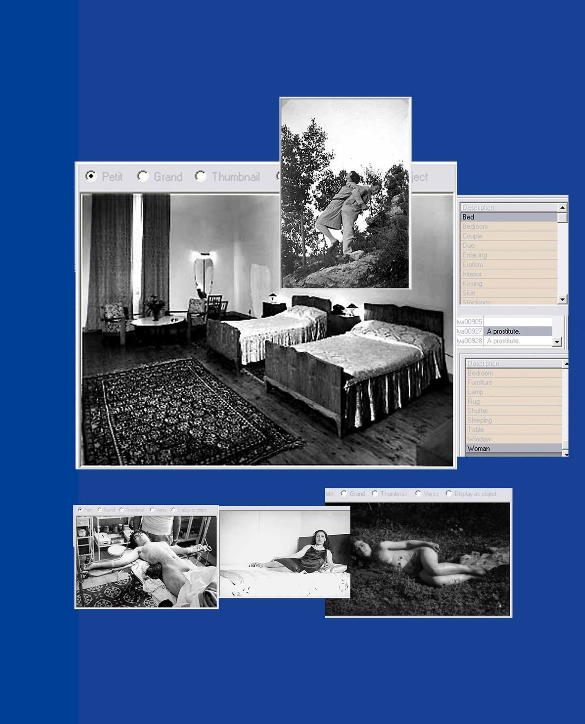 In contrast to this kind of dusty paper-based materiality, I also became interested in the Foundation’s online database, both the textual taxonomy and its digitised photographs. Opening myself to chance, I let myself be guided by the intention to find something sleazy or sexy - photographic material with a twist… that might be troubling the archive. I typed in the database search fields the word ‘sexuality’ and found no sexuality in the archive, but found ‘sex’, as well as ‘body’, ‘nudity’, ‘breast’, ‘leg’, ‘bedroom’… Overwhelmed by the joy of corporeal indexicality, they are already digital archaeology. They are a testimony to an out-dated bureaucratic classification system of French colonial legacy, soon to disappear under the auspices of a new open access database to be implemented at the Arab Image Foundation.
