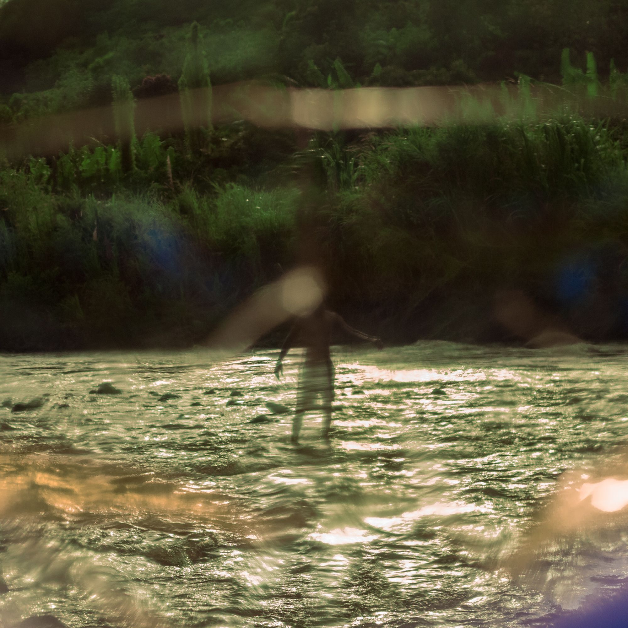 [ES] Un hombre con cara de estrella flota sobre el río Chota.[EN] A man with star face floats on the Chota river.