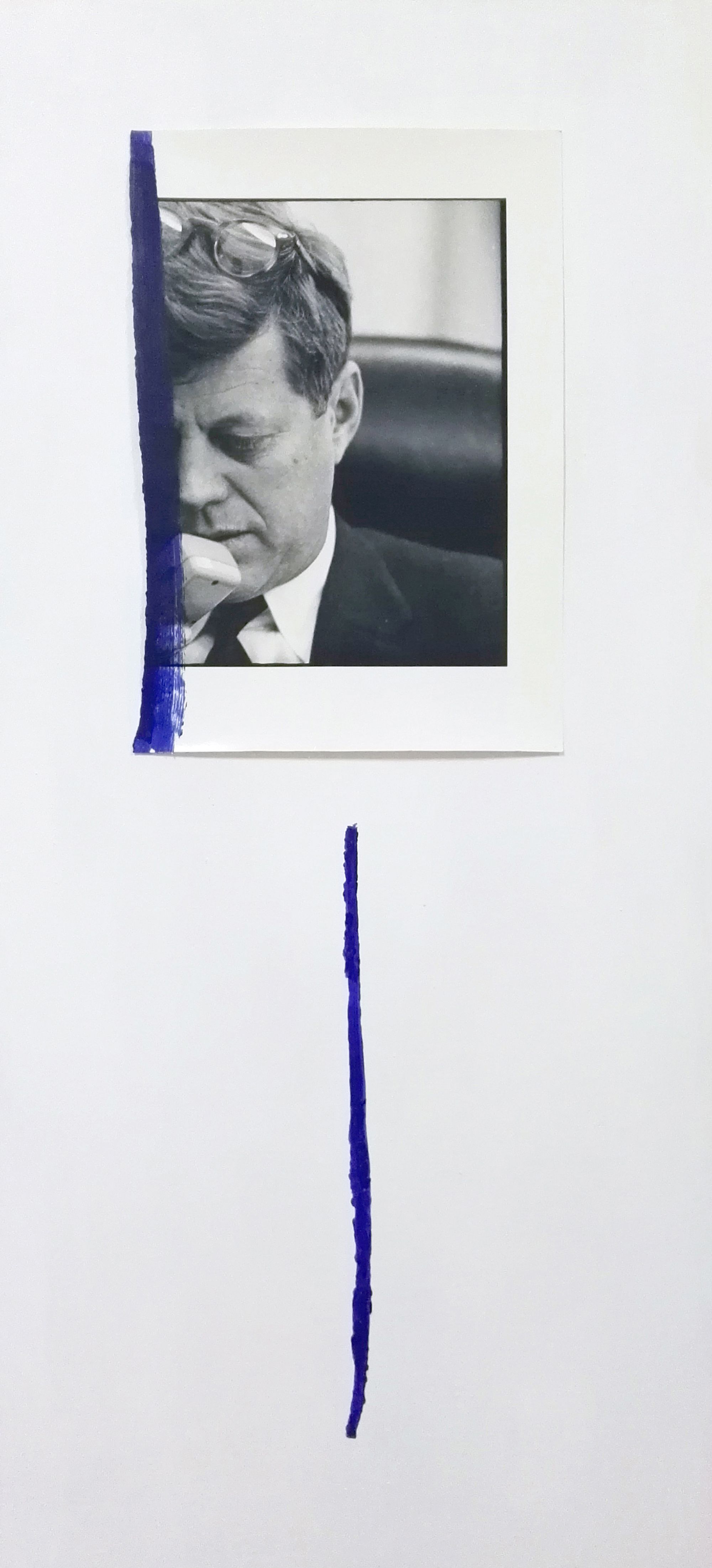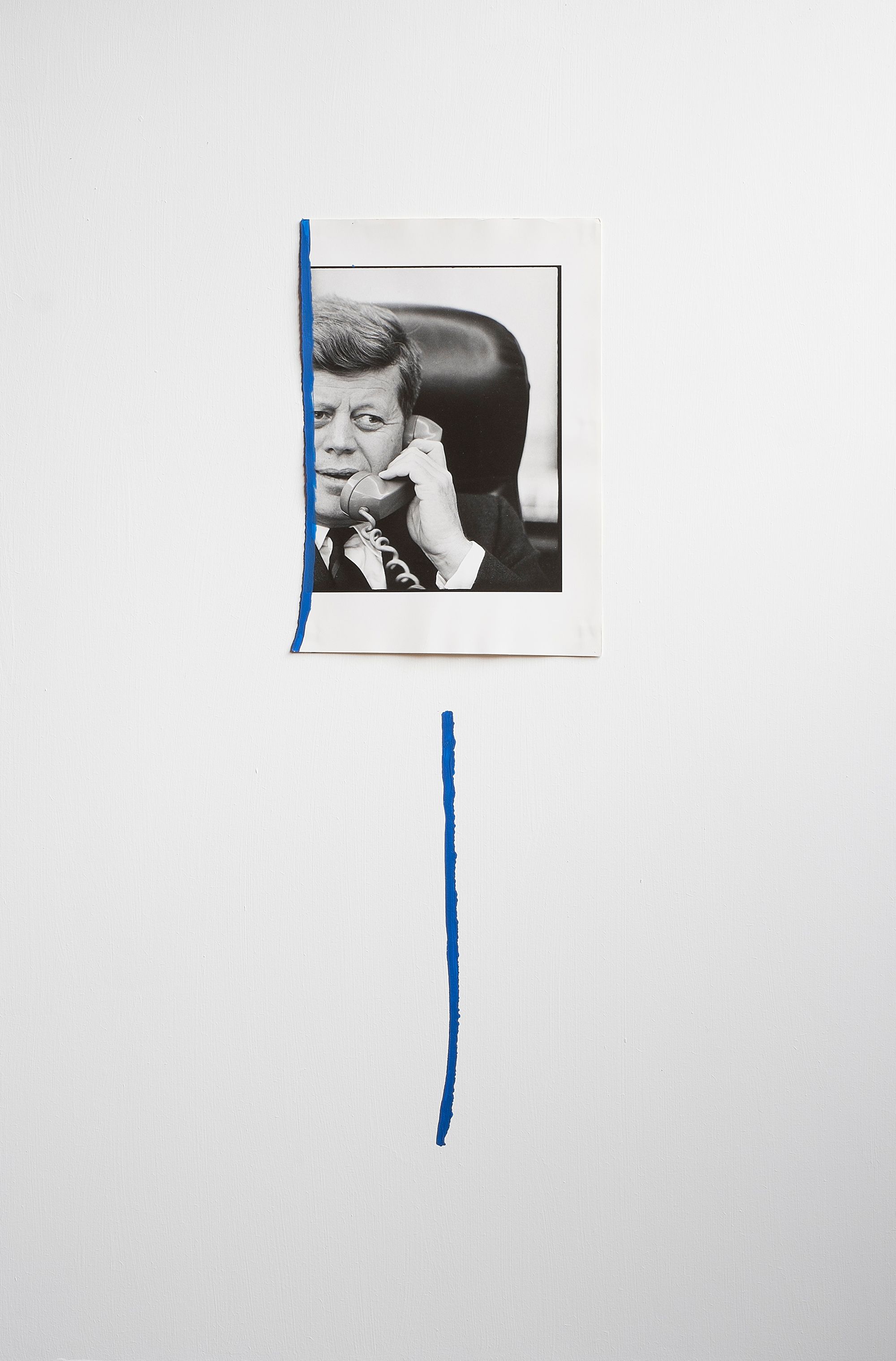 Stracciafotografia - JFK, telefono, 2017-2018. (Found photography, blue acrylic paint on cementite treated mdf - Unique Artwork)
