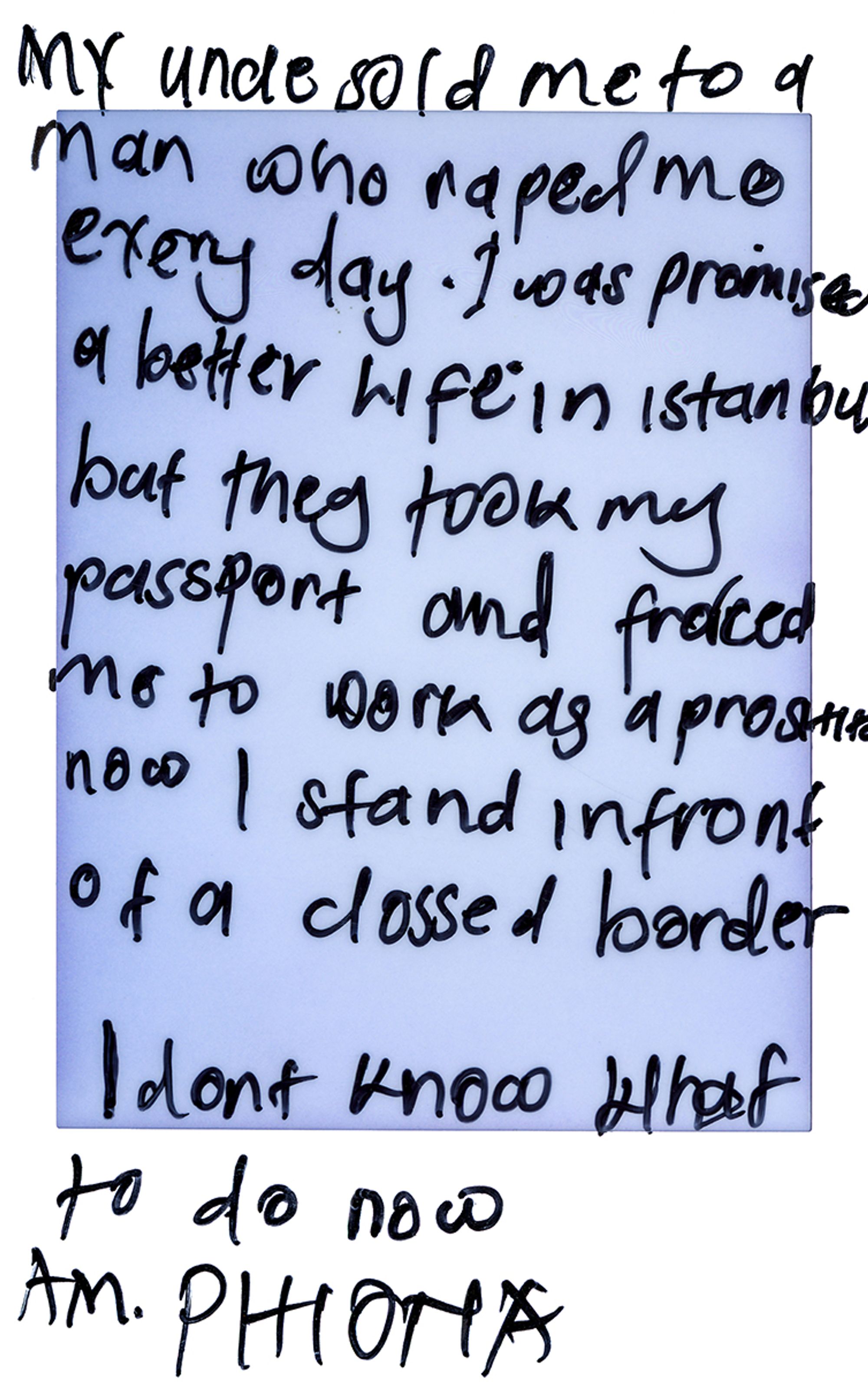 »My uncle sold me to a man who raped me every day. I was promised a better life in Istanbul but they took my passport and forced me to work as a prostitute. Now I stand in front of a closed border. I dont know what to do now. Am Phiona«Eidomeni, Greek/Macedonian border