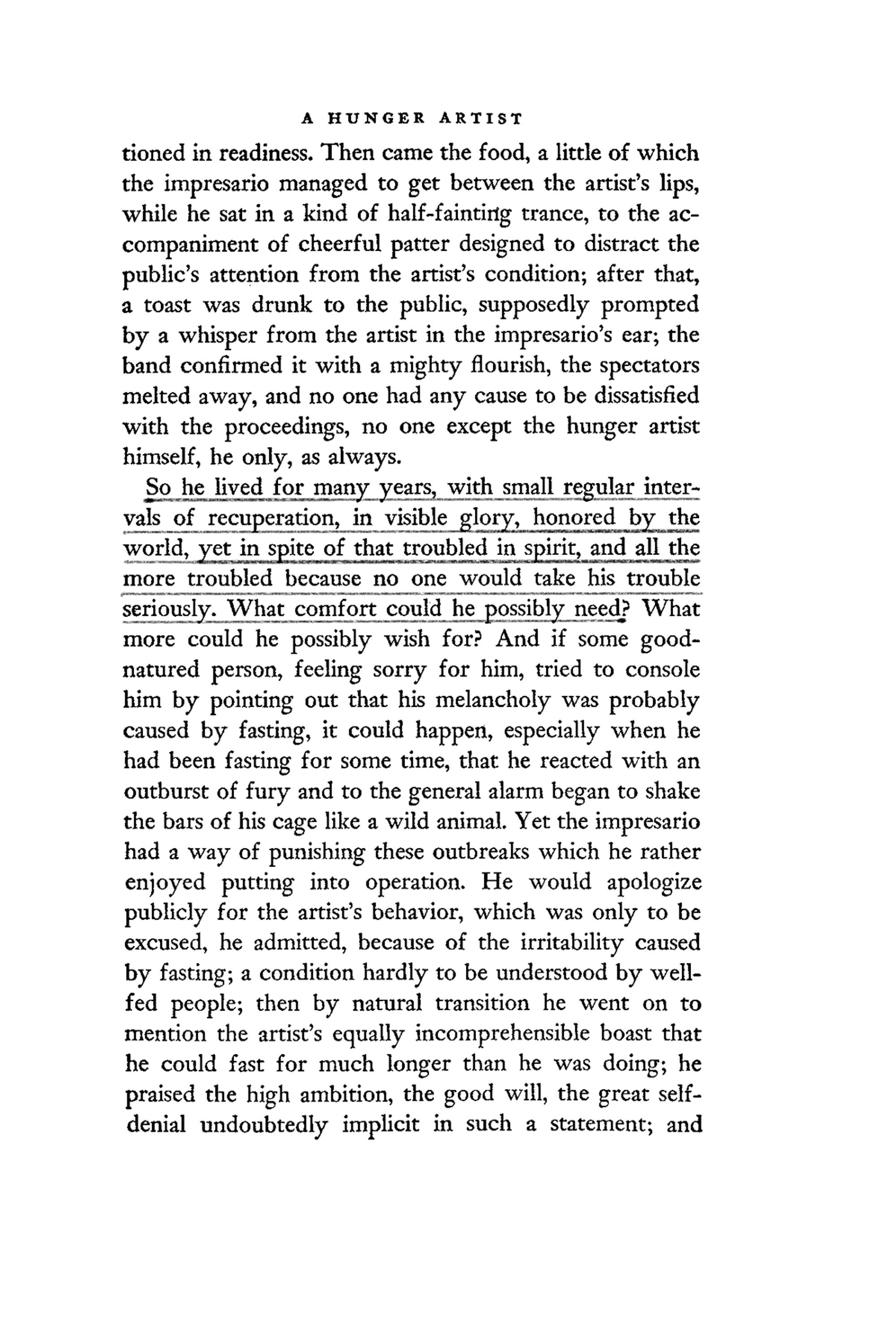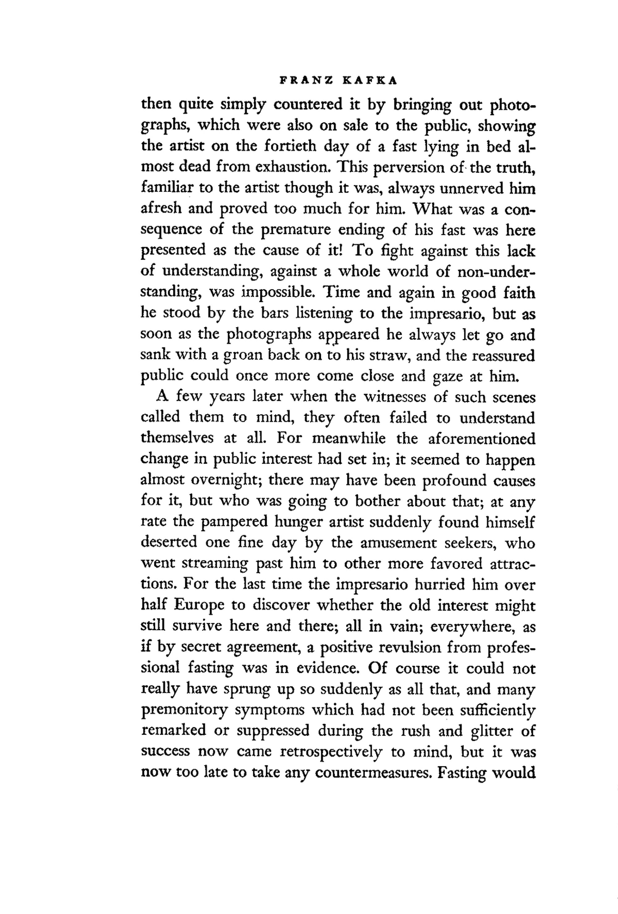 “[...] He even alleged that if he was allowed to fast as he liked ,(...), he could astound the world by establishing a record never yet achieved, a statement which certainly provoked a smile among the other professionals, since it was left out of account the change in public opinion, which the hunger artist in his zeal conveniently forgot.”