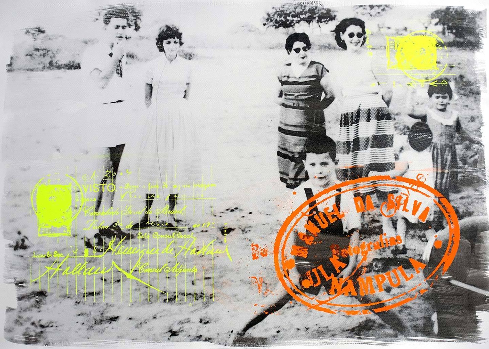 Thanks to clues relating to the process of creating a photographic documentation of the family (such as stamps from the same photographic studio, a similar brand of photographic paper used throughout the photographs), Jasse was able to piece the archive together, bring together family members and reconstitute fragments of their narratives. The resulting body of work bears the traces of Jasses’ research and archiving process, as he often screen-prints atop the images, enlarged and fluo-coloured stamps lifted from the official documentation which he attributed to the family – a symbolic procedure mimicking that of a government official assigning stamps to documents and highlighting the role of photography in both, the process of memory-making in relation to the photograph but also how, since its inception, photography has been used as a tool of administrative control.