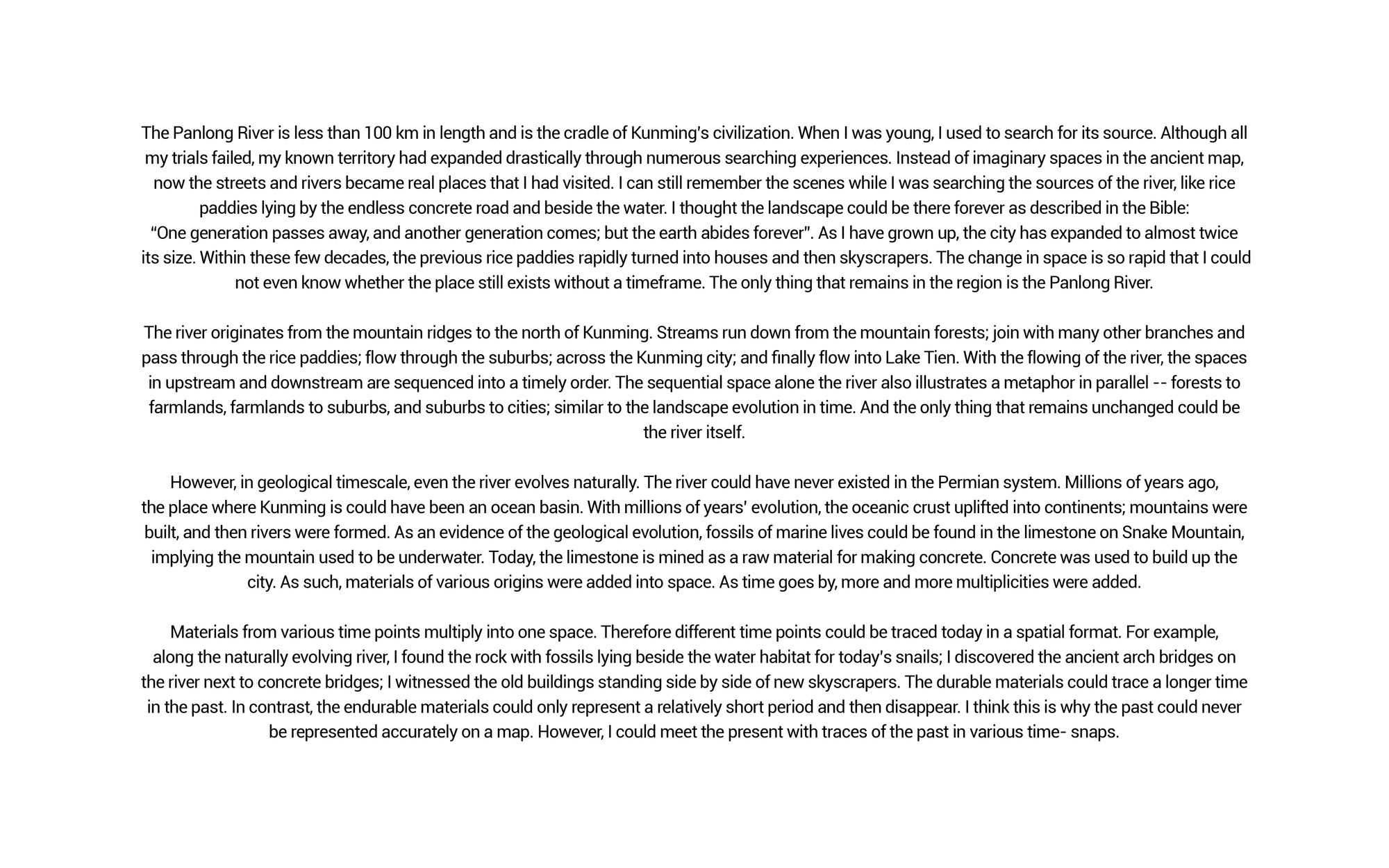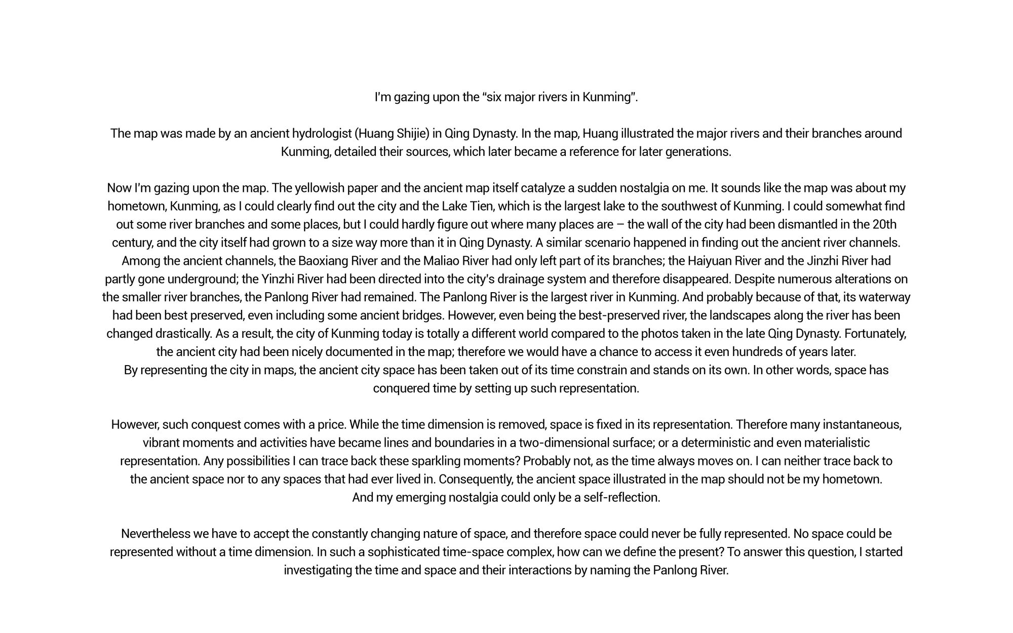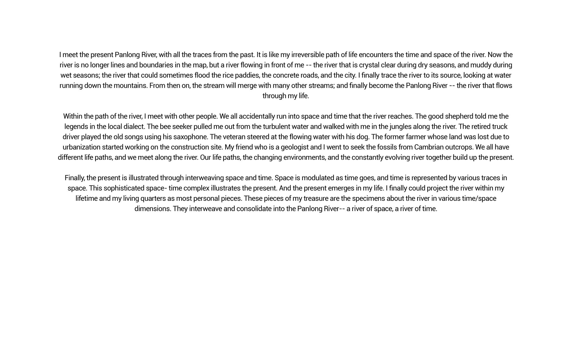 The river presents itself so differently at various times and spaces and thrives on every one of them. Therefore what I can feel about the river is only its projection within my lifetime and my living quarters, and apparently a metamorphic slice. I tried to be objective towards the naming it, but all I obtained is still the most personal treasures. These pieces of my treasure are the specimens about the river in various time/space dimensions. They interweave and consolidate into another equally complex river -- a river named by me.
