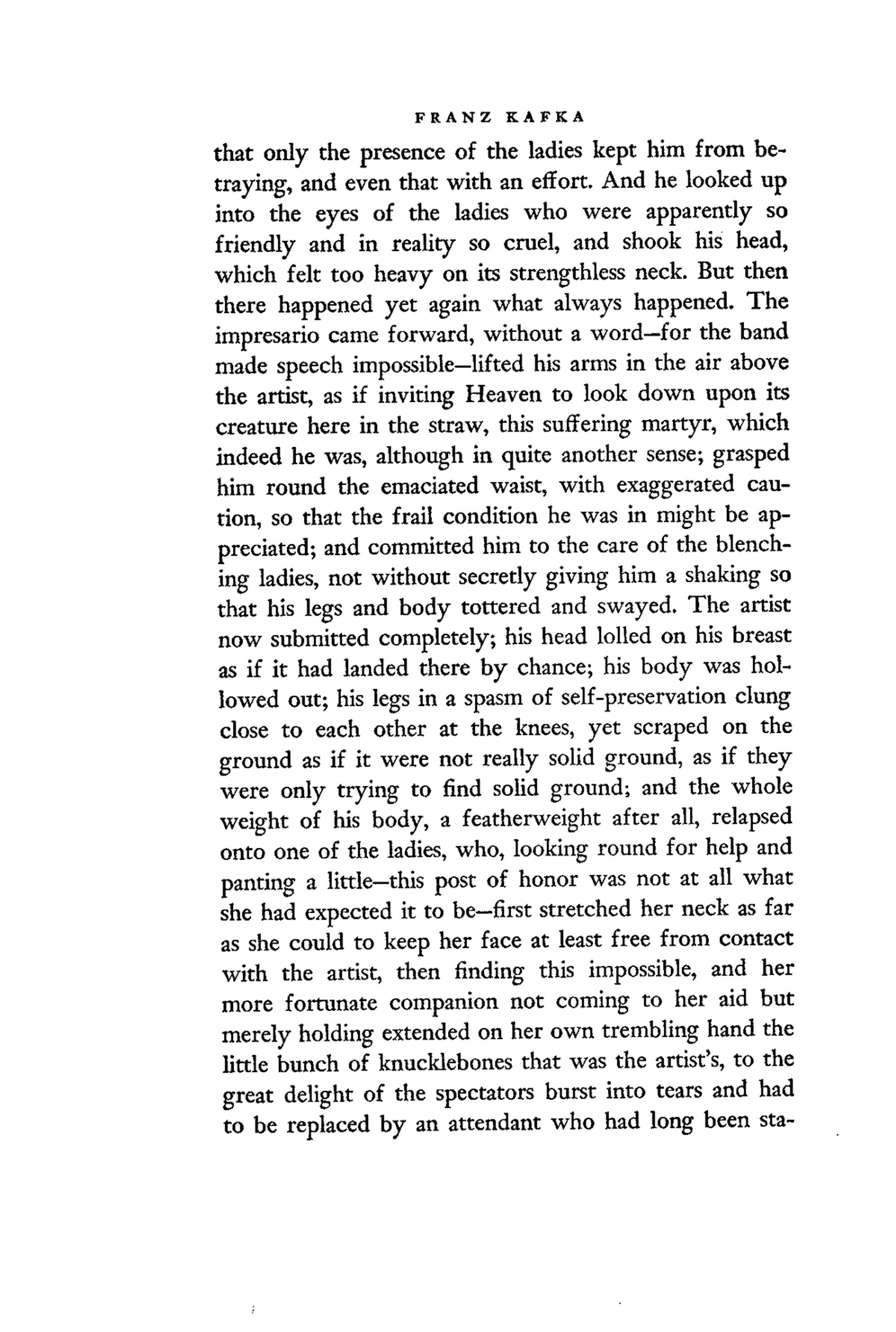 “What, then, was the hunger artist to do? He had been applauded by thousands in his time and could hardly come down to showing himself in a street booth at village fairs, and as for adopting another profession, he was not only too old for that but too fanatically devoted to fasting. So he took leave of the impresario, his partner in an unparalleled career, and hired himself to a large circus;”