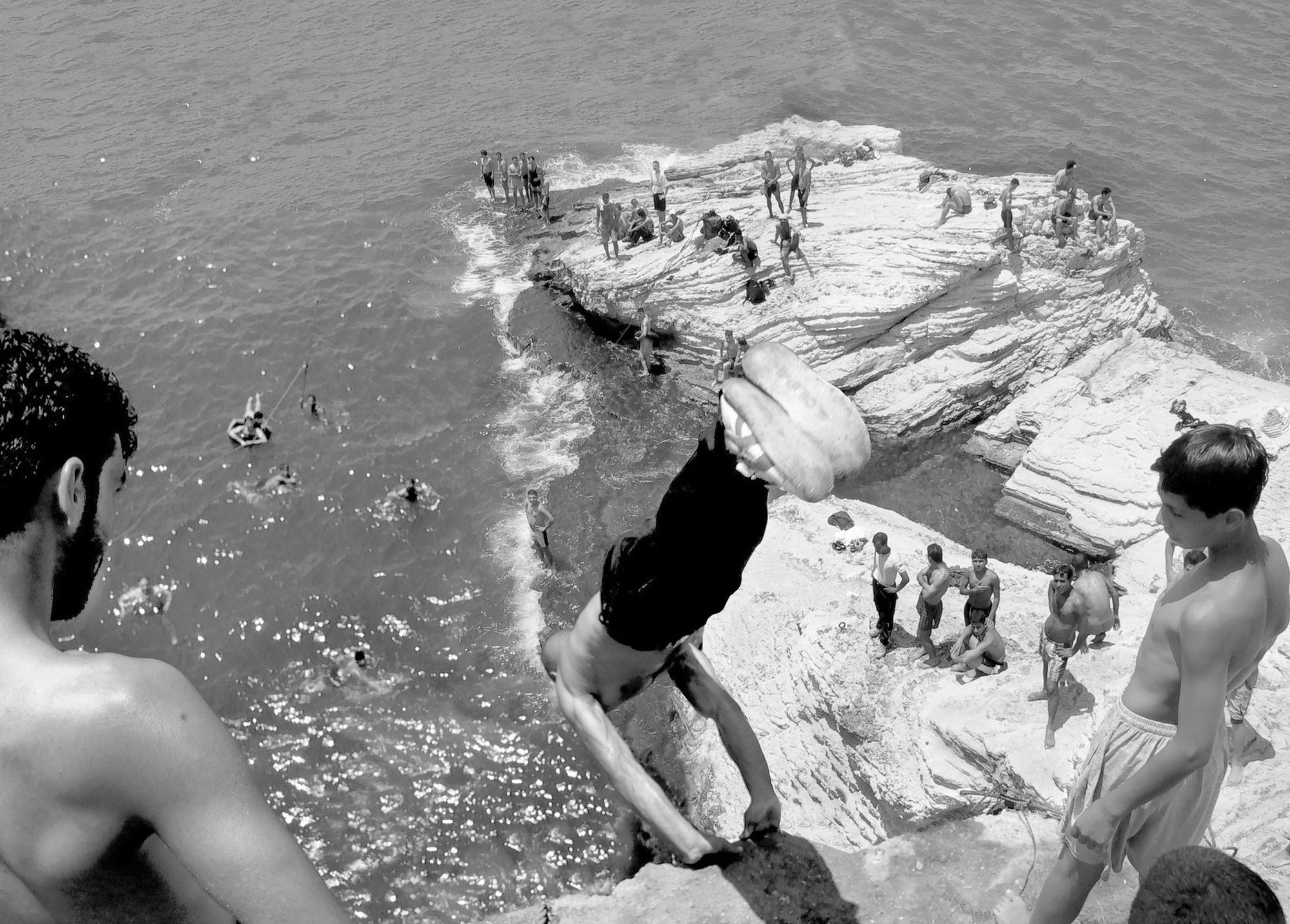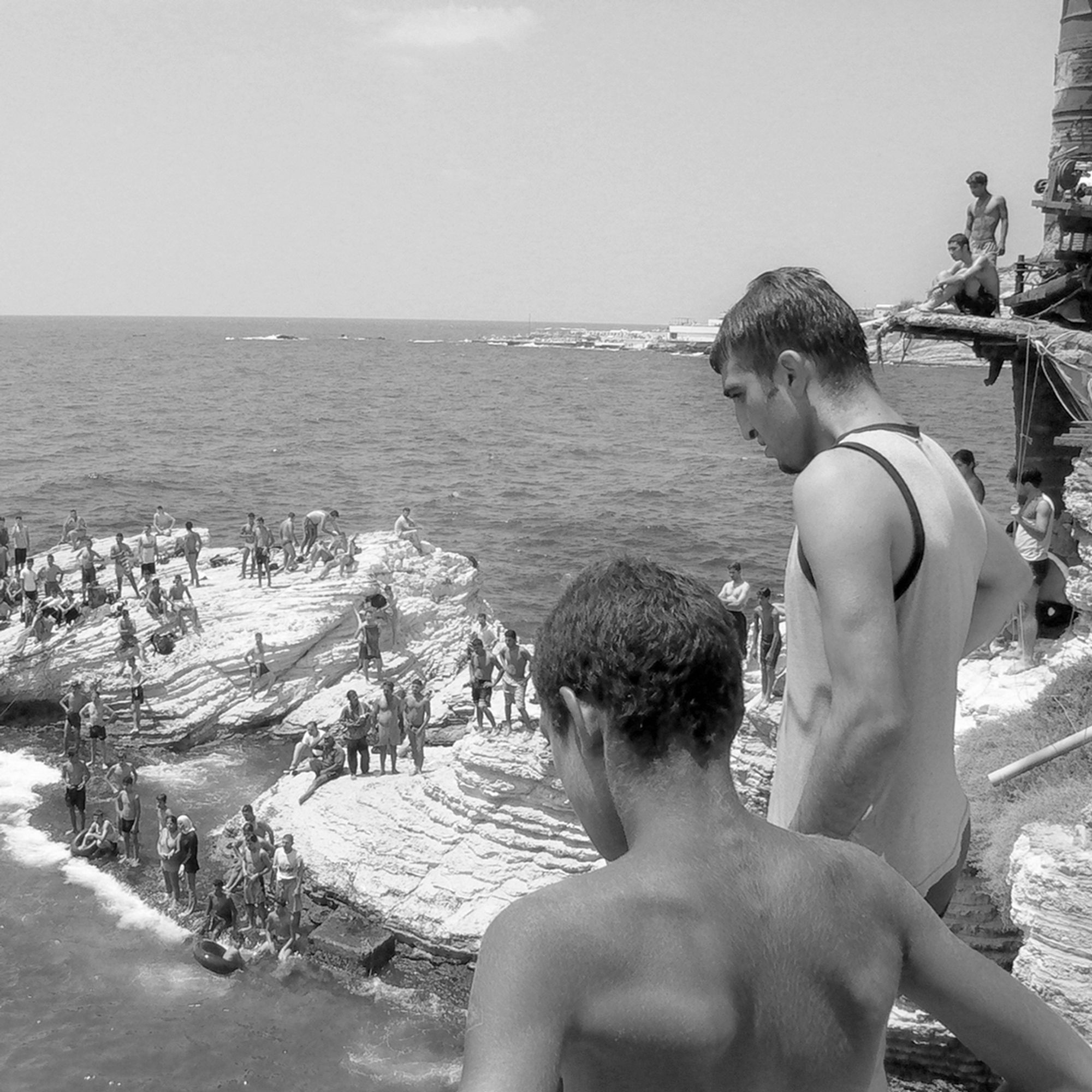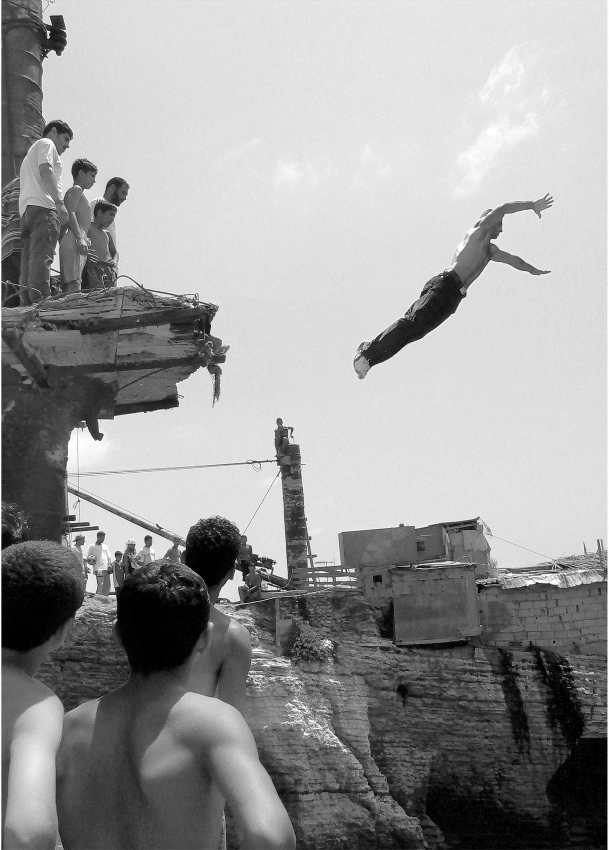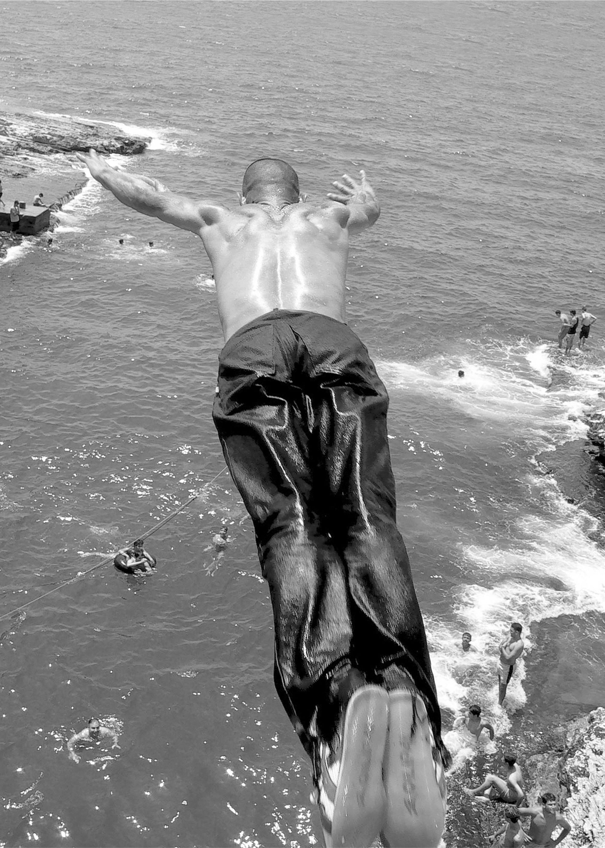 The Pigeons’ Rock is a natural landmark located at Beirut city’s westernmost tip. The two emblematic huge rock formations, which stand like gigantic sentinels, are surrounded by a rocky wasteland known as Dalieh. For decades, this vast terrain has acted as an ‘open access shared space’ for a wide variety of city dwellers. A community of swimmers, composed mainly of men, indulge in a hobby in which feat competes with exhibitionism.
