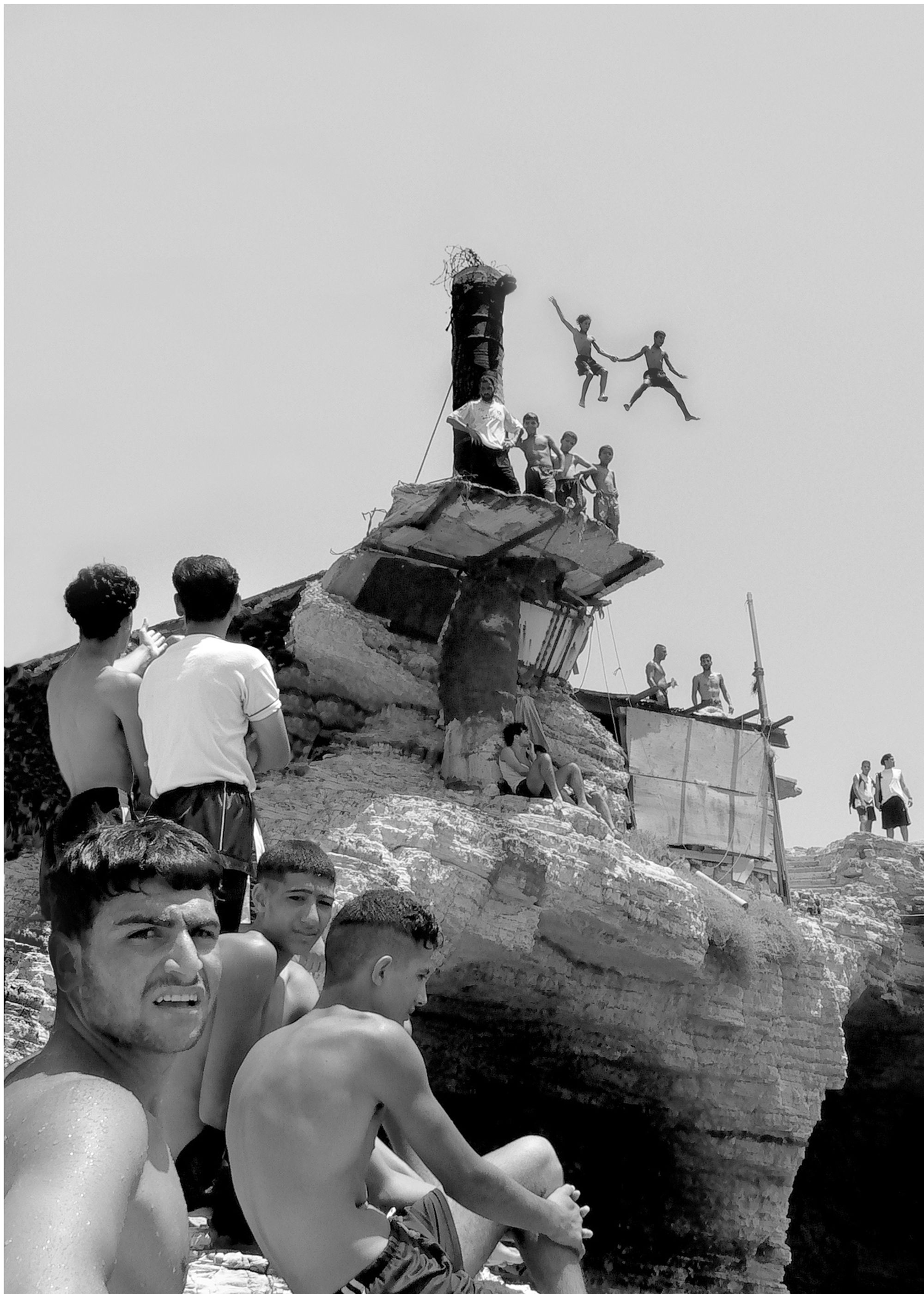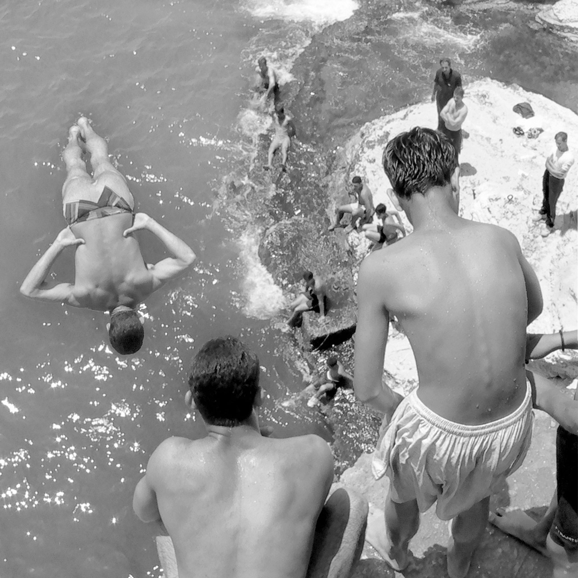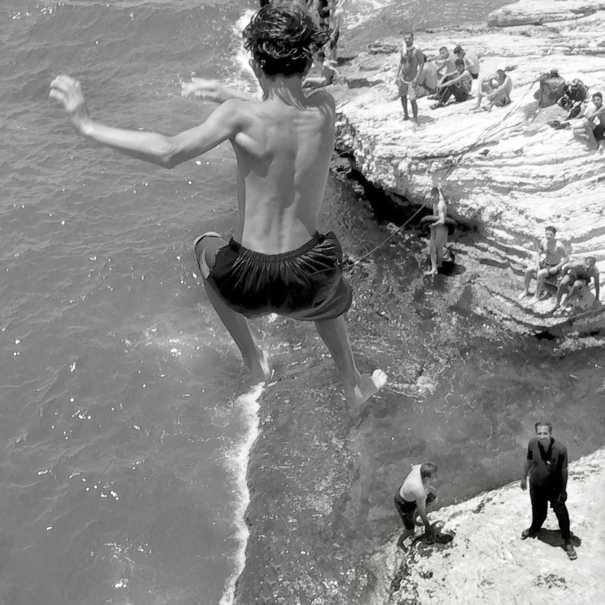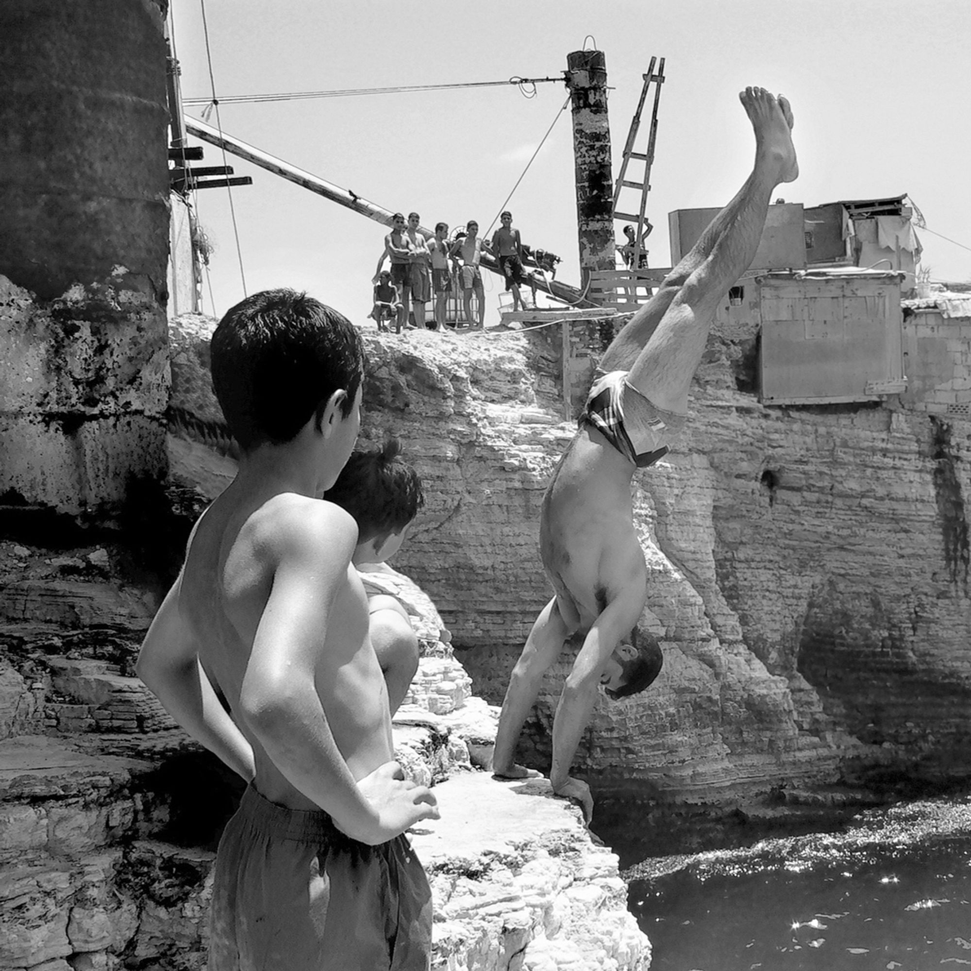 The Pigeons’ Rock is a natural landmark located at Beirut city’s westernmost tip. The two emblematic huge rock formations, which stand like gigantic sentinels, are surrounded by a rocky wasteland known as Dalieh. For decades, this vast terrain has acted as an ‘open access shared space’ for a wide variety of city dwellers. A community of swimmers, composed mainly of men, indulge in a hobby in which feat competes with exhibitionism.