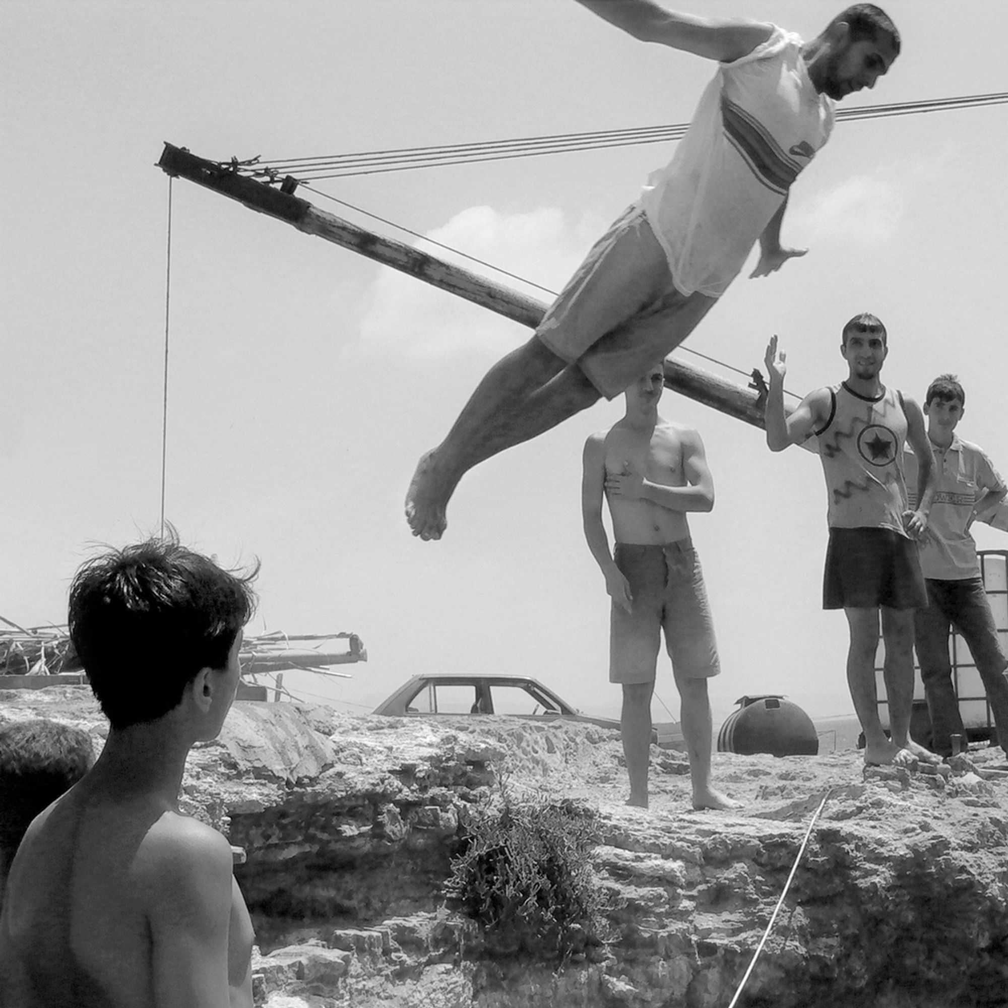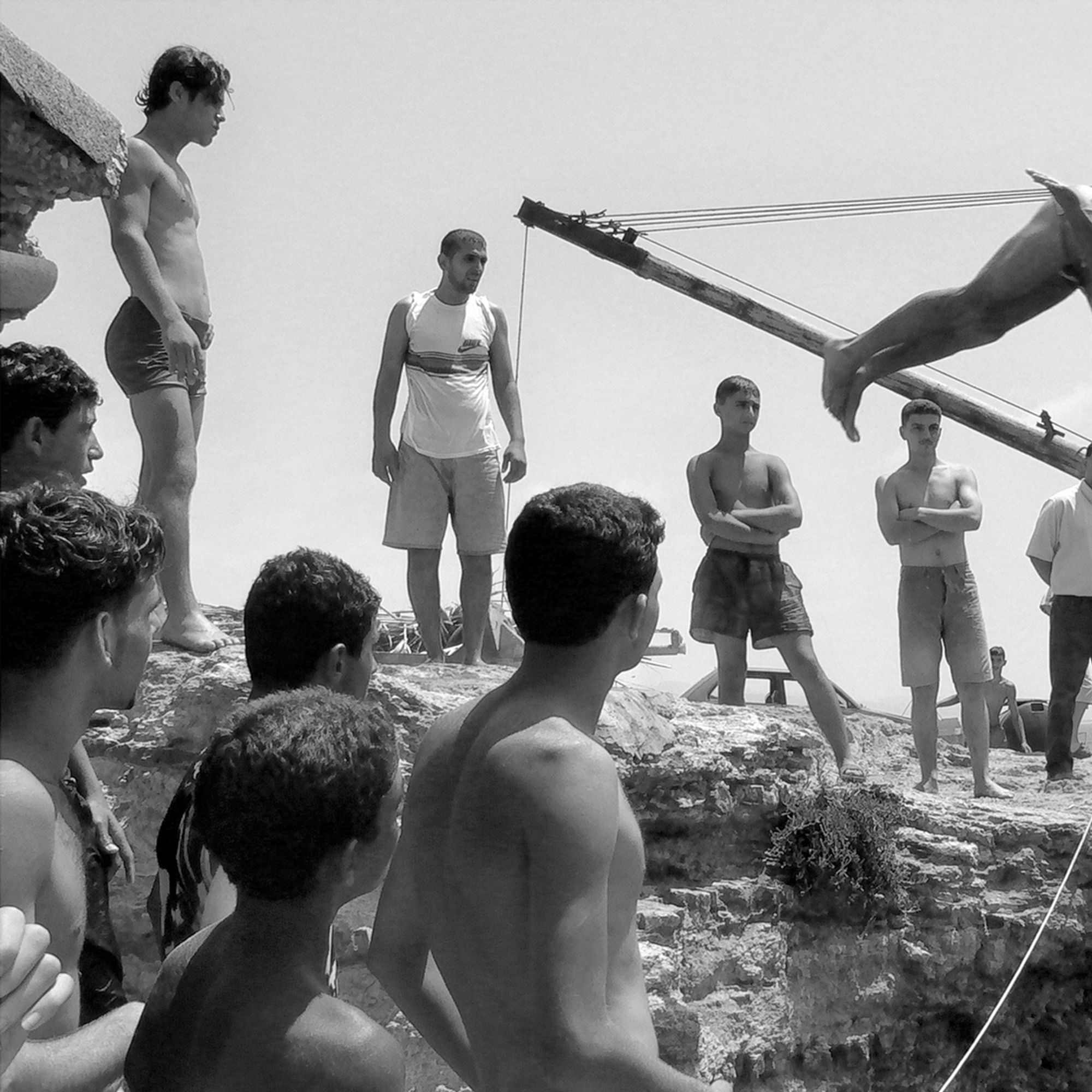 Randa Mirza’s photographs emphasis an exaggerated display of machismo that defines homosocial relations in patriarchal societies. The only woman taking part in the spectacle is behind the lens. The photographs embody a lurking paradox - the timelessness of Beirut in spite of the threat of development. Since summer 2014, rapid transformations have abruptly interrupted the social and economic life of Dalieh. A civil campaign was started against the privatization of this land which was initially titled "The last that remains".