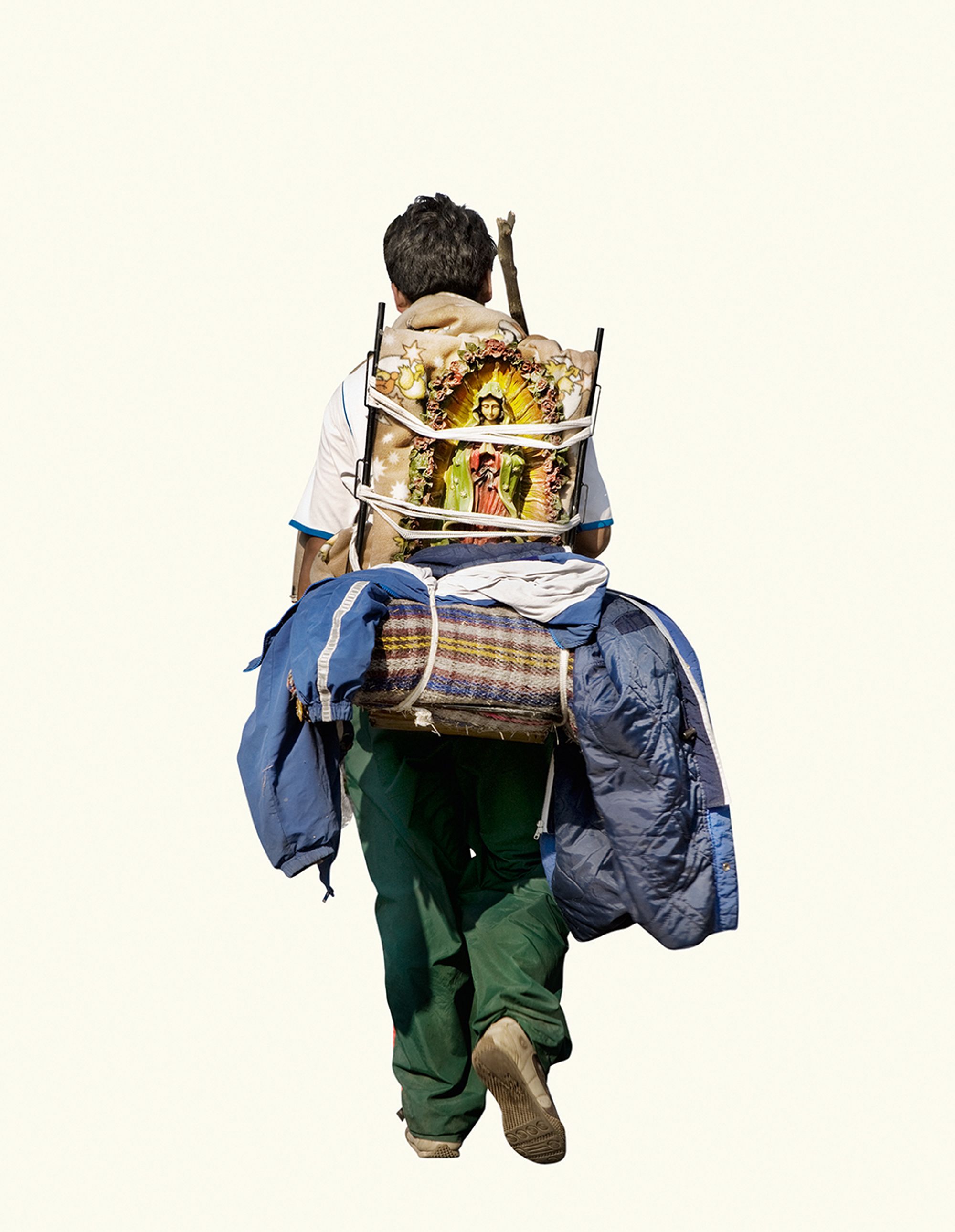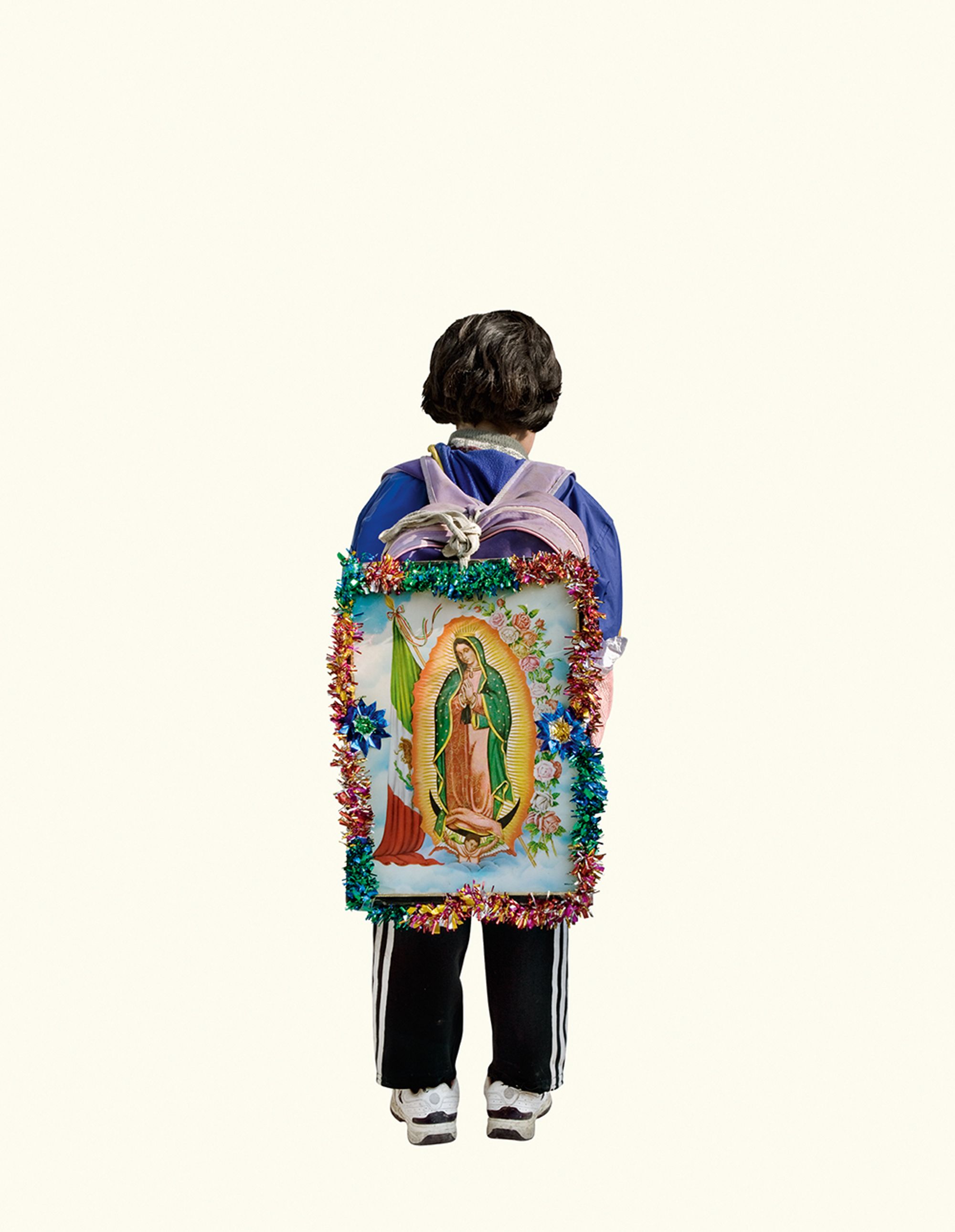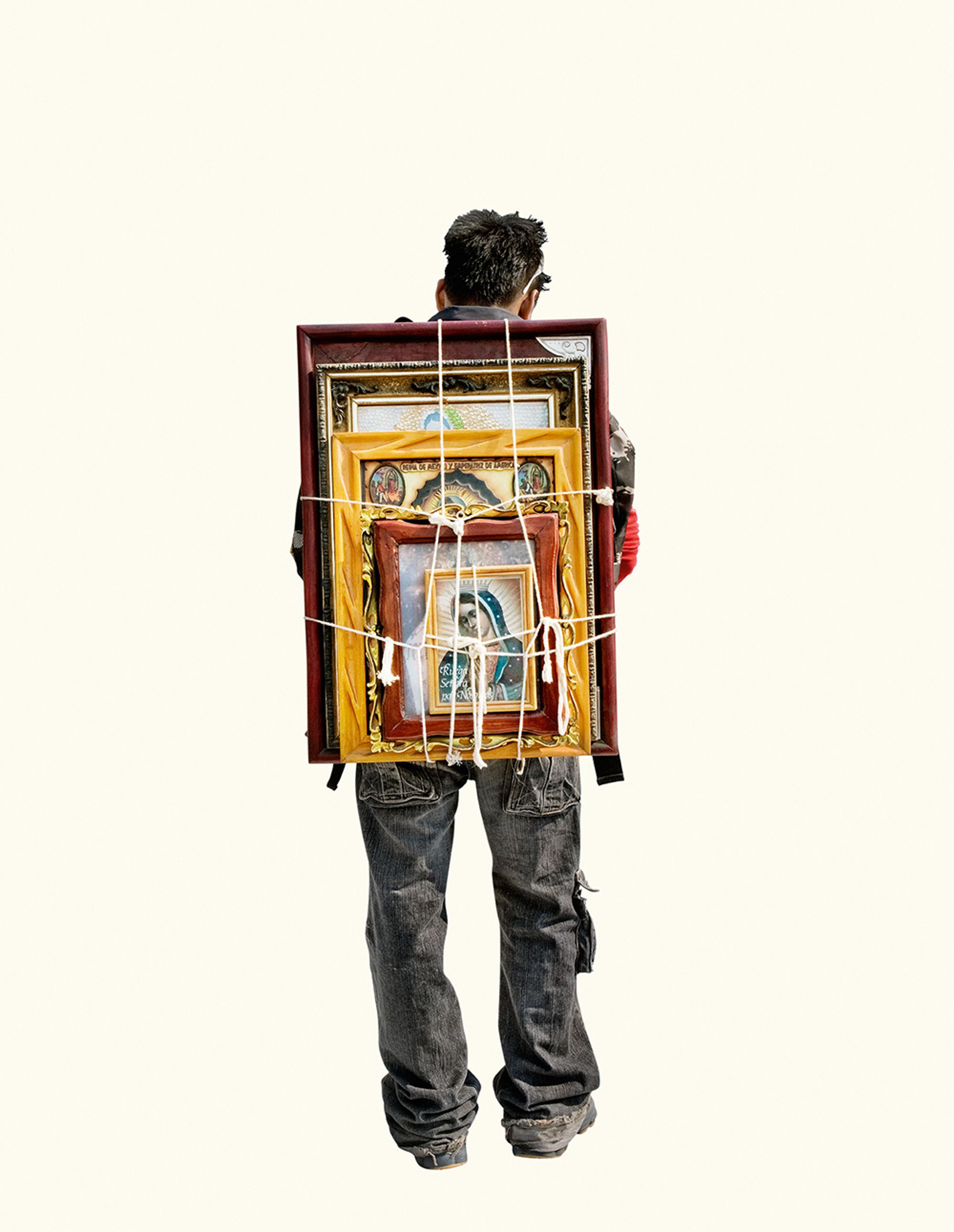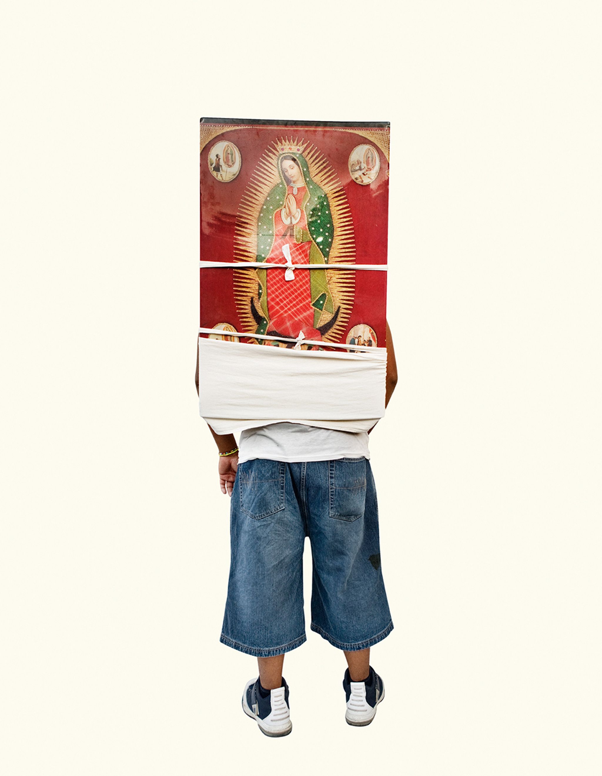 I was amazed by the seemingly infinite representations of the Virgin that devout followers were carrying. I was brought up in a secular home, so it led me to question the relationship between image and belief. Why have it? Why carry it for ten days to the original site? Why decorate it? I found the simple act of carrying a reproduction of the sacred image so rich with questions, that I decided to focus solely on photographing the backs of these pilgrims carrying images of the Virgin. The decontextualisation removes the visual pollution and allows for the three hundred images to be reintegrated in an immersive installation.