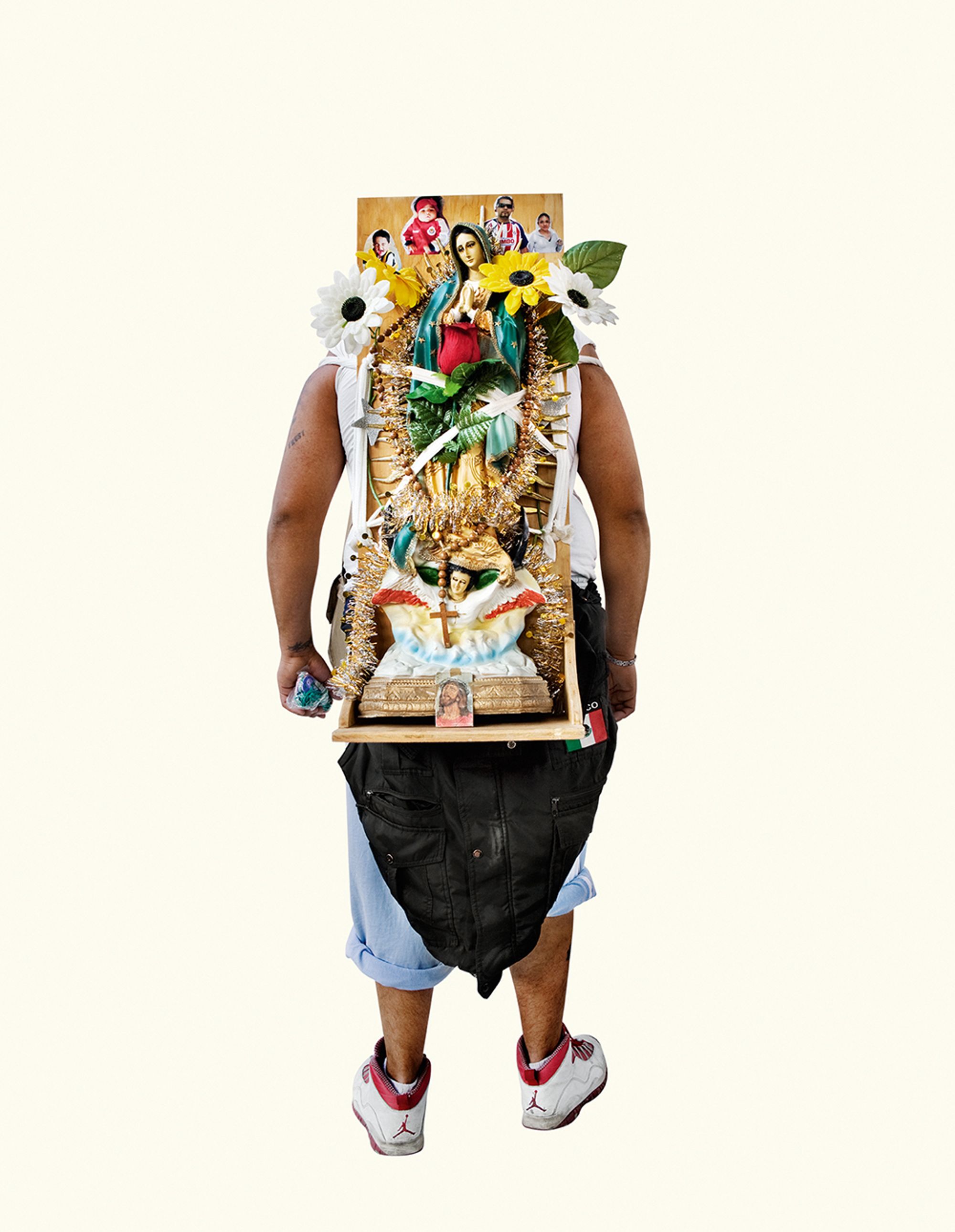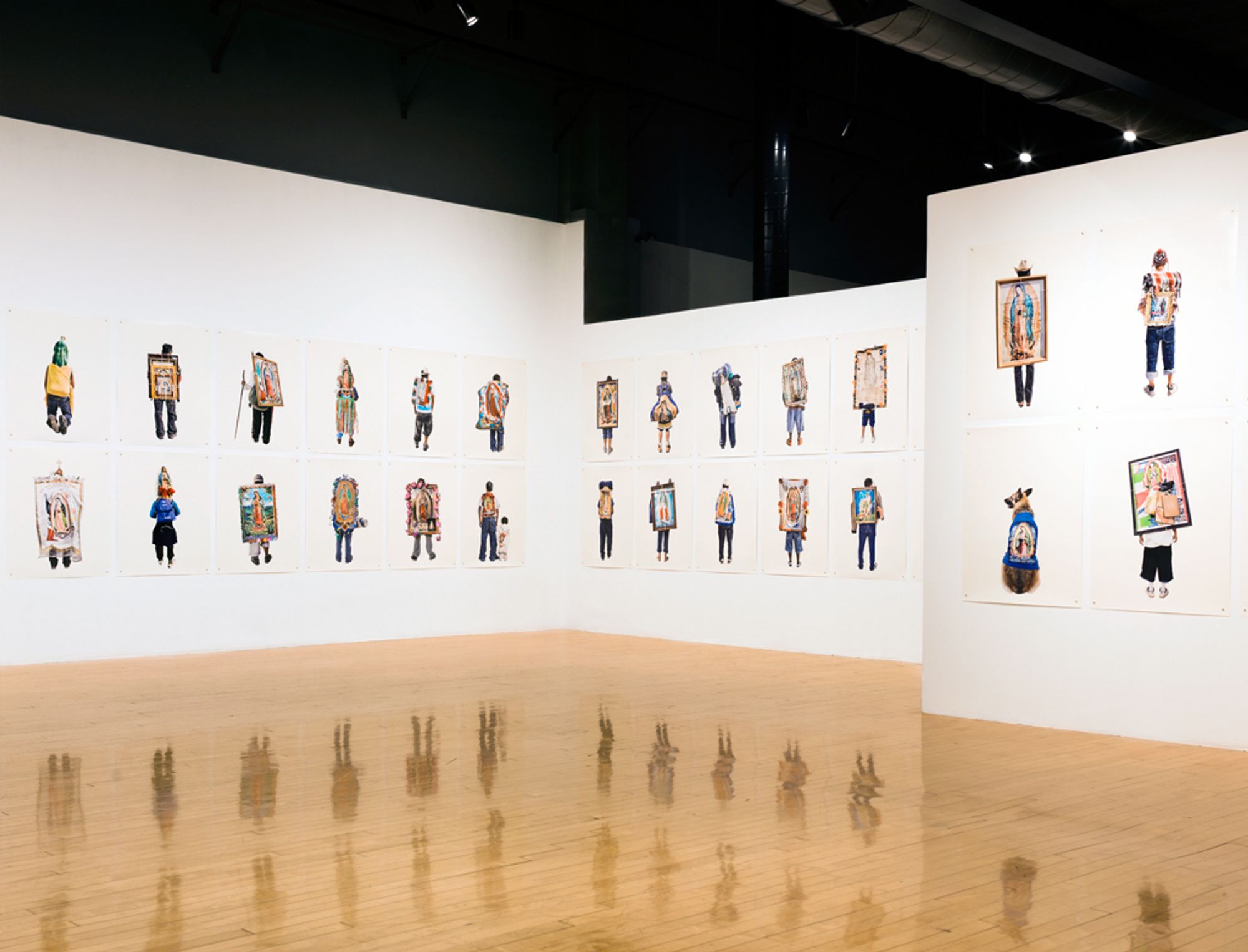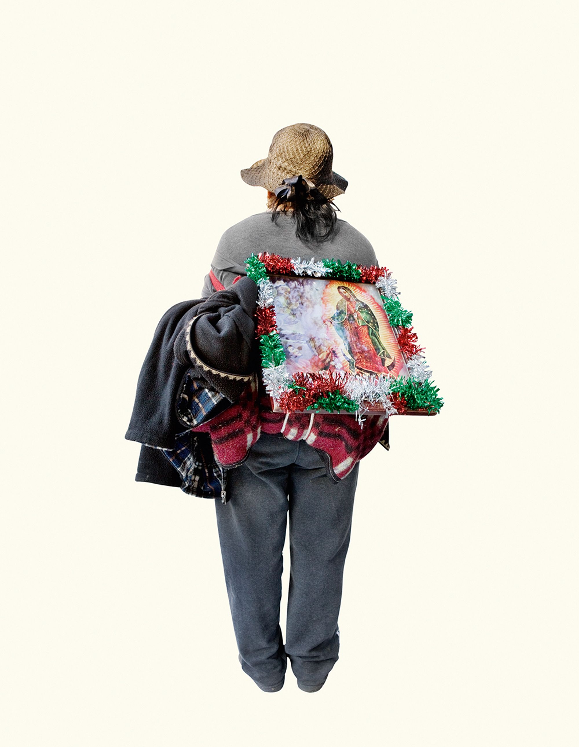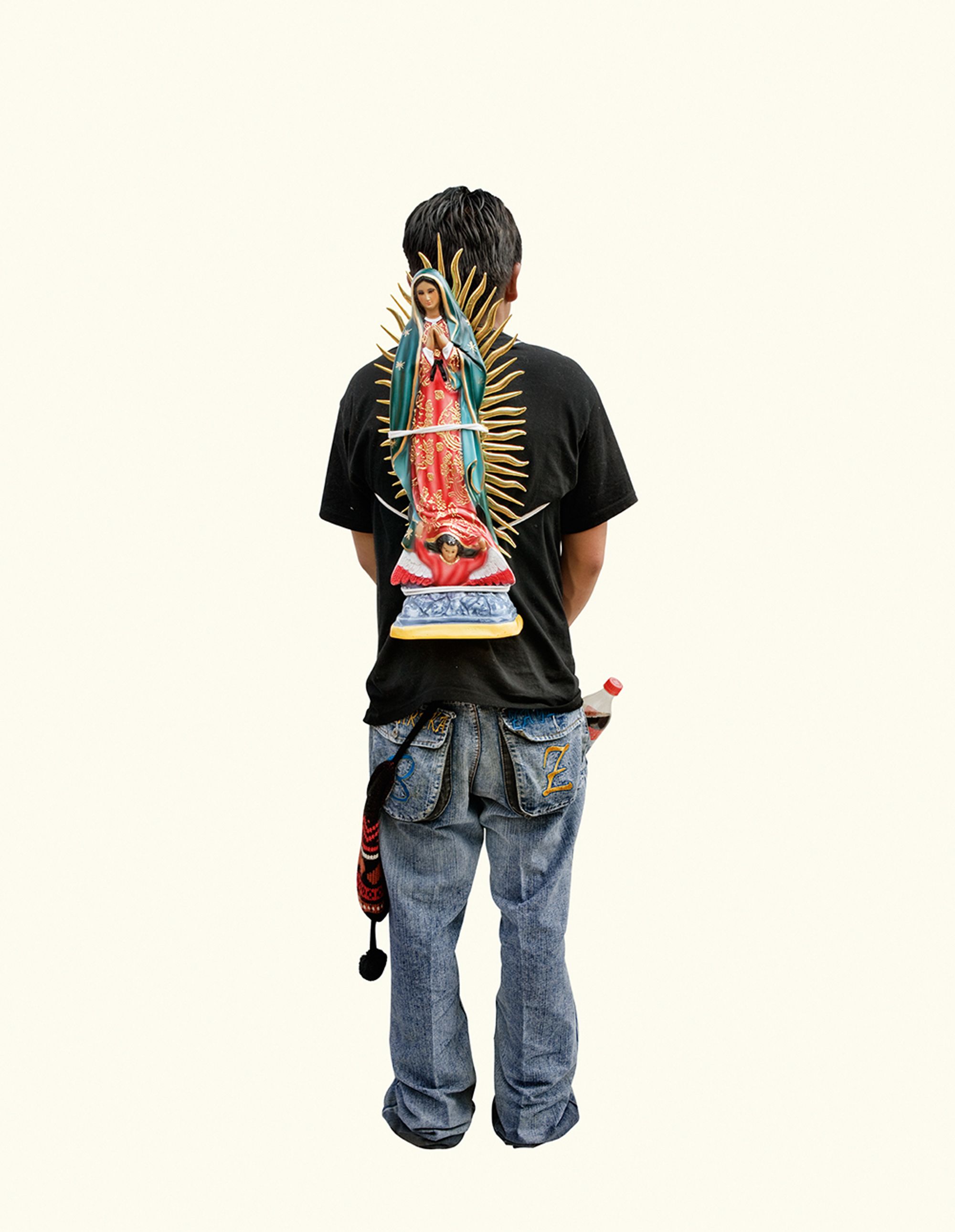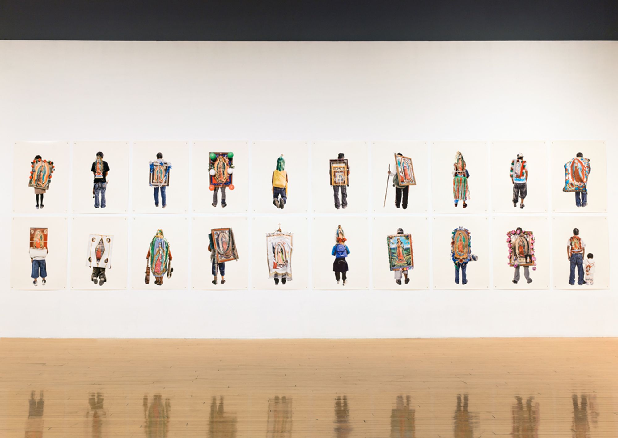 I was amazed by the seemingly infinite representations of the Virgin that devout followers were carrying. I was brought up in a secular home, so it led me to question the relationship between image and belief. Why have it? Why carry it for ten days to the original site? Why decorate it? I found the simple act of carrying a reproduction of the sacred image so rich with questions, that I decided to focus solely on photographing the backs of these pilgrims carrying images of the Virgin. The decontextualisation removes the visual pollution and allows for the three hundred images to be reintegrated in an immersive installation.