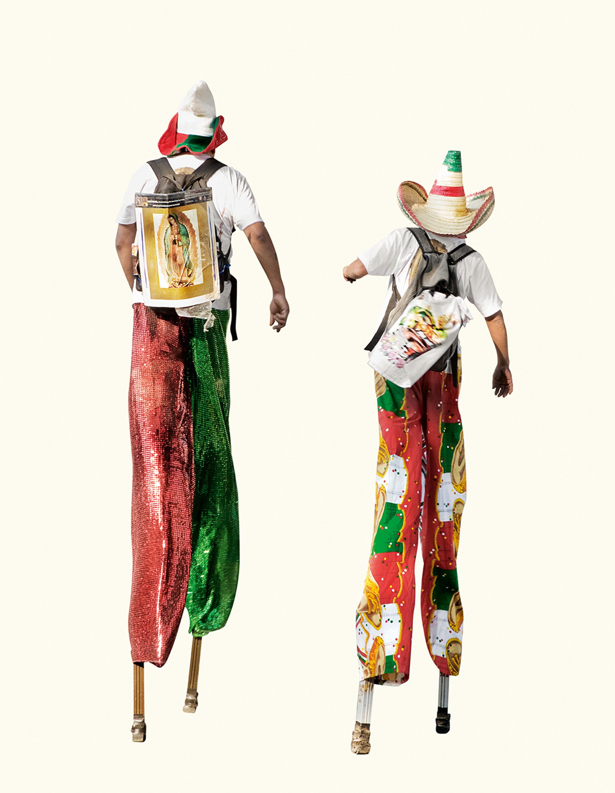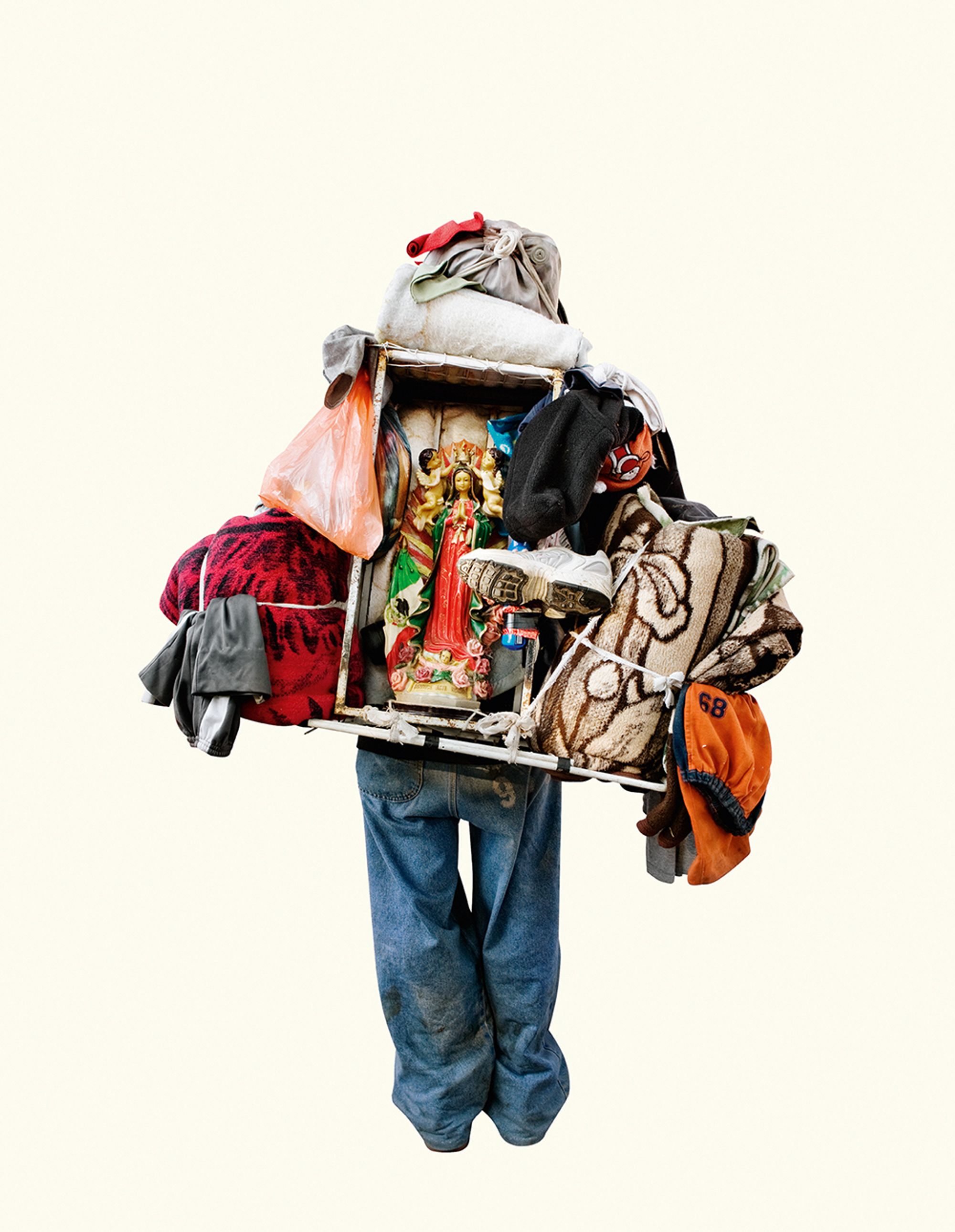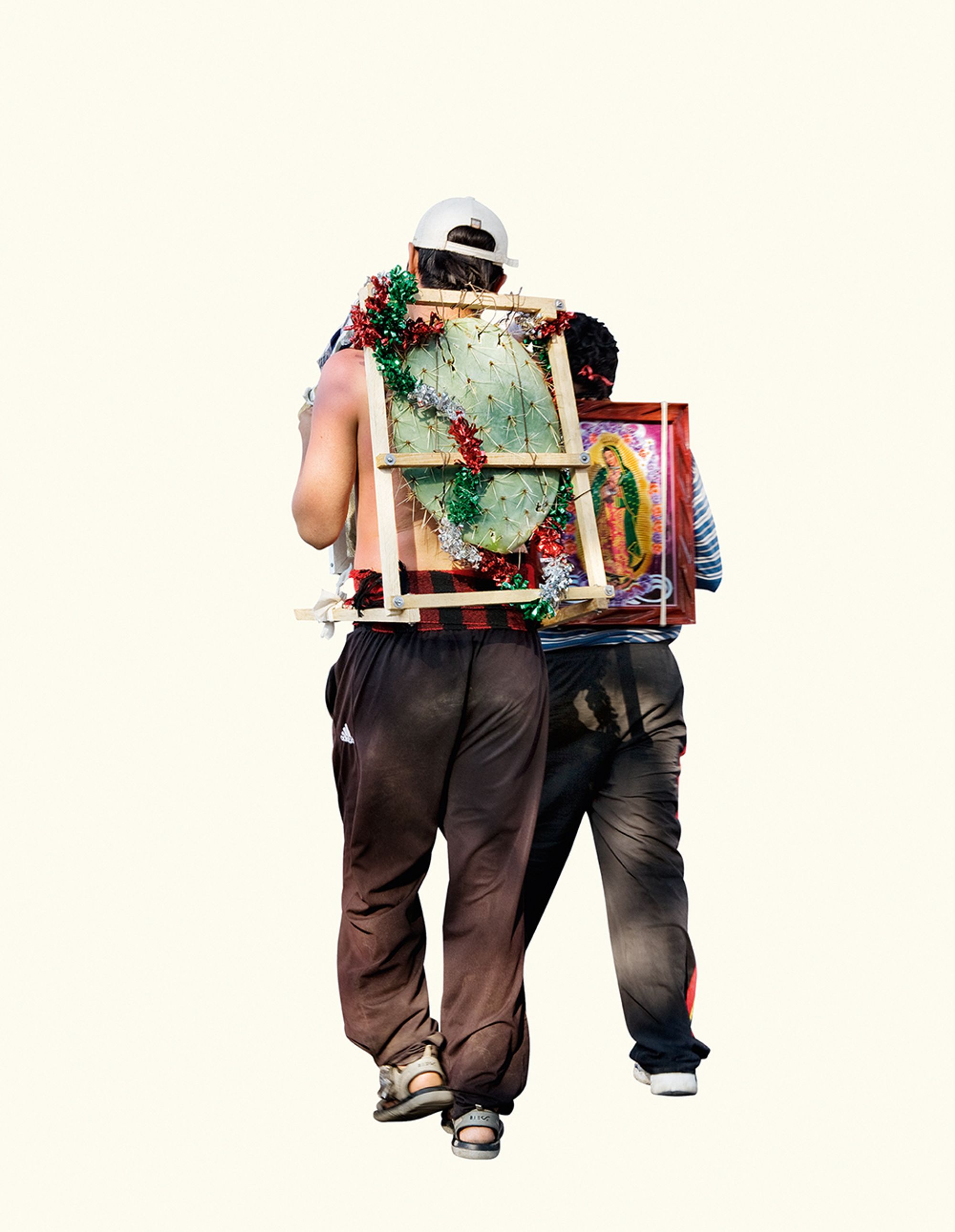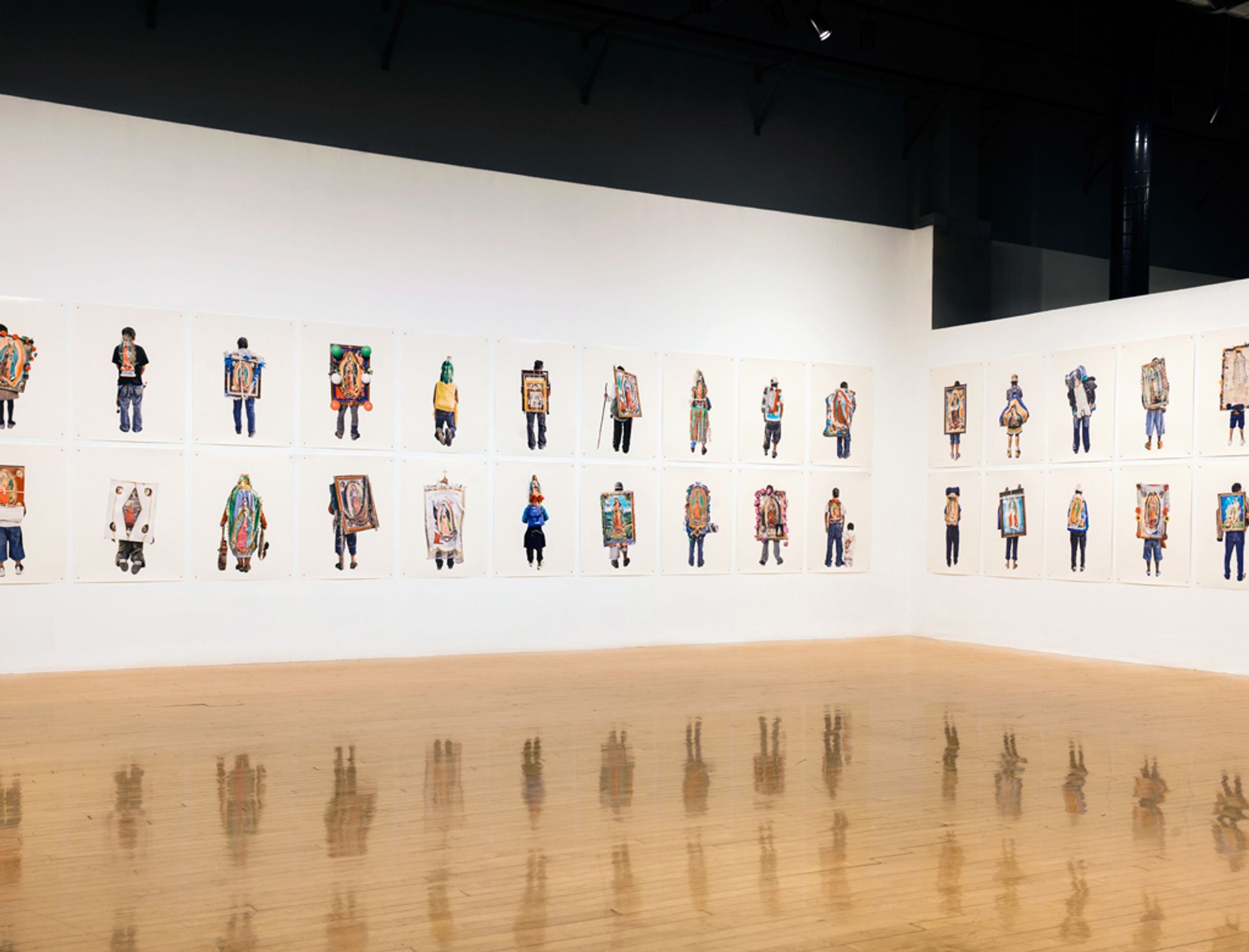 I was amazed by the seemingly infinite representations of the Virgin that devout followers were carrying. I was brought up in a secular home, so it led me to question the relationship between image and belief. Why have it? Why carry it for ten days to the original site? Why decorate it? I found the simple act of carrying a reproduction of the sacred image so rich with questions, that I decided to focus solely on photographing the backs of these pilgrims carrying images of the Virgin. The decontextualisation removes the visual pollution and allows for the three hundred images to be reintegrated in an immersive installation.