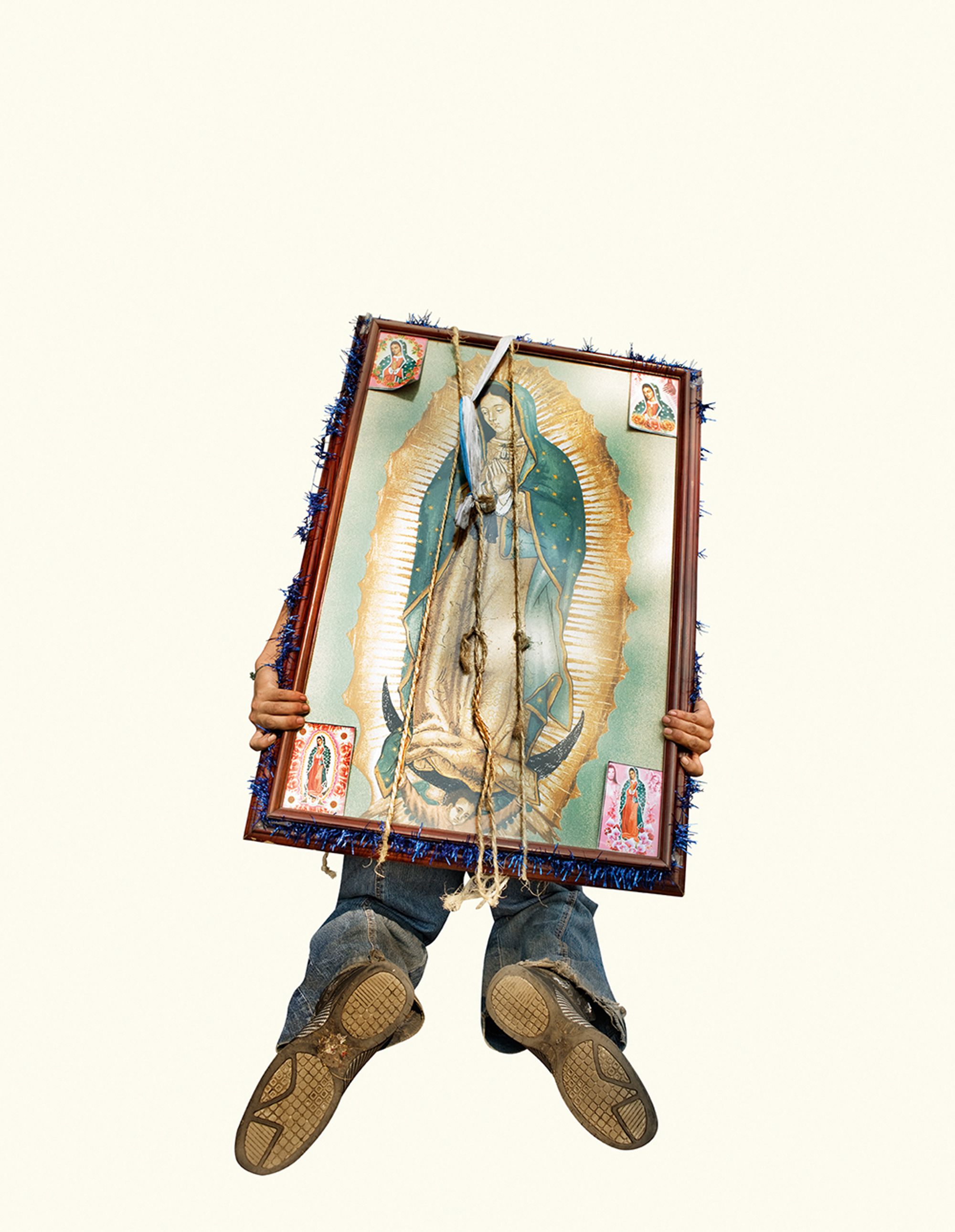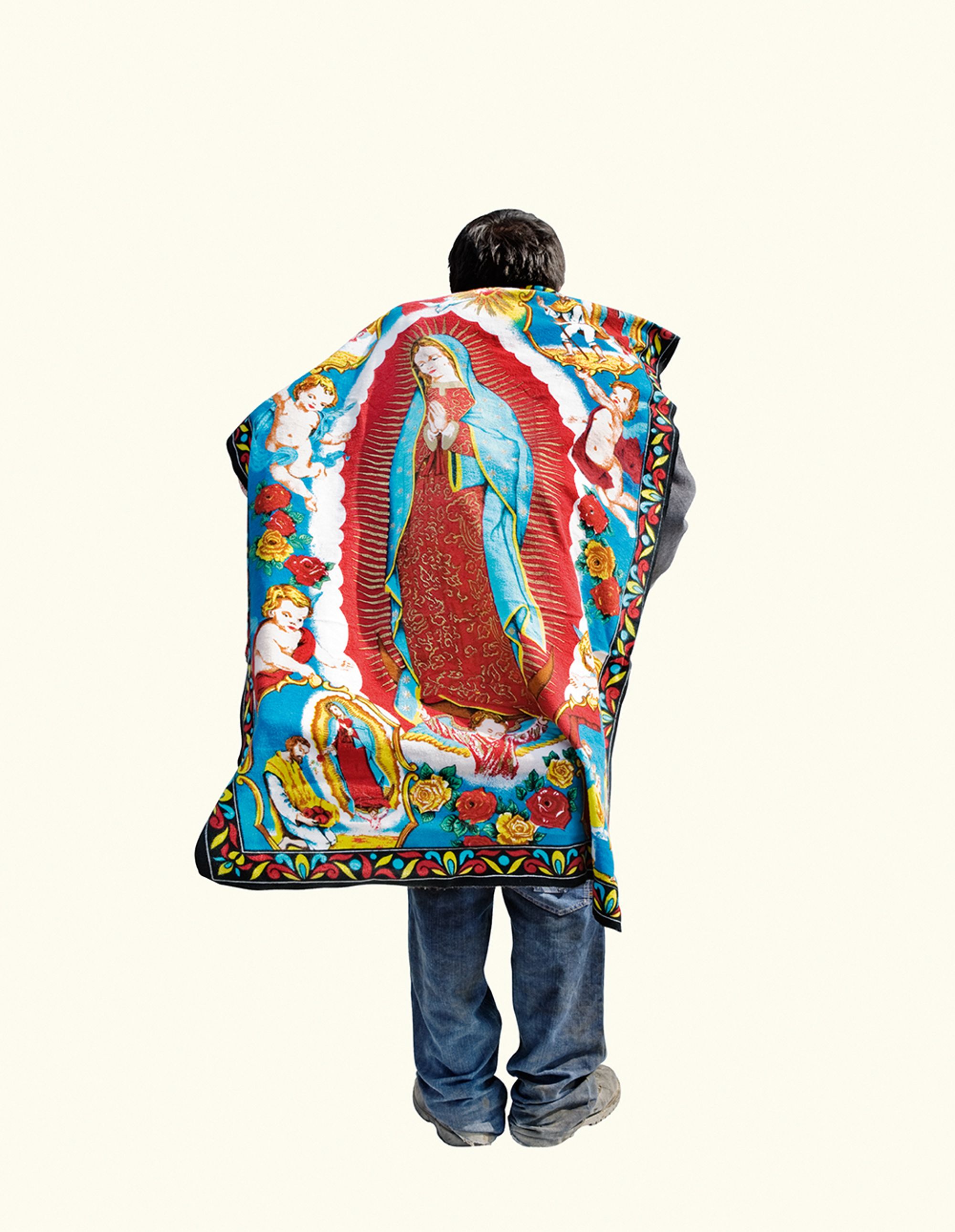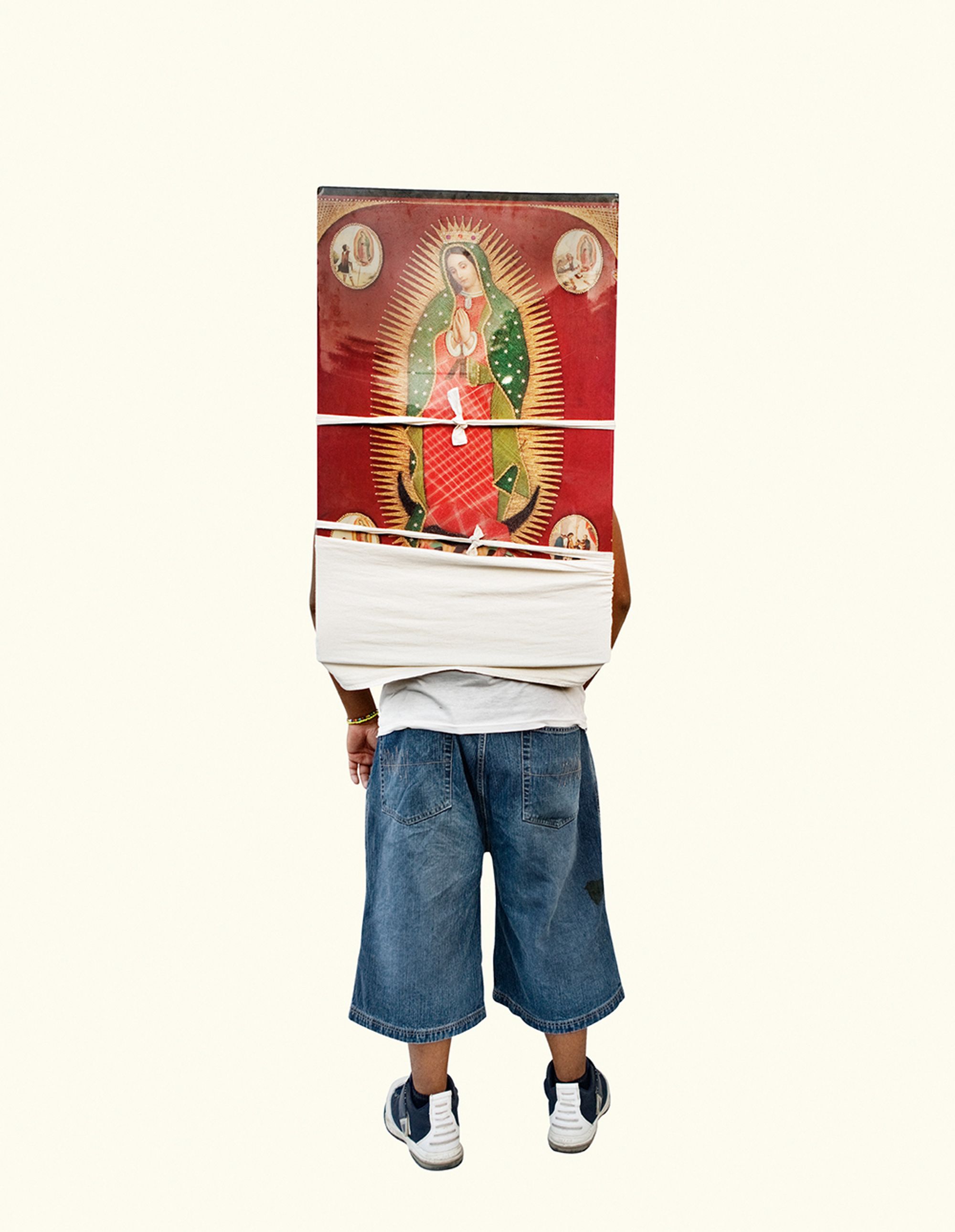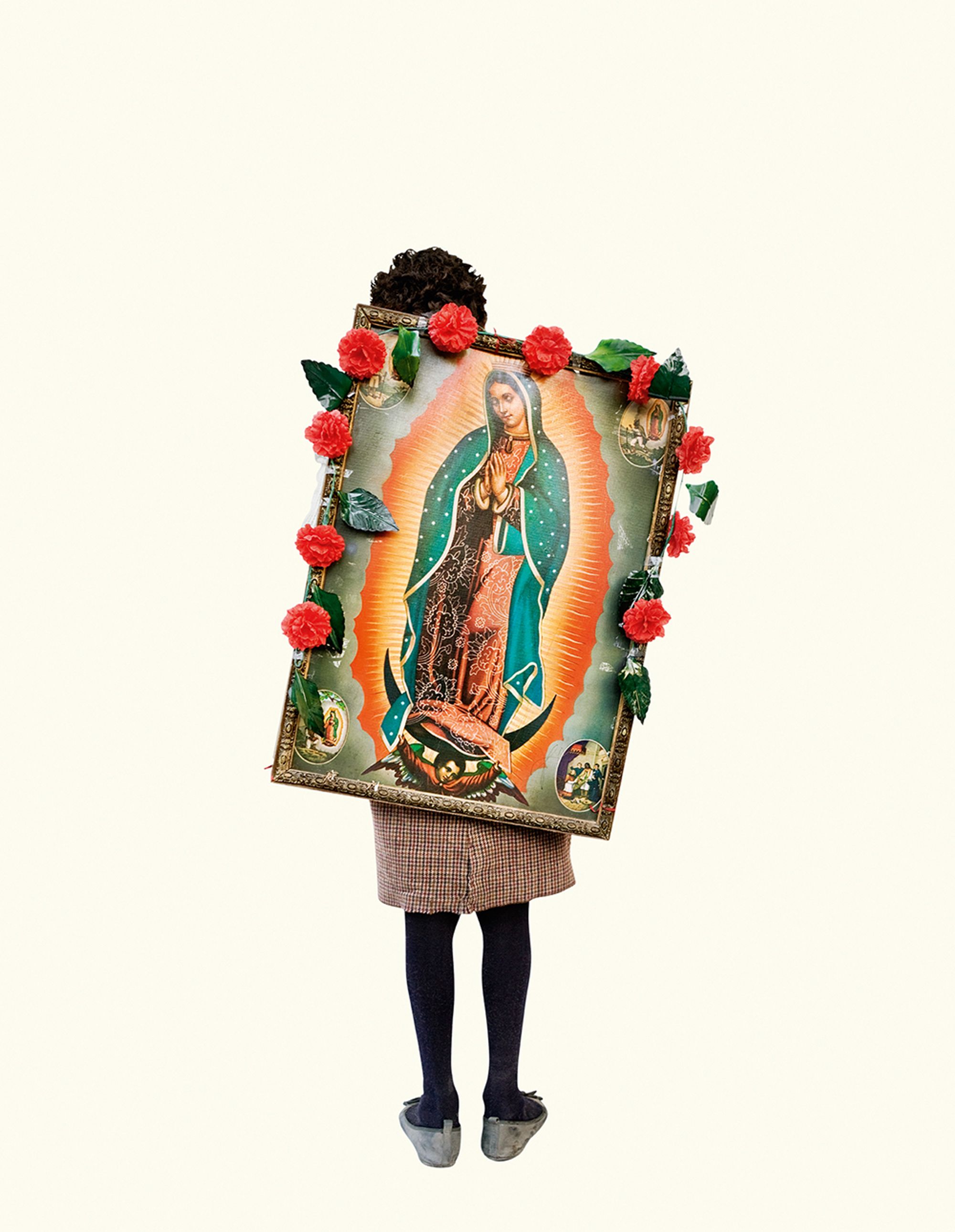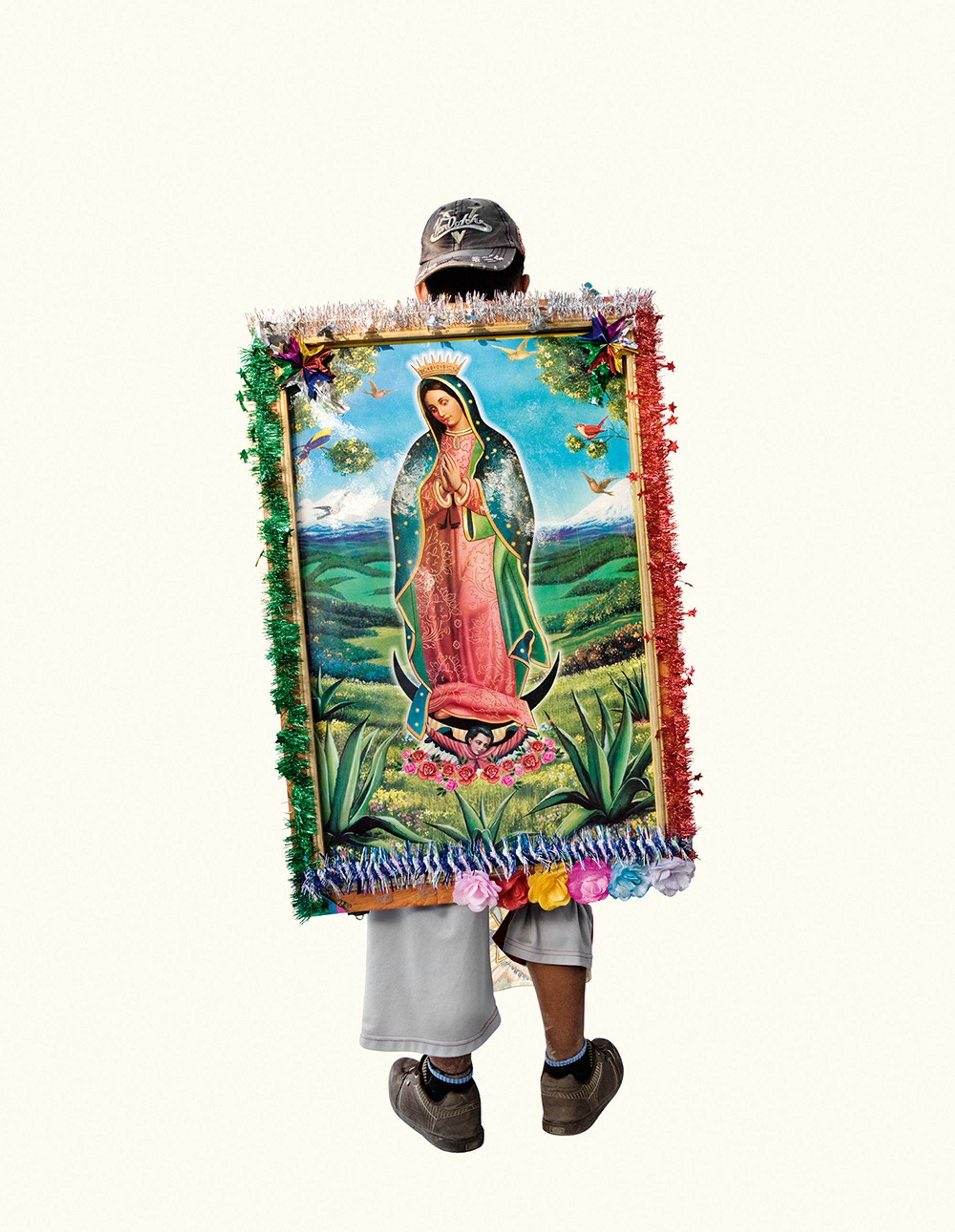 The project began after a visit to the Basilica de Guadalupe in Mexico City during the anniversary of the apparition of the Virgin. Approximately 8 million pilgrims visit the site over 4 days. The story of the apparition follows that the Virgin appeared five times before an indigenous man, Juan Diego in 1531 at the ancient site of the Aztec Goddess Tonantzin. His testimony was not enough to convince the priest that she had appeared before him, so the Virgin told him to collect roses from the hill and take them to the bishop. He collected the roses, carried them under his tunic, and when he unravelled the cloth to reveal the roses to the bishop, the image of the Virgin had imprinted itself onto his cloak. This original, miraculous image is said to be the one that is hanging in the Basilica.