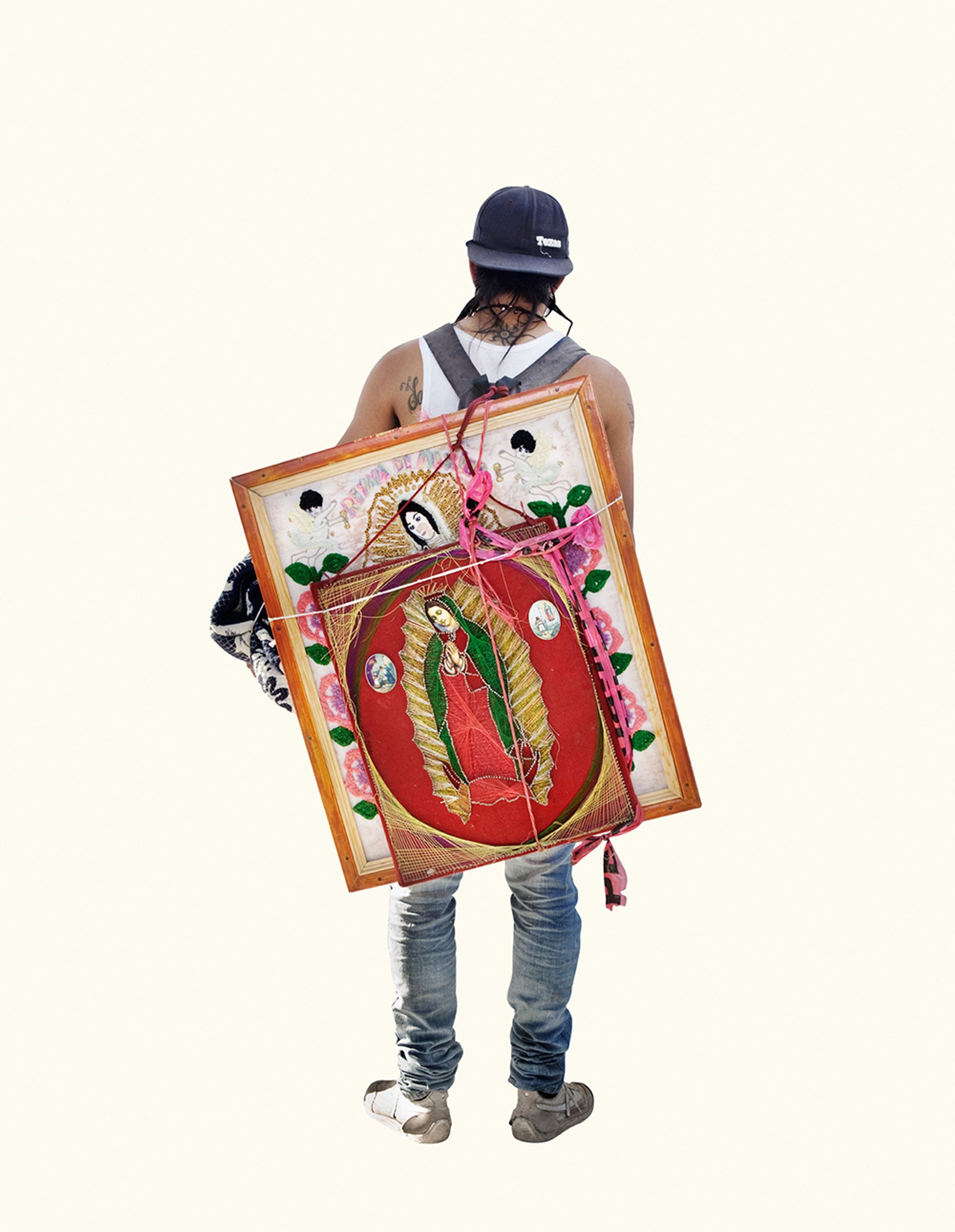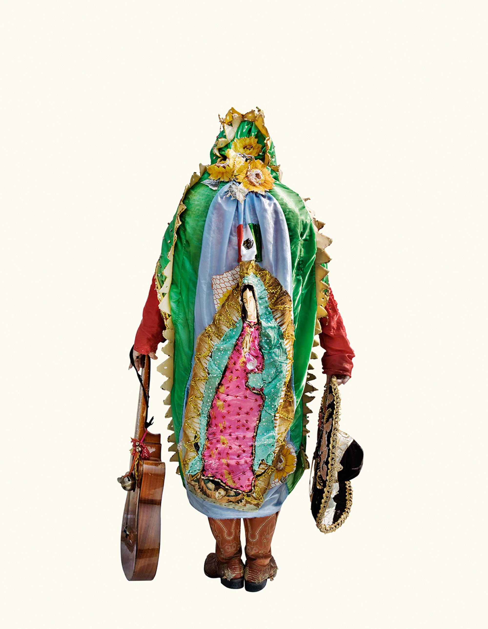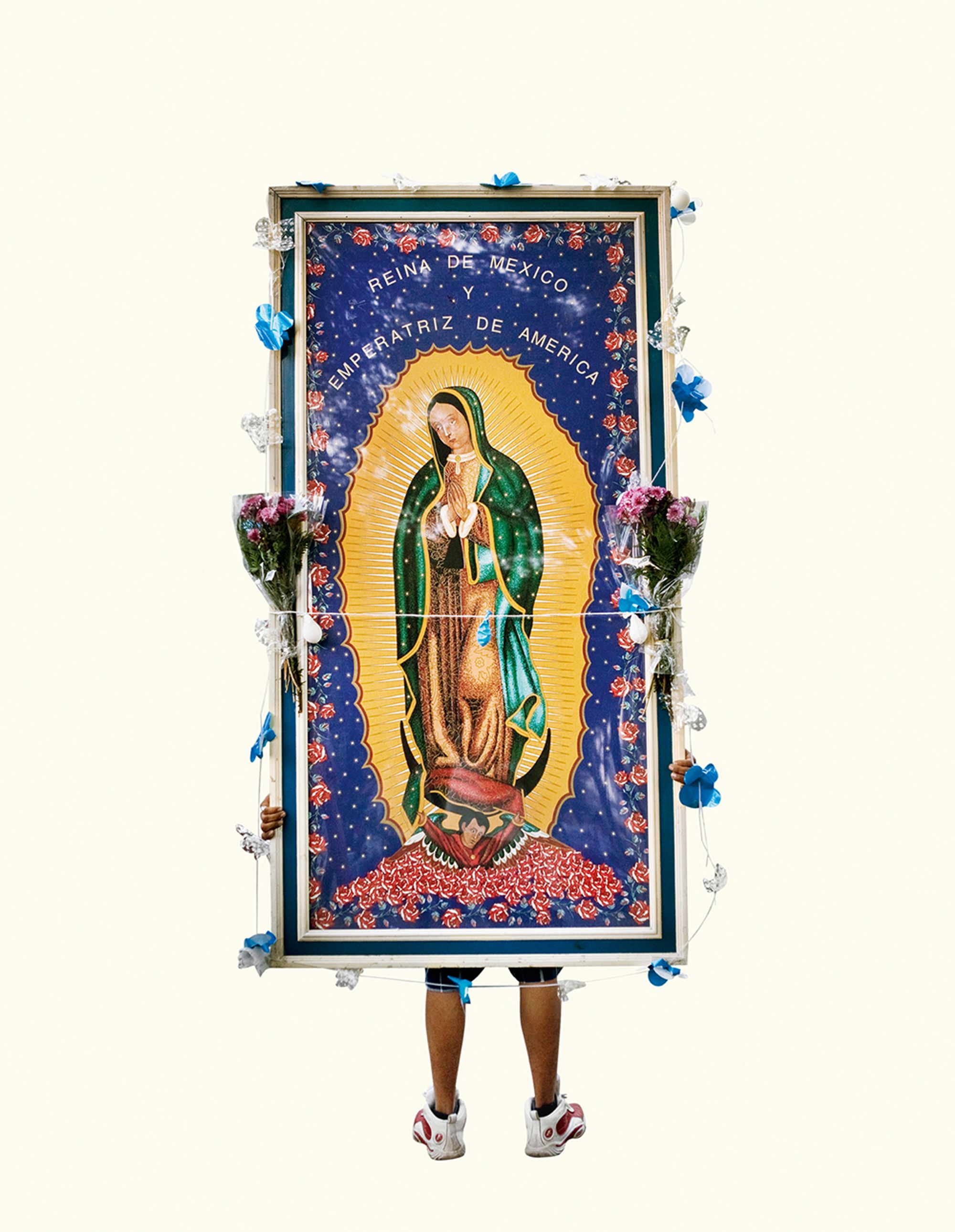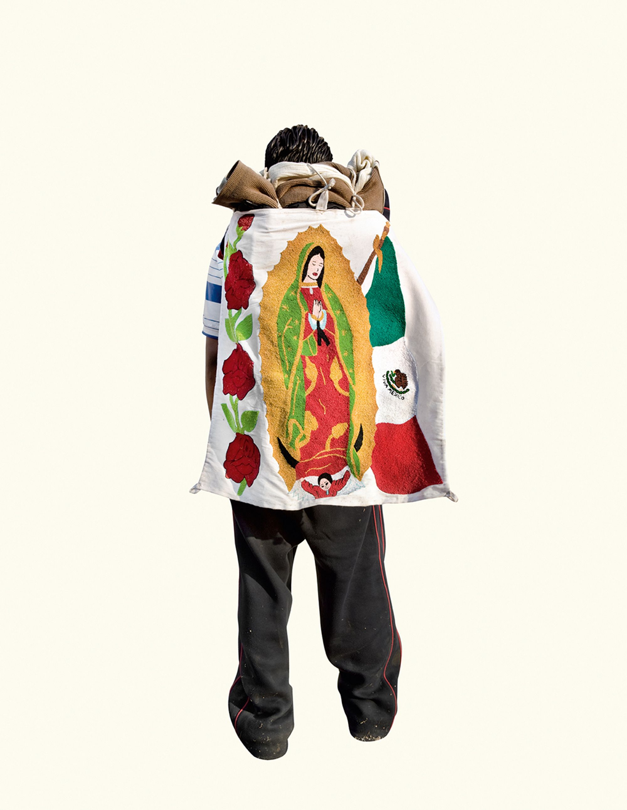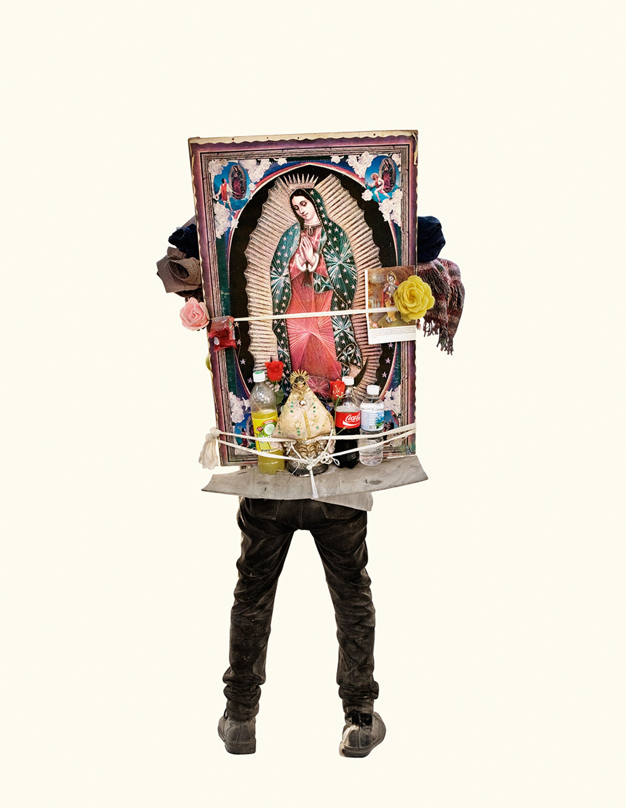 The project began after a visit to the Basilica de Guadalupe in Mexico City during the anniversary of the apparition of the Virgin. Approximately 8 million pilgrims visit the site over 4 days. The story of the apparition follows that the Virgin appeared five times before an indigenous man, Juan Diego in 1531 at the ancient site of the Aztec Goddess Tonantzin. His testimony was not enough to convince the priest that she had appeared before him, so the Virgin told him to collect roses from the hill and take them to the bishop. He collected the roses, carried them under his tunic, and when he unravelled the cloth to reveal the roses to the bishop, the image of the Virgin had imprinted itself onto his cloak. This original, miraculous image is said to be the one that is hanging in the Basilica.