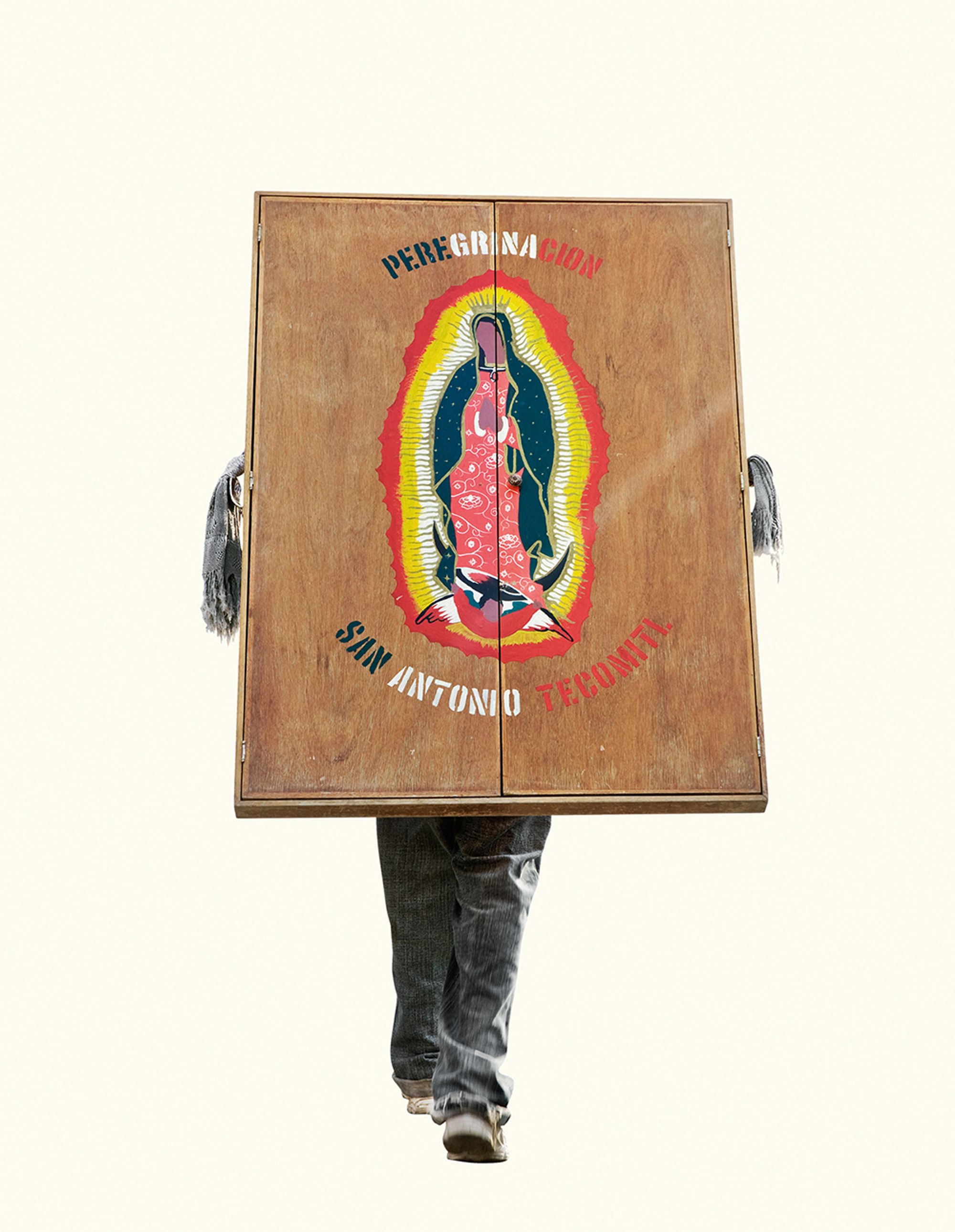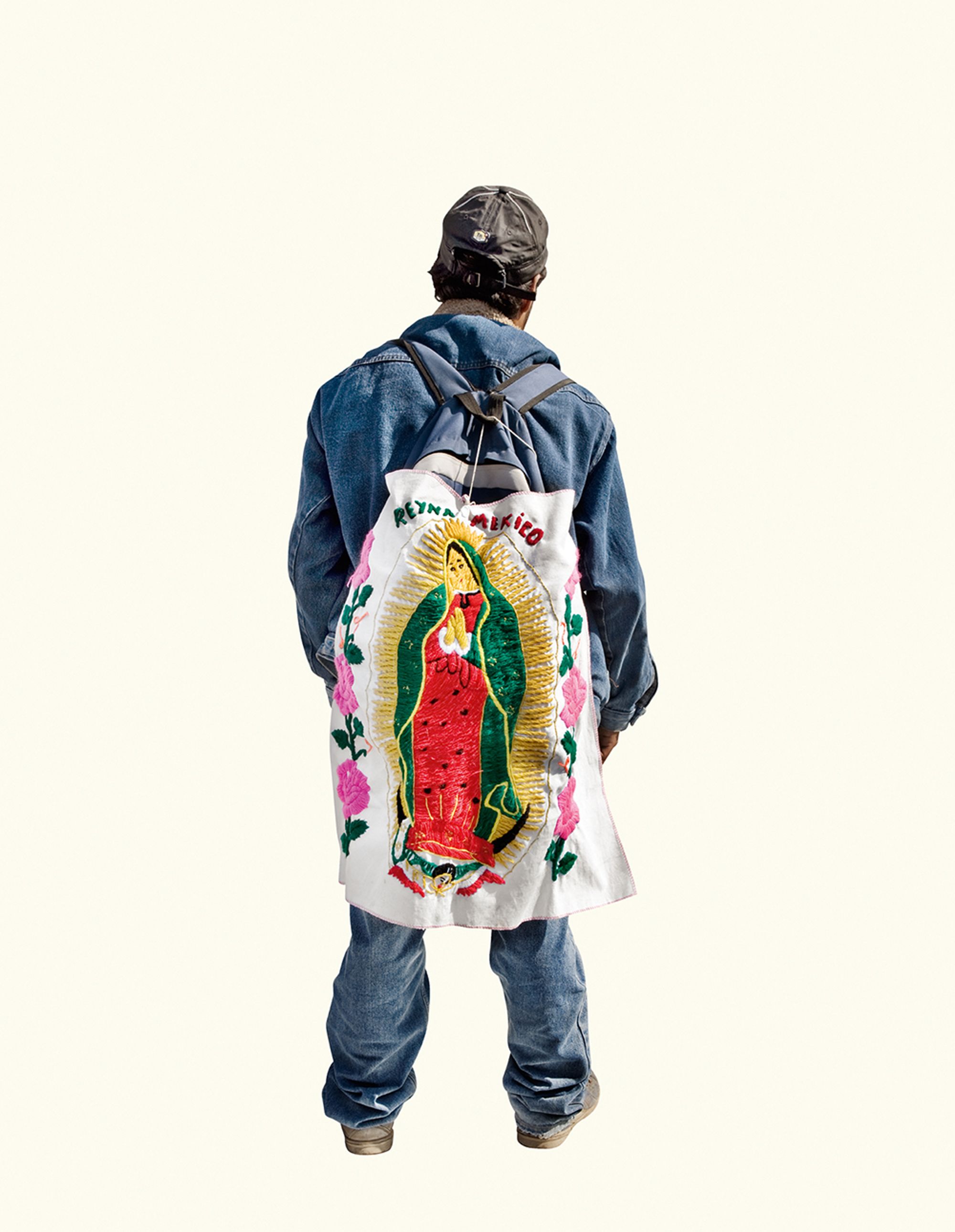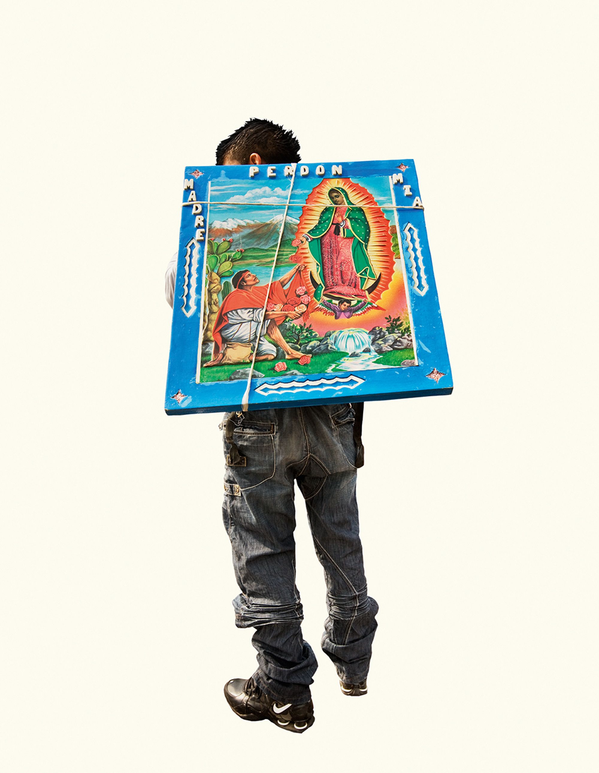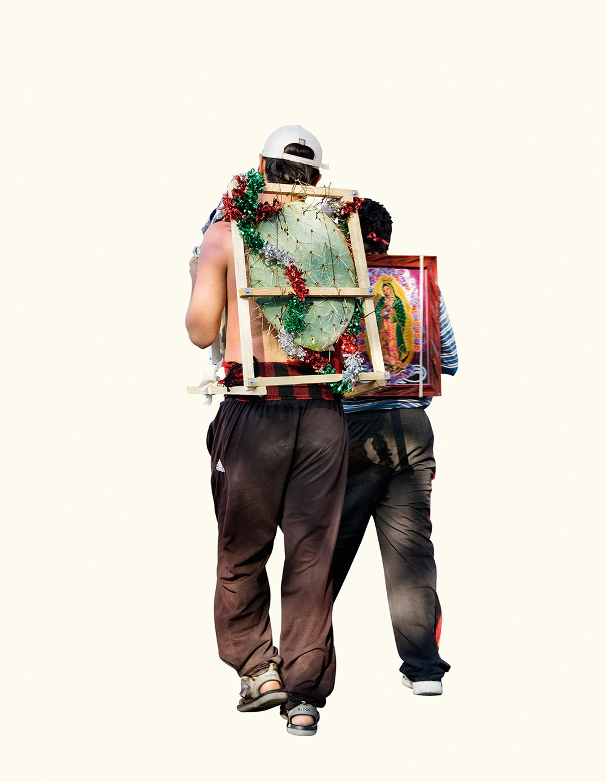 The project began after a visit to the Basilica de Guadalupe in Mexico City during the anniversary of the apparition of the Virgin. Approximately 8 million pilgrims visit the site over 4 days. The story of the apparition follows that the Virgin appeared five times before an indigenous man, Juan Diego in 1531 at the ancient site of the Aztec Goddess Tonantzin. His testimony was not enough to convince the priest that she had appeared before him, so the Virgin told him to collect roses from the hill and take them to the bishop. He collected the roses, carried them under his tunic, and when he unravelled the cloth to reveal the roses to the bishop, the image of the Virgin had imprinted itself onto his cloak. This original, miraculous image is said to be the one that is hanging in the Basilica.