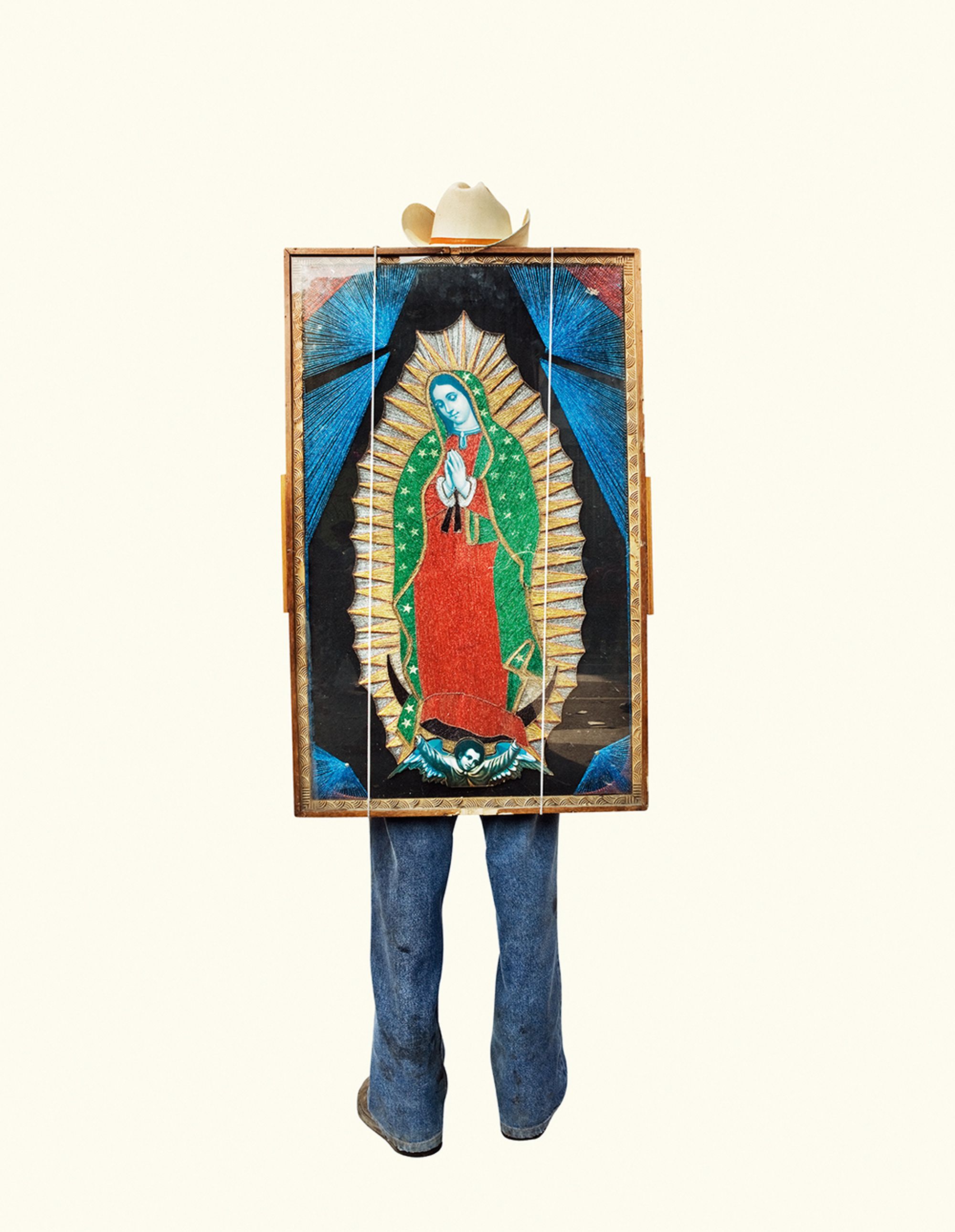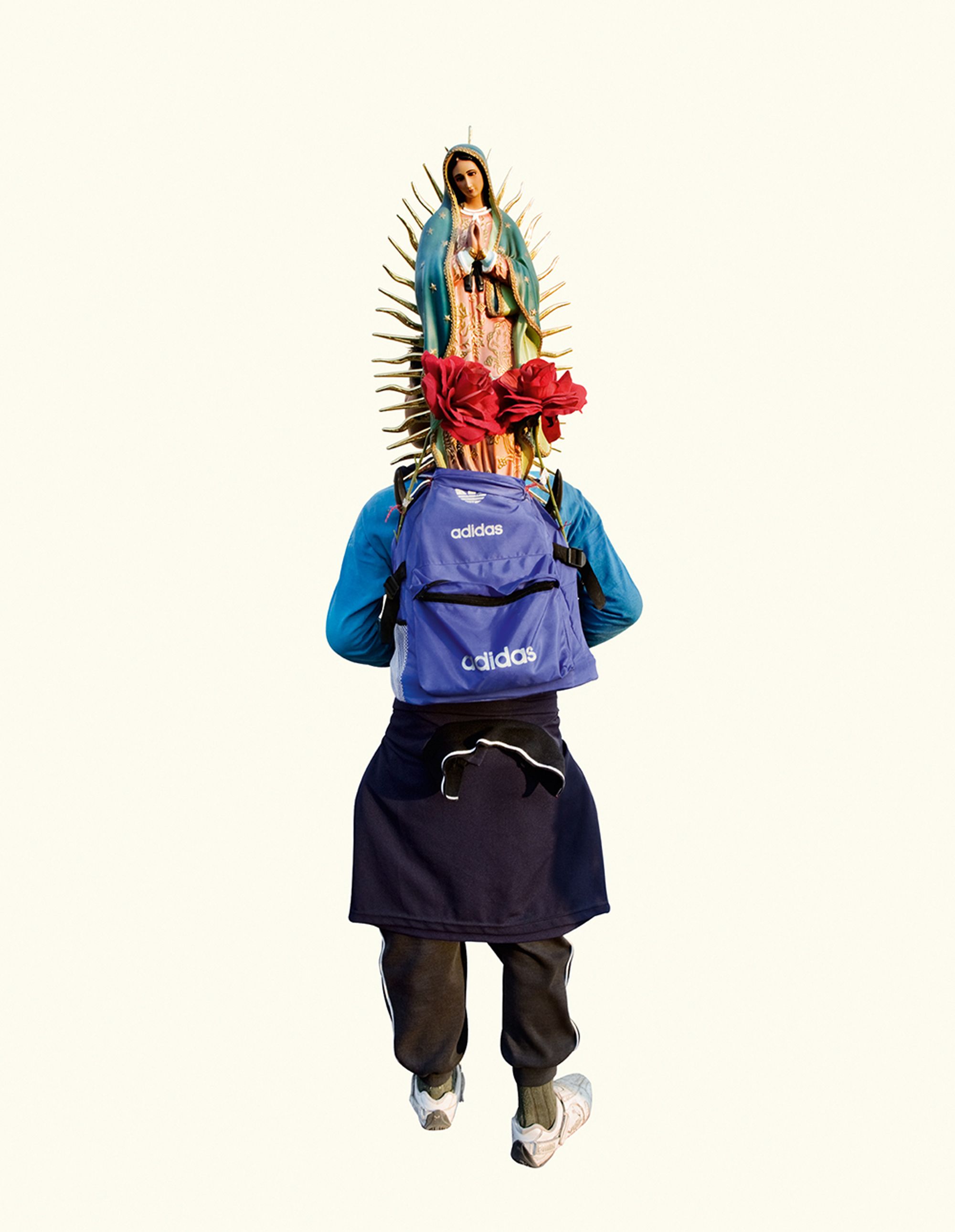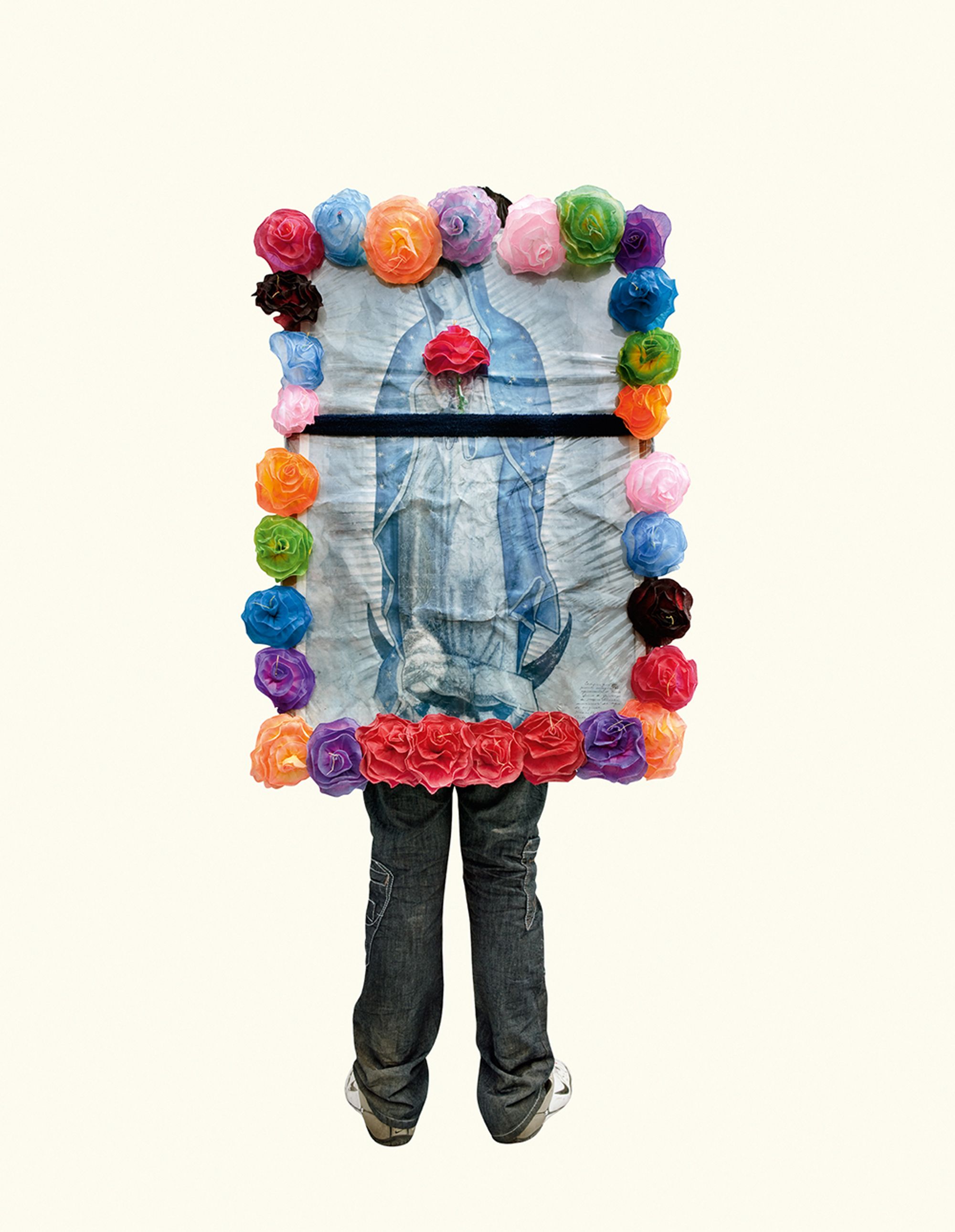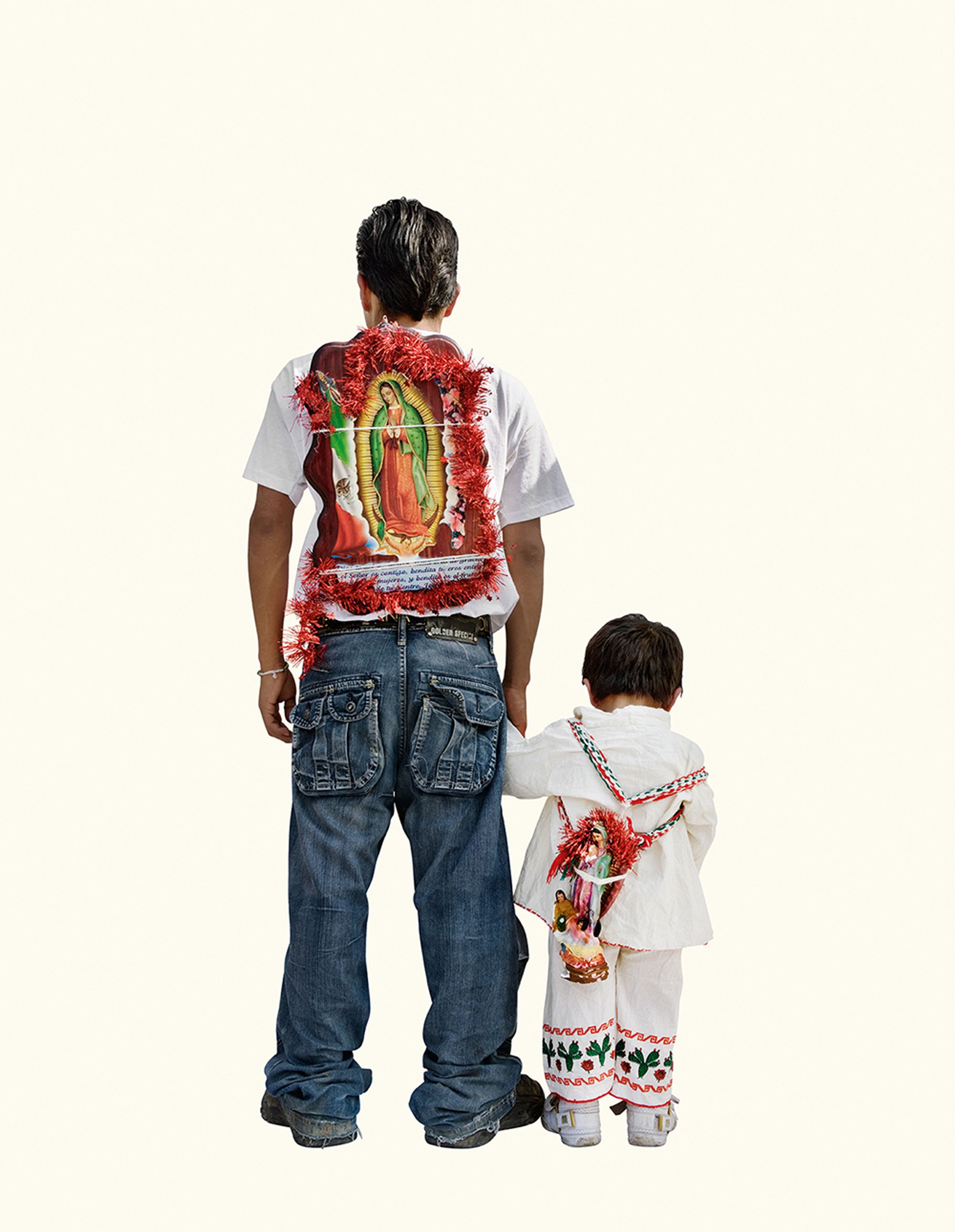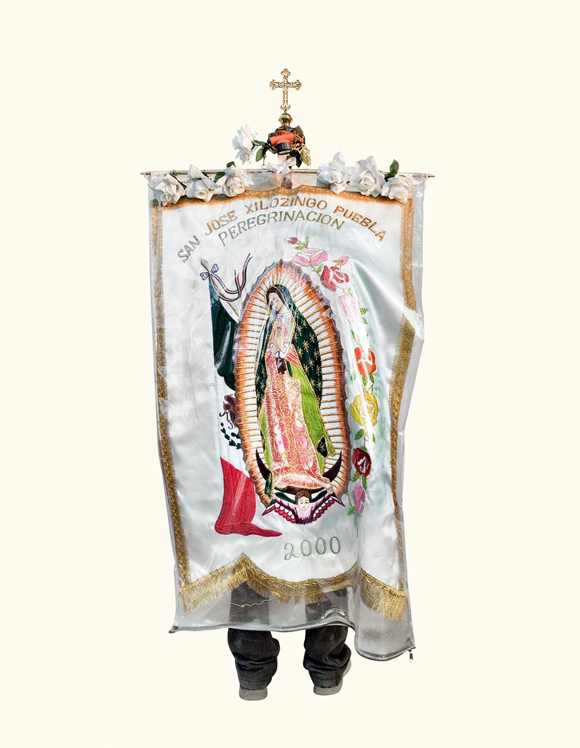 The project began after a visit to the Basilica de Guadalupe in Mexico City during the anniversary of the apparition of the Virgin. Approximately 8 million pilgrims visit the site over 4 days. The story of the apparition follows that the Virgin appeared five times before an indigenous man, Juan Diego in 1531 at the ancient site of the Aztec Goddess Tonantzin. His testimony was not enough to convince the priest that she had appeared before him, so the Virgin told him to collect roses from the hill and take them to the bishop. He collected the roses, carried them under his tunic, and when he unravelled the cloth to reveal the roses to the bishop, the image of the Virgin had imprinted itself onto his cloak. This original, miraculous image is said to be the one that is hanging in the Basilica.