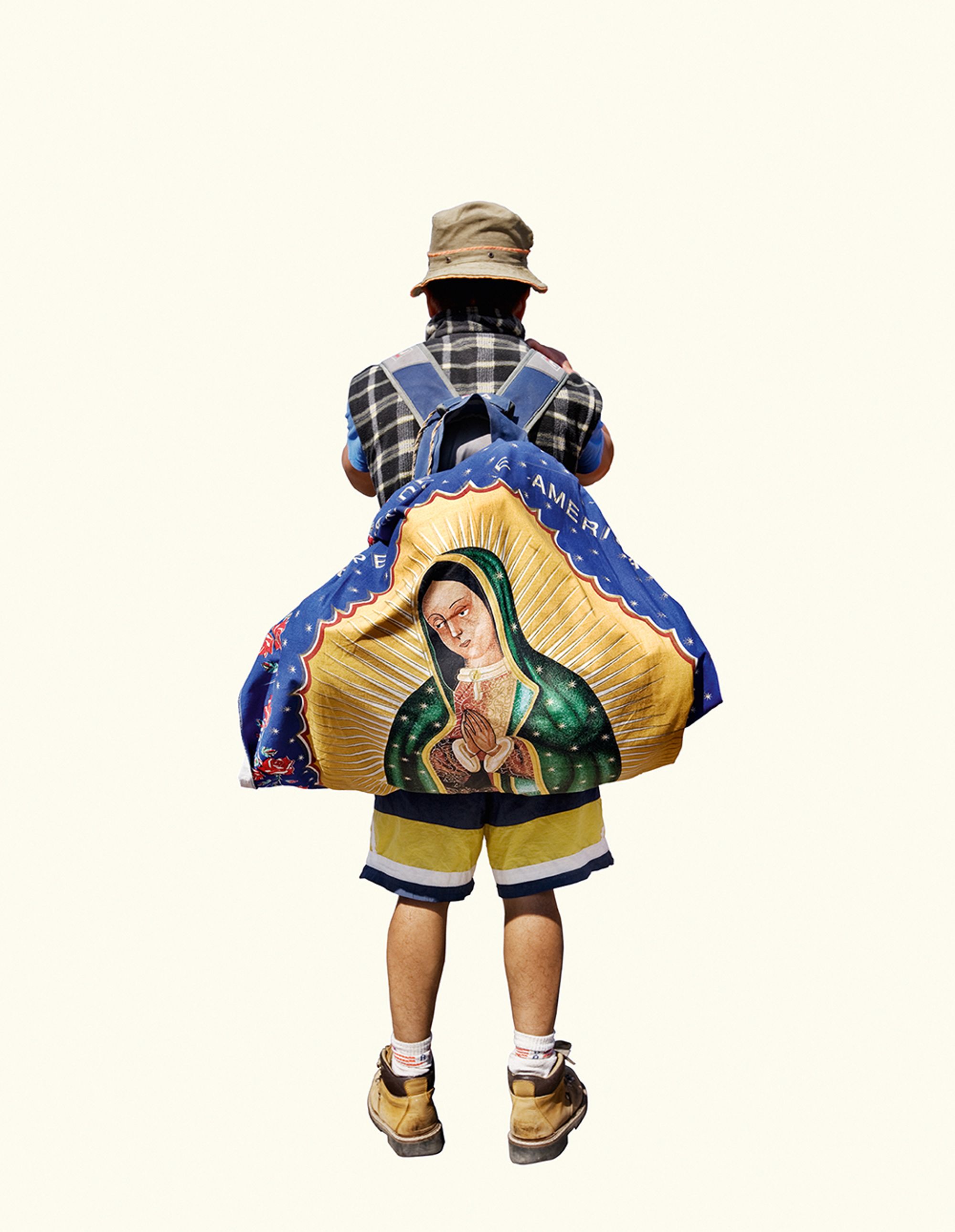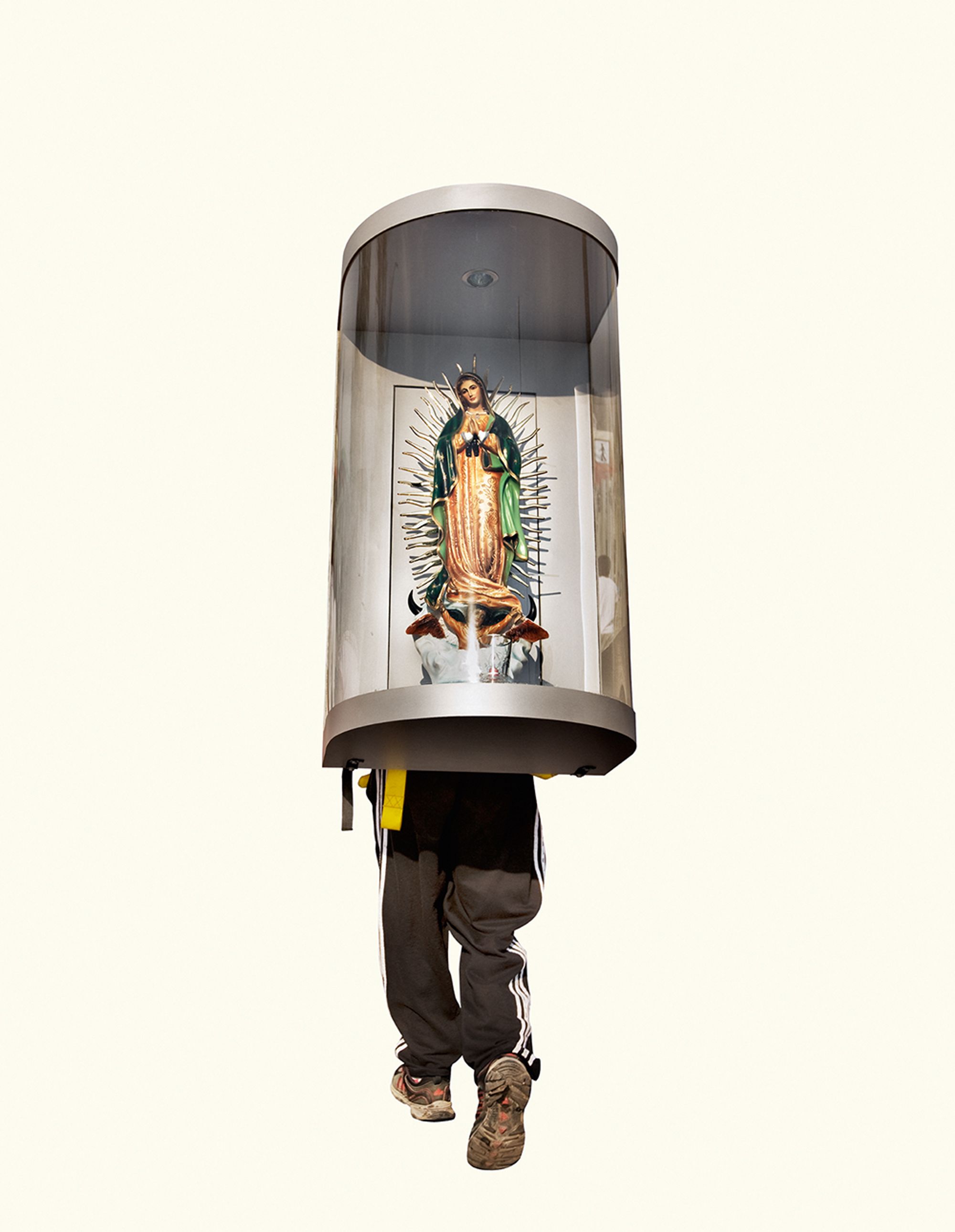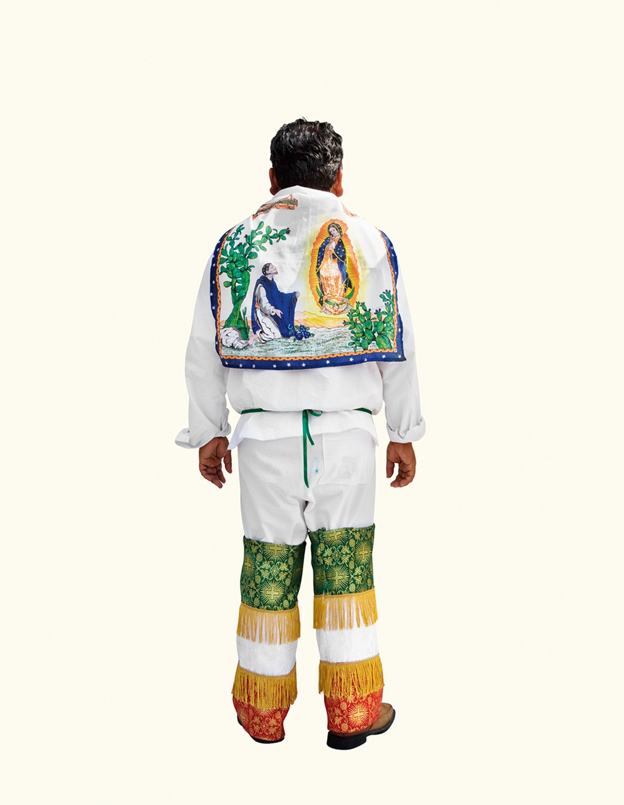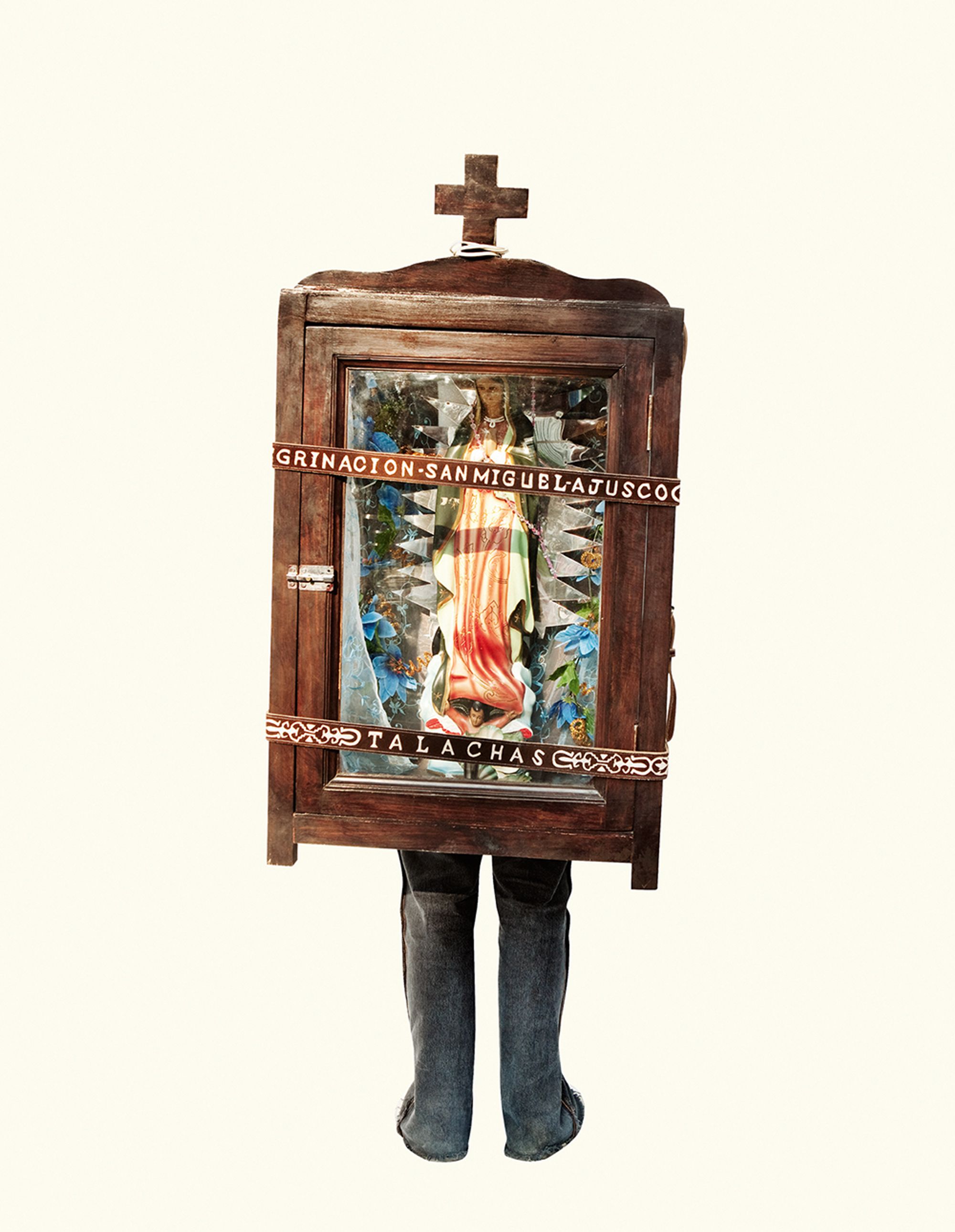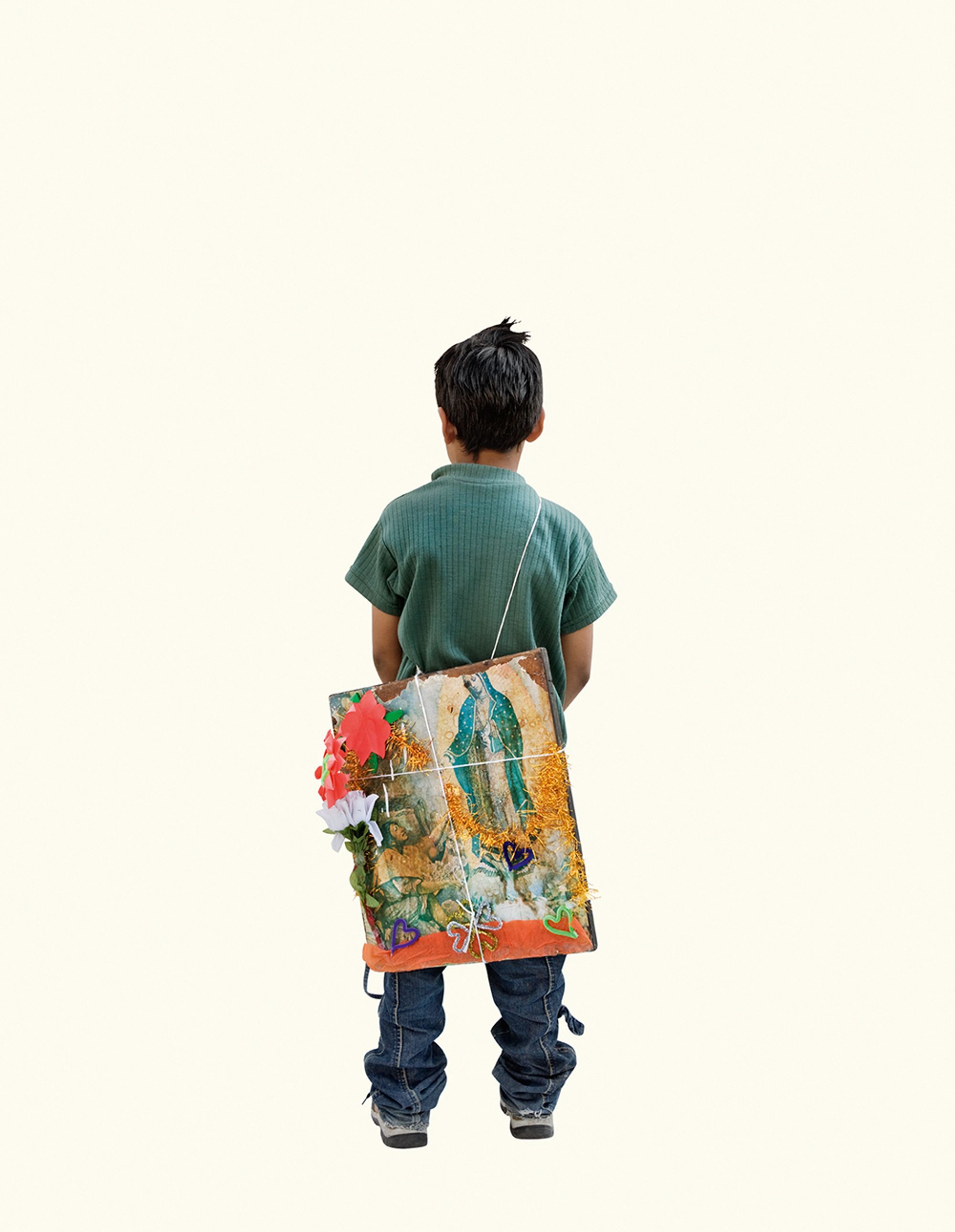 The project began after a visit to the Basilica de Guadalupe in Mexico City during the anniversary of the apparition of the Virgin. Approximately 8 million pilgrims visit the site over 4 days. The story of the apparition follows that the Virgin appeared five times before an indigenous man, Juan Diego in 1531 at the ancient site of the Aztec Goddess Tonantzin. His testimony was not enough to convince the priest that she had appeared before him, so the Virgin told him to collect roses from the hill and take them to the bishop. He collected the roses, carried them under his tunic, and when he unravelled the cloth to reveal the roses to the bishop, the image of the Virgin had imprinted itself onto his cloak. This original, miraculous image is said to be the one that is hanging in the Basilica.
