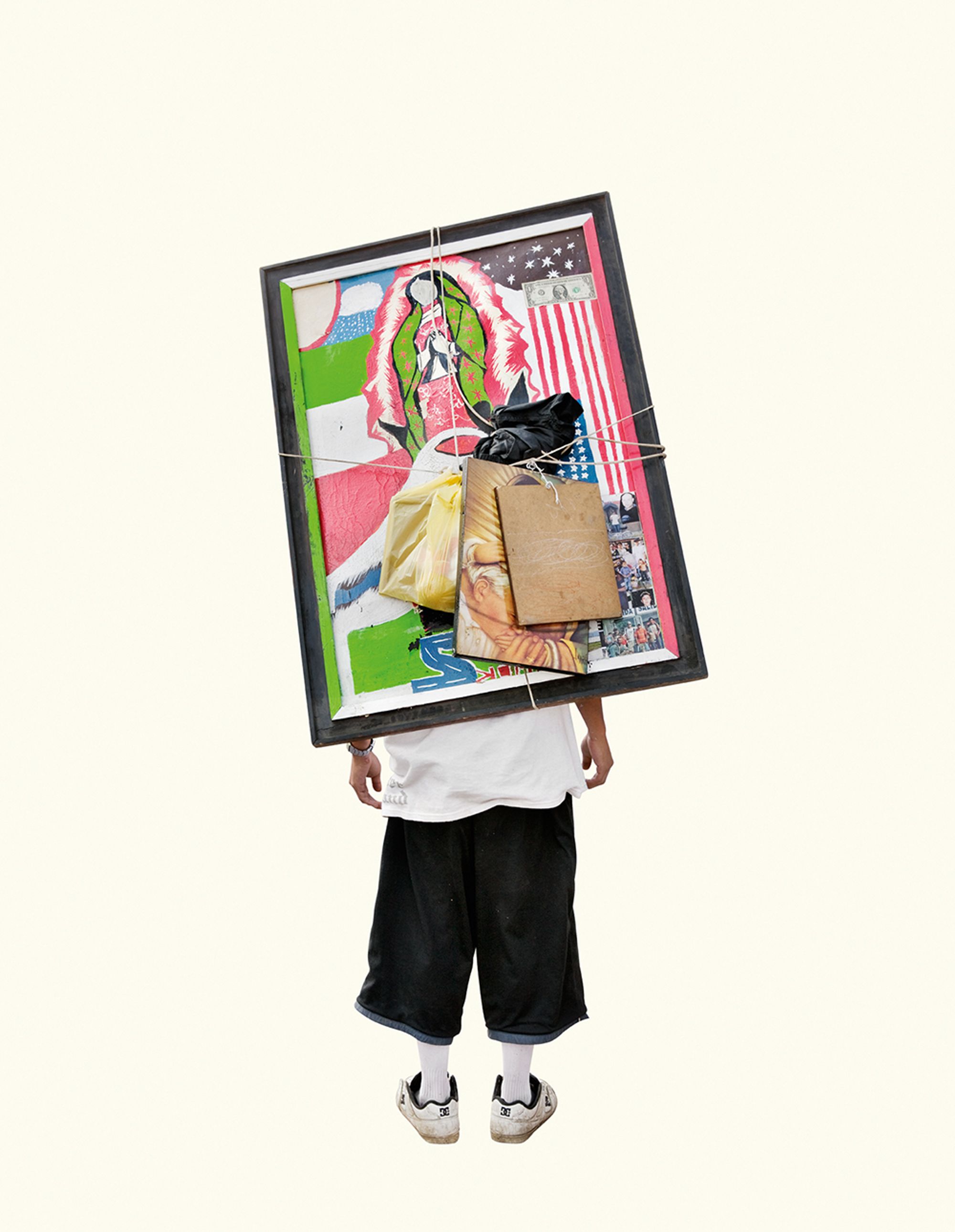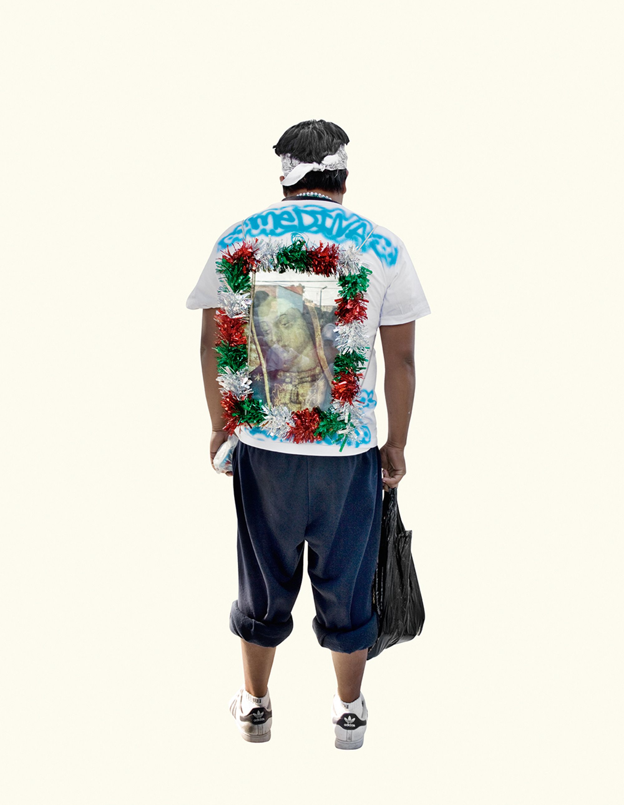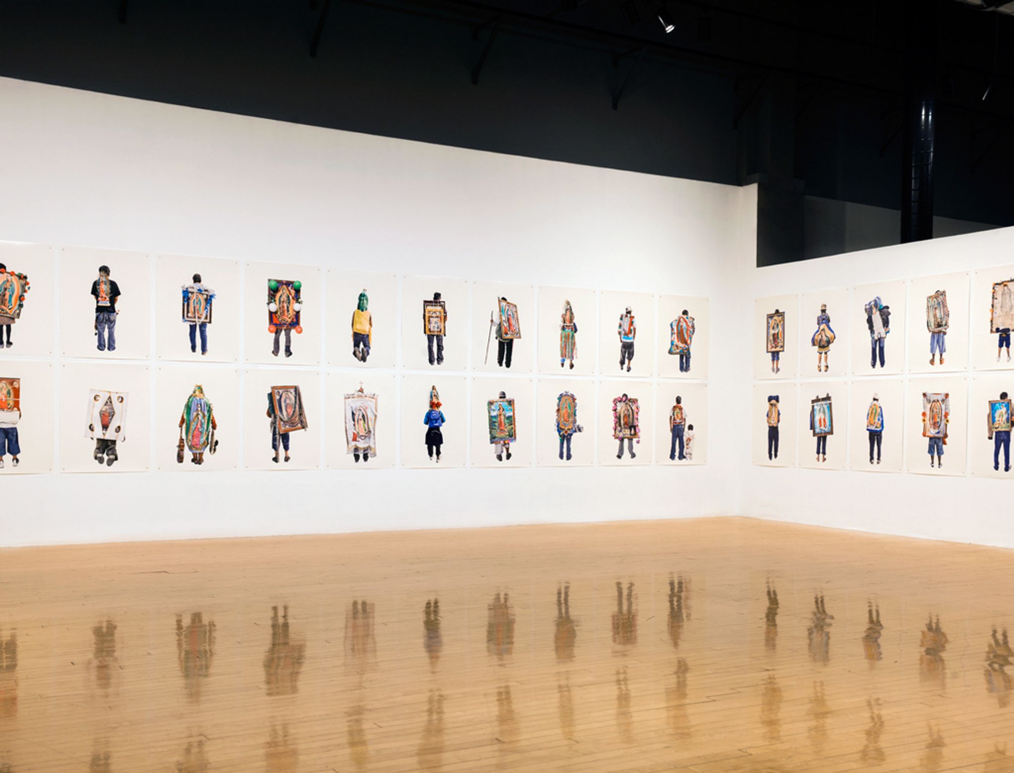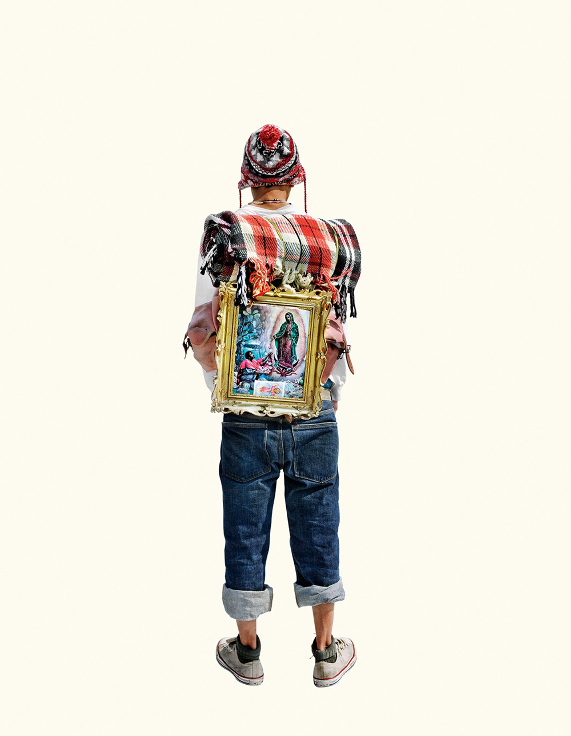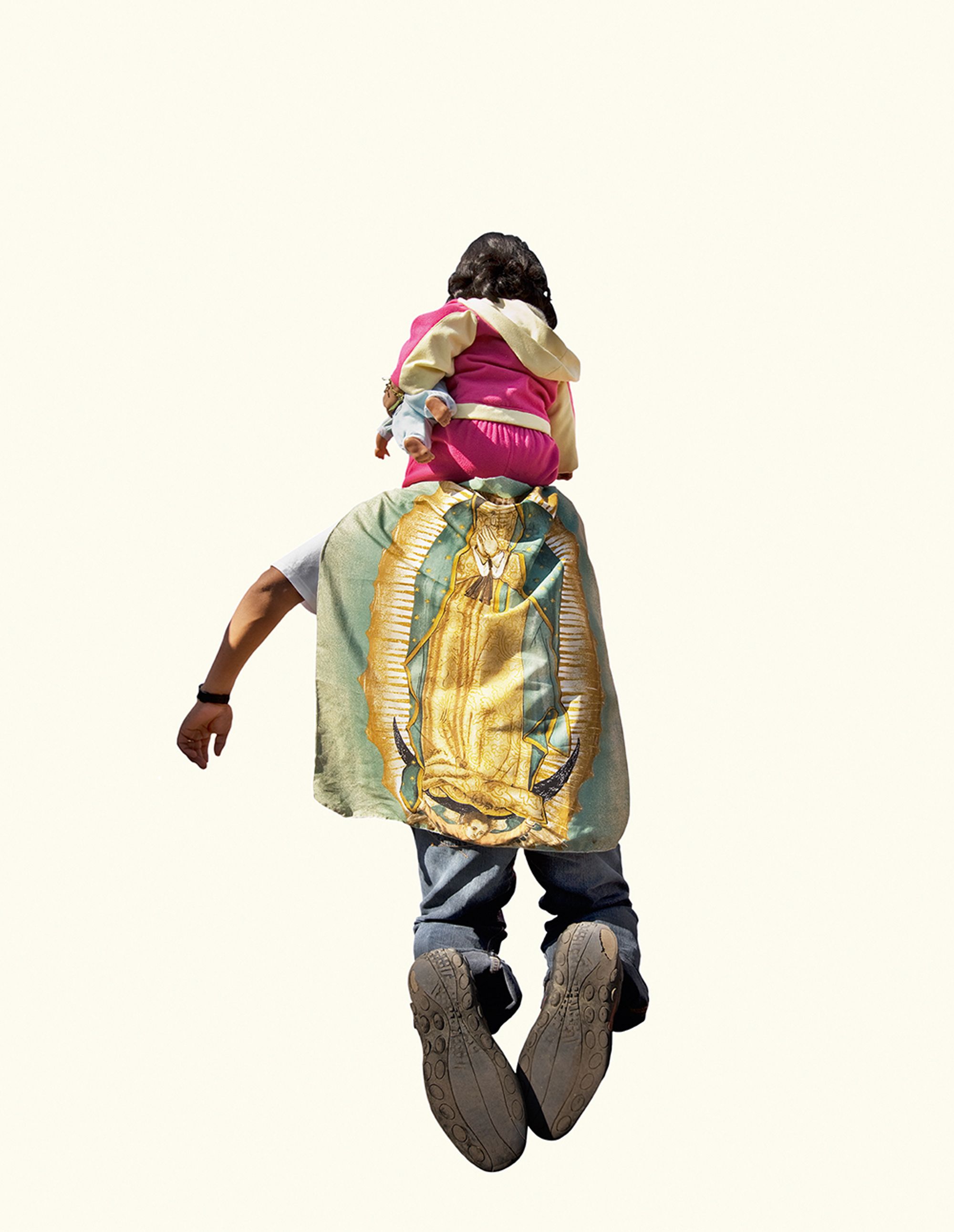 The project began after a visit to the Basilica de Guadalupe in Mexico City during the anniversary of the apparition of the Virgin. Approximately 8 million pilgrims visit the site over 4 days. The story of the apparition follows that the Virgin appeared five times before an indigenous man, Juan Diego in 1531 at the ancient site of the Aztec Goddess Tonantzin. His testimony was not enough to convince the priest that she had appeared before him, so the Virgin told him to collect roses from the hill and take them to the bishop. He collected the roses, carried them under his tunic, and when he unravelled the cloth to reveal the roses to the bishop, the image of the Virgin had imprinted itself onto his cloak. This original, miraculous image is said to be the one that is hanging in the Basilica.