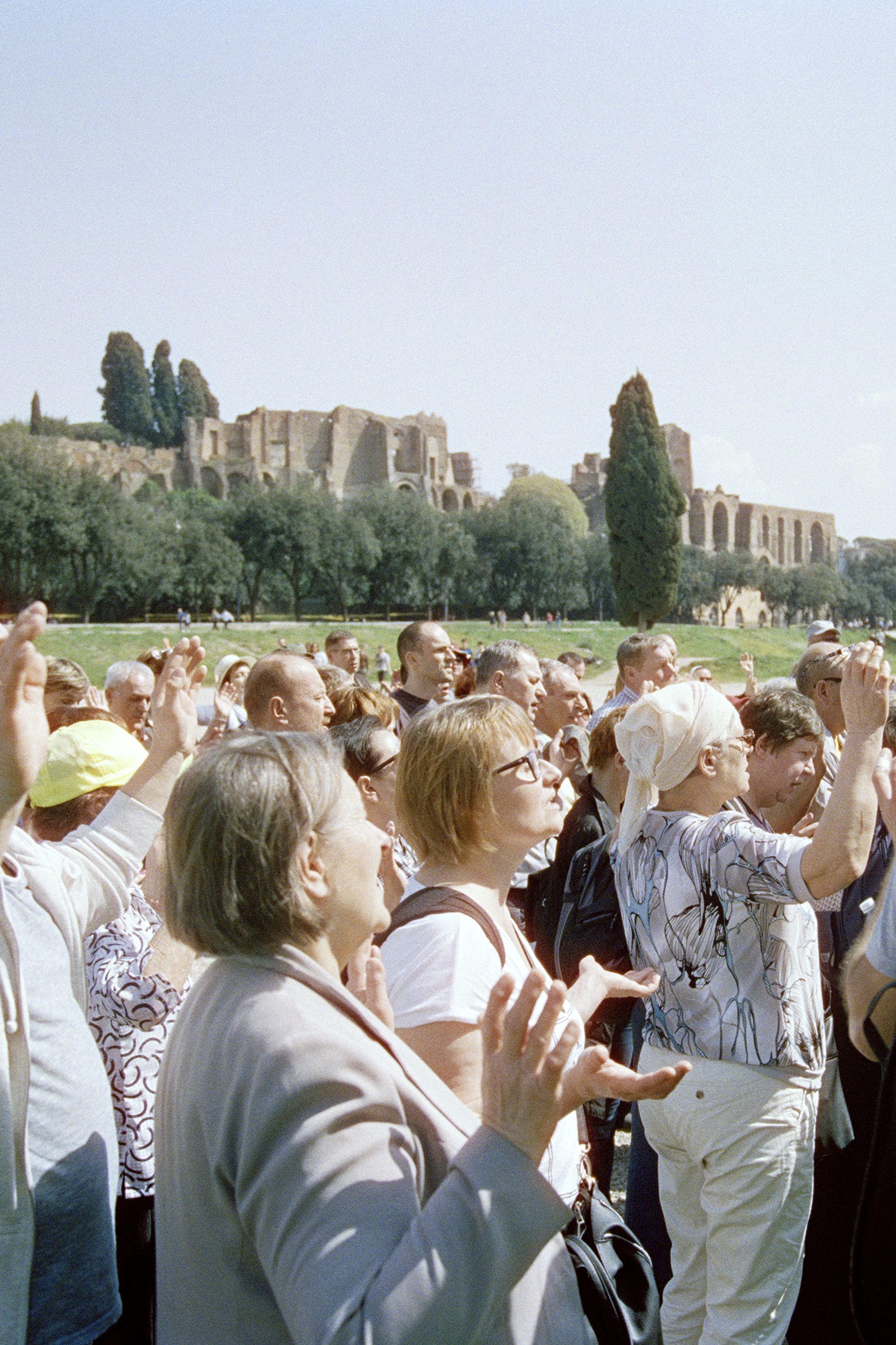 Under Black Sun traces this legacy through deconstructing the performance of it’s modern-day followers, once again depicting the New Man against the backdrop of contemporary Rome. Across Italy, like Europe, the influence and appeal of the Far Right is increasing and with this, a complication of how the country confronts and recounts its various histories. The reaffirmation of these values indicates an inability to reconcile the displacement of the white heterosexual male within an increasingly globalised and progressive West, once defined by their Ancient counterparts. Shot on motion picture film, the work follows how Far Right political parties in Italy continue to use the Fascist aesthetics of Roman symbolism and Gladiatorial performance to promote their agenda; blurring the lines between reality and the cinematic.