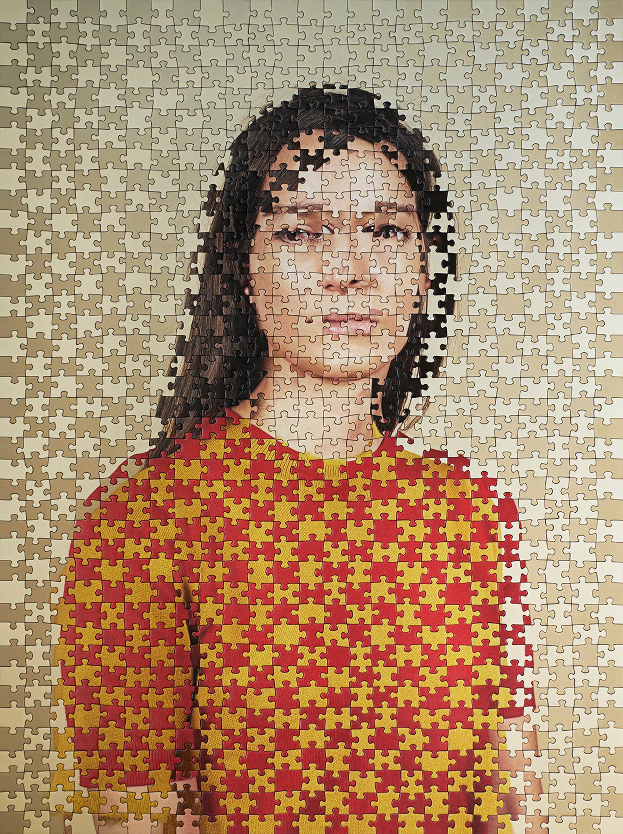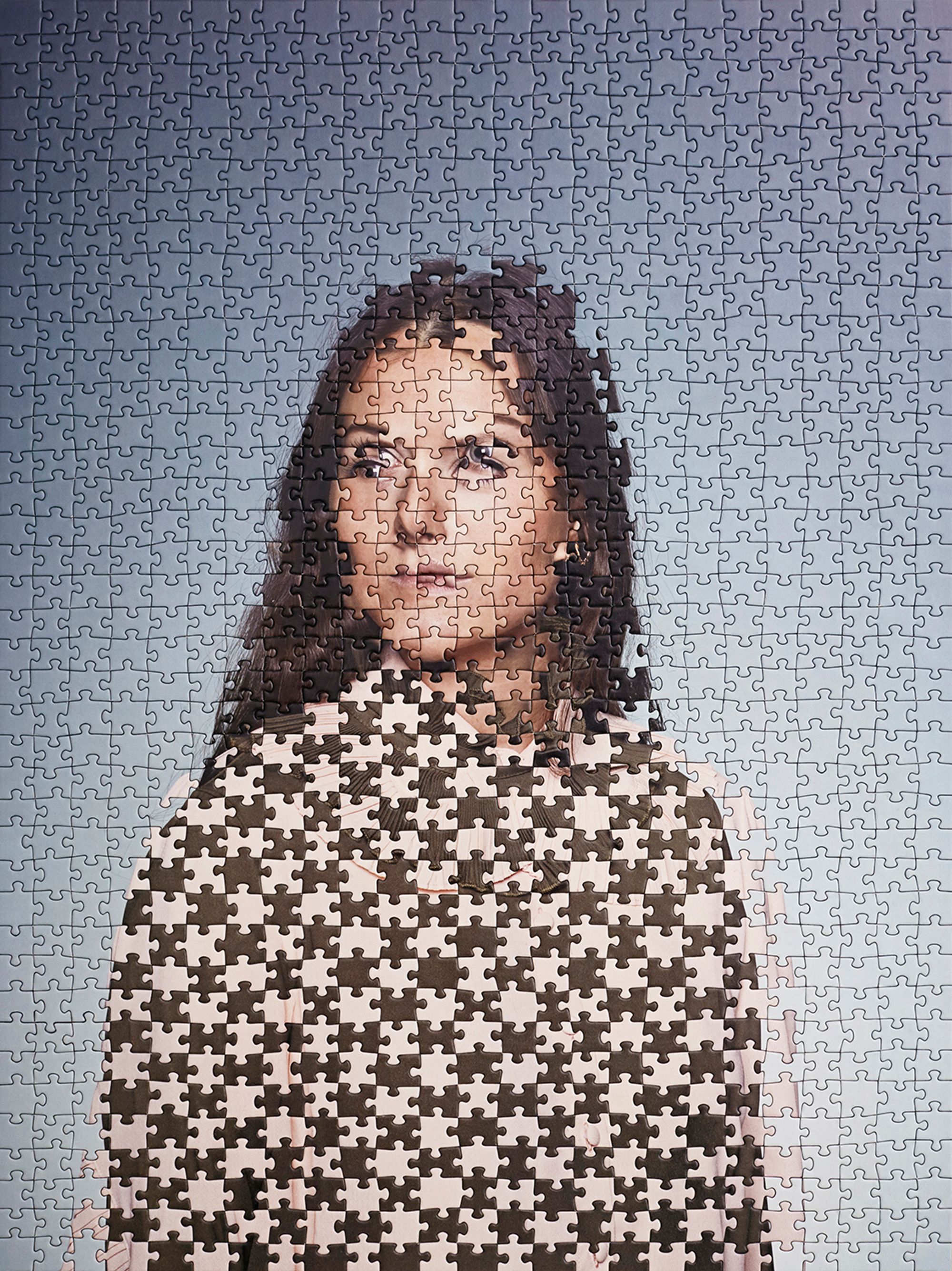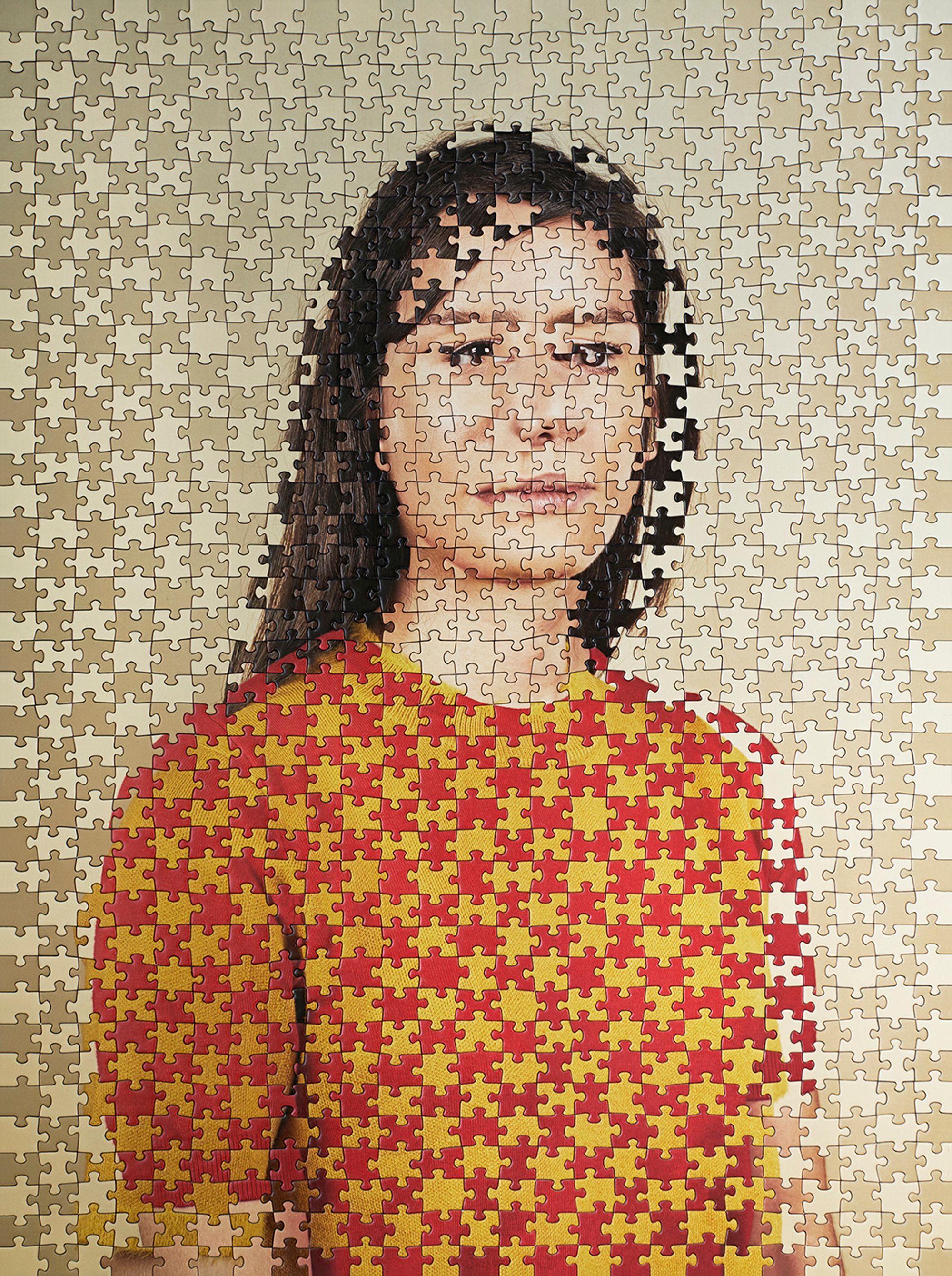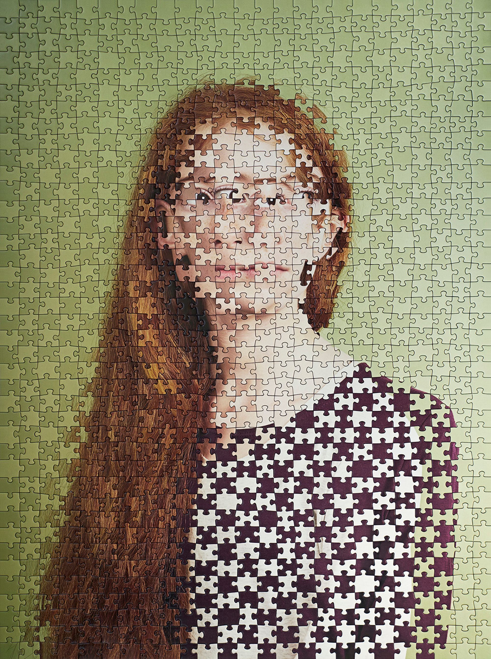 Alma photographed sets of identical twins and made them into identical 1000-piece jigsaw puzzles. Every other piece of the puzzle was then swapped until finally, each puzzle contained half of the other. It was not possible to predict where the eyes, mouths and lips would fall resulting in a pair of eerie, unrecognisable portraits. No longer seen as completely identical, they are unique.