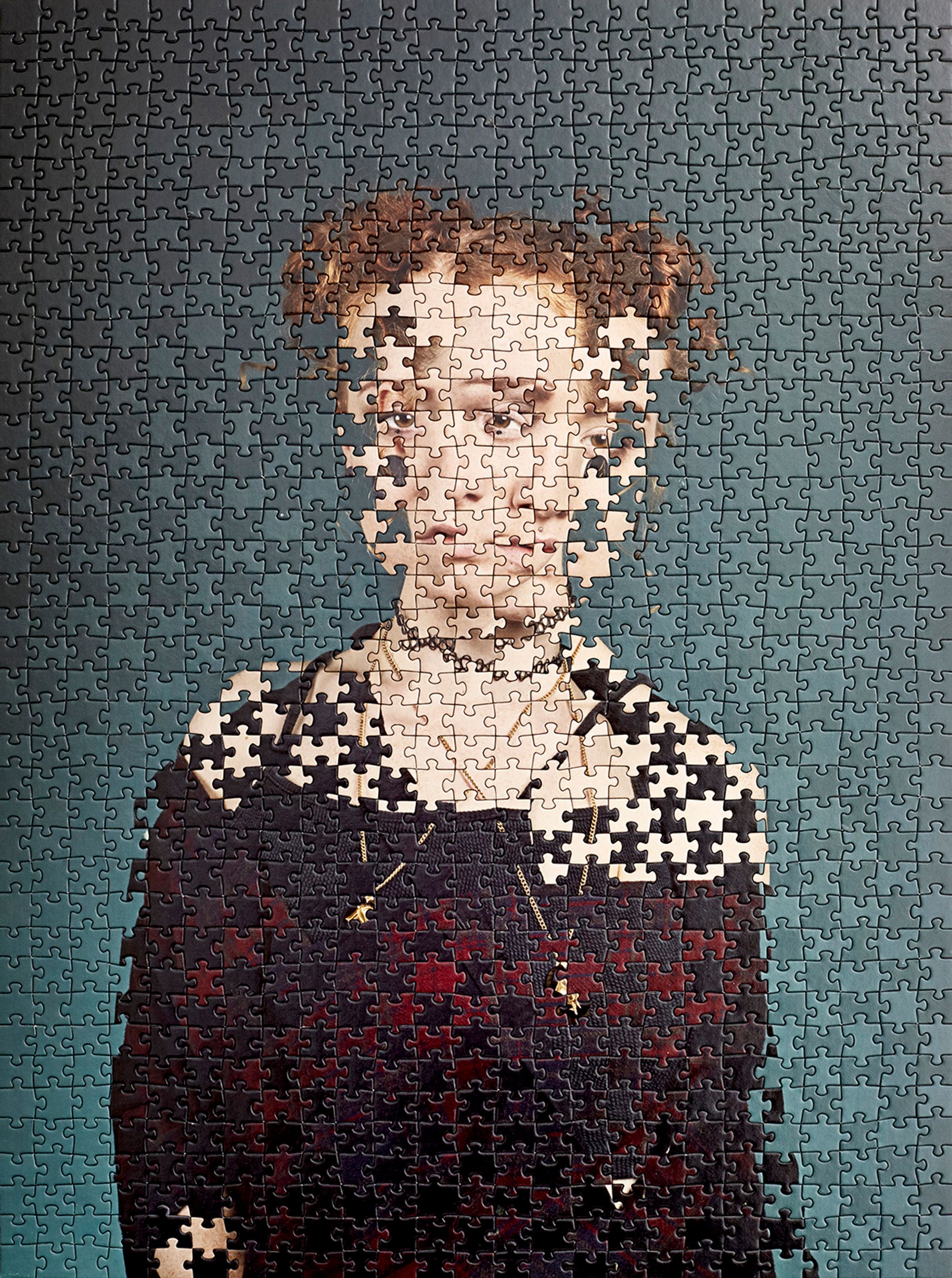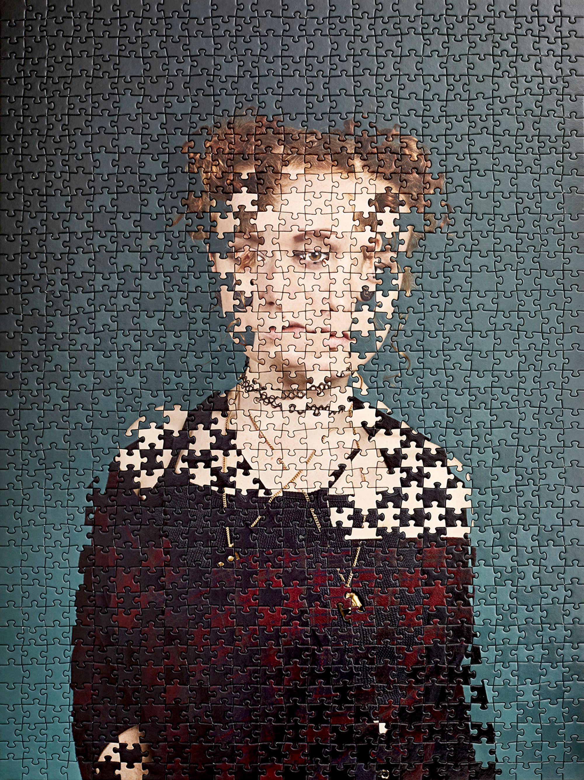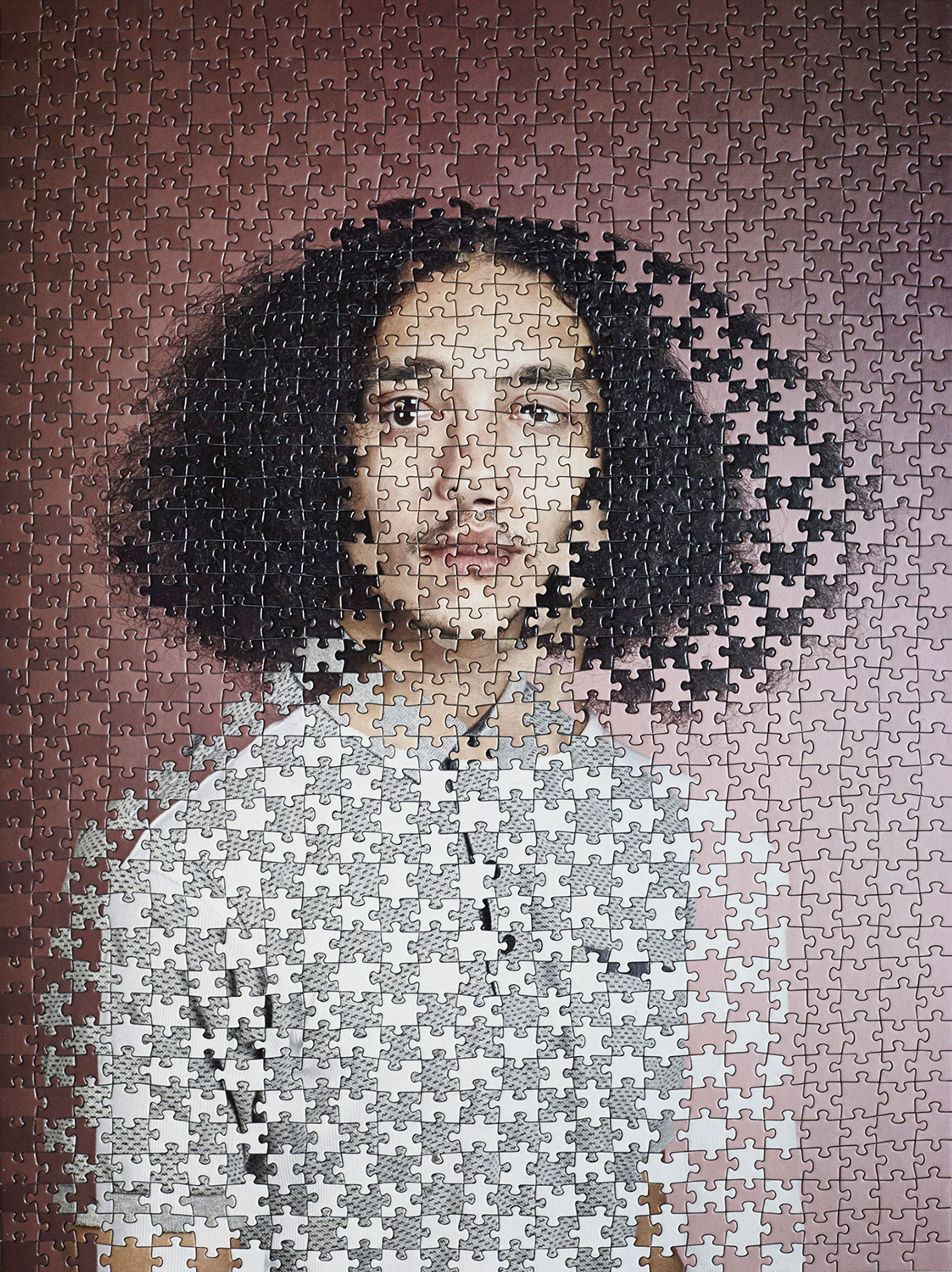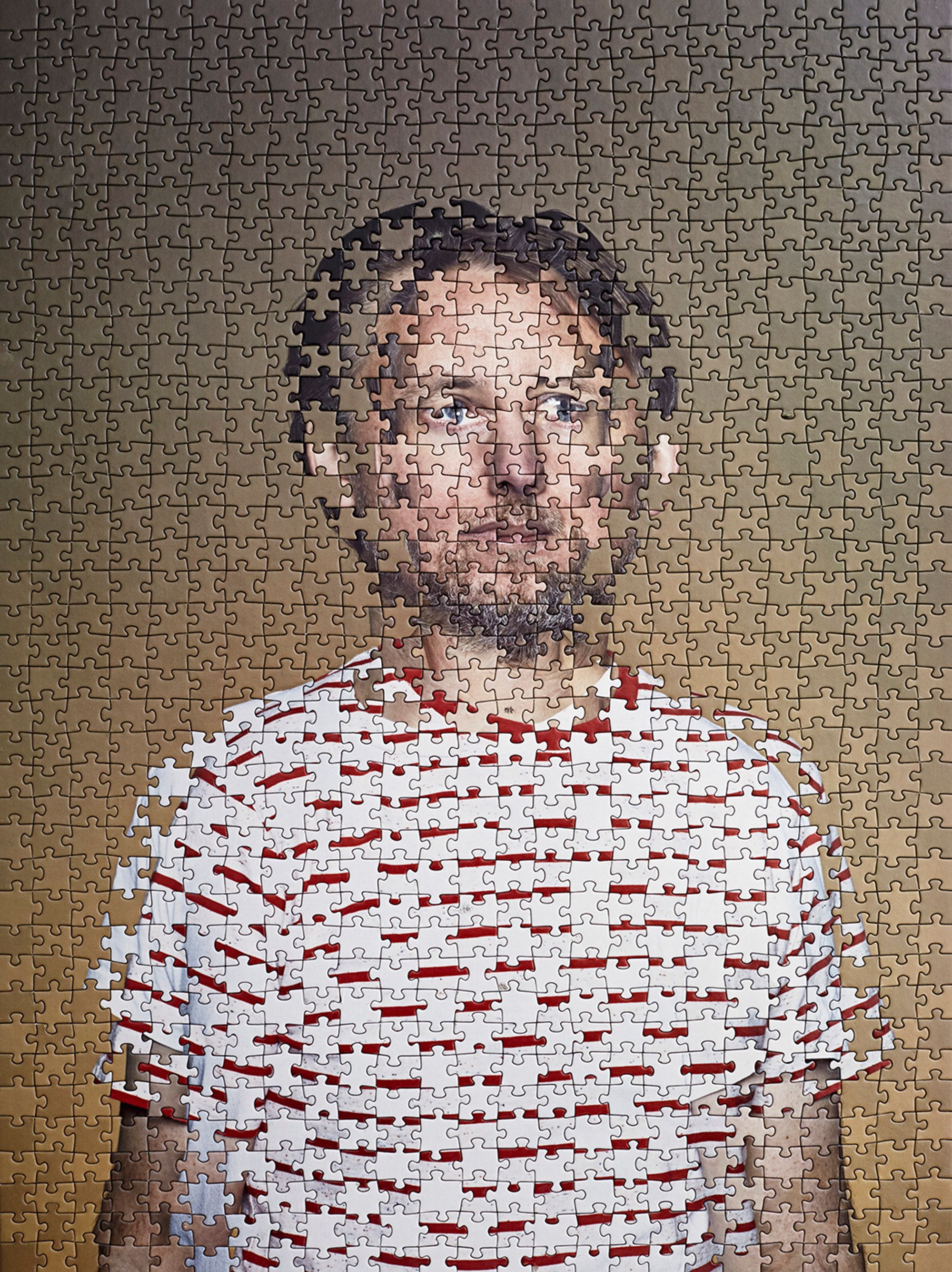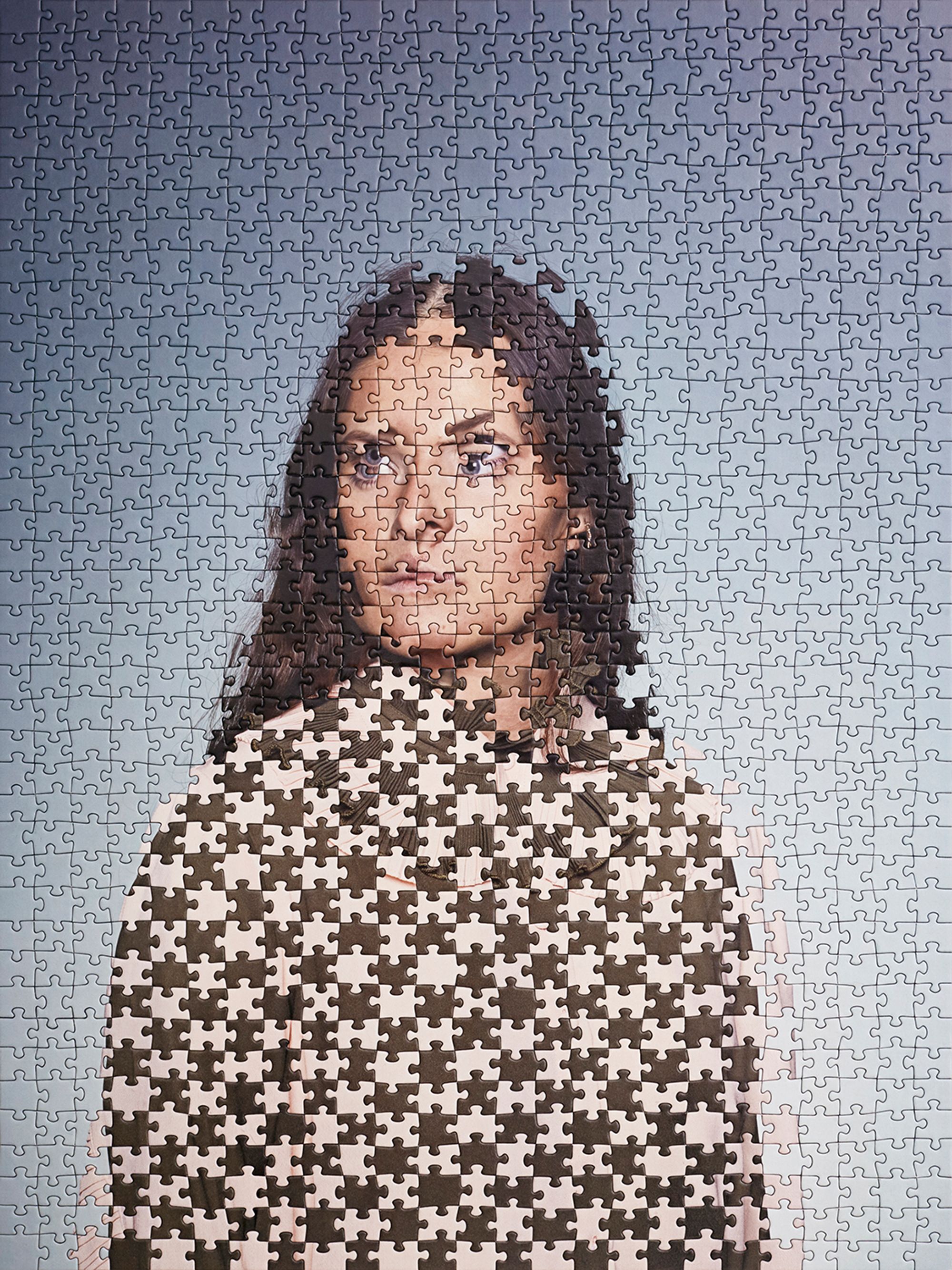 Alma photographed sets of identical twins and made them into identical 1000-piece jigsaw puzzles. Every other piece of the puzzle was then swapped until finally, each puzzle contained half of the other. It was not possible to predict where the eyes, mouths and lips would fall resulting in a pair of eerie, unrecognisable portraits. No longer seen as completely identical, they are unique.