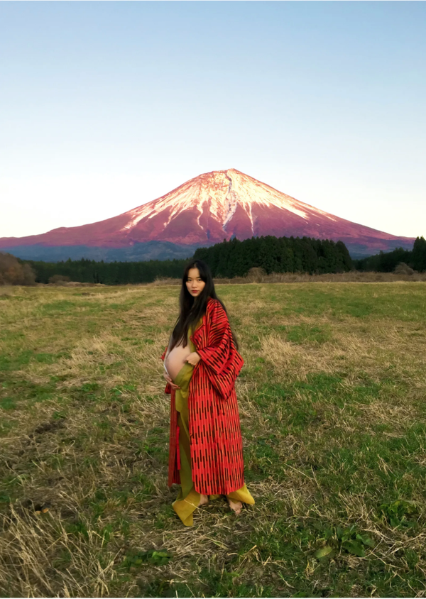 In essence, his series depicts Nami as a Goddess – she shines as much as the moonlight within mystical landscapes. A recurring motive, Mont Fuji, her birthplace, evokes an array of pictural references. When the volcano was named worldwide heritage by Unesco, the institution unsurprisingly called it a sacred place and an inspiration for the arts. Its perfect conic shape evokes the pure roundness of Nami’s belly, at times at the centre of the photograph, at times a pretext to emphasize something else.