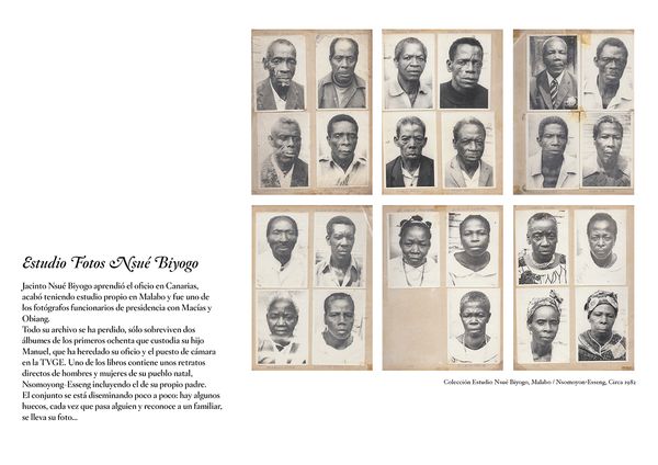 All of his archives have been lost, only two albums survived of the first eighty which are in the possession of his son Manuel, who has inherited his trade and his position of cameraman in the TVGE. One of the books contains portraits of men and woman of his native town, Nsomoyong-Esseng, including his one of his father. The set is disseminated little by little: there are some holes, every time that someone passed and recognised a relative, they took a photo…