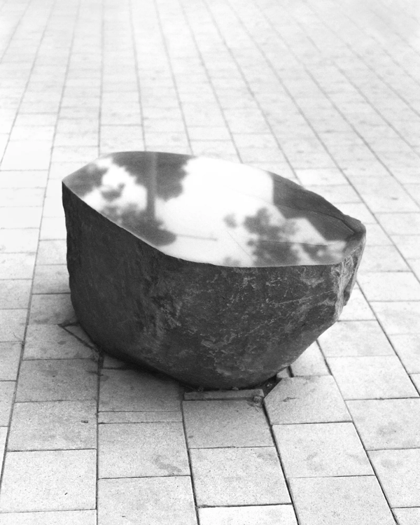 Other images recall these same feelings of distortion, fracture, change: the twisted branches of a small tree, like a natural response to an imperceptible threat; a hole in a rock, among the shrubs, as a den leading to an uncomfortable shelter; the shiny surface cut into a rock and reflecting the sky, a distant universe balancing the stone’s heaviness.
