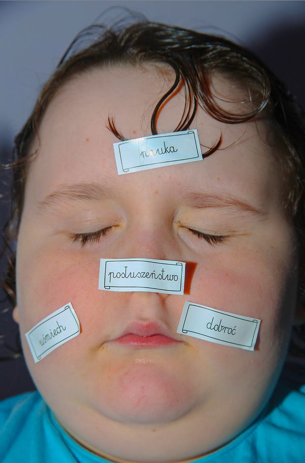Writer Matthias Grunding, winner of the C/O Berlin Award Talent Award as a theorist, describes Karolina Wojtas’s work as “chaotic”- and I could not think of a better word. Chaotic as a term does not bear a destructive meaning only, Grunding explains, but also a creative, generative energy. Wojtas doesn’t only demolish: she also hints at the possibility of something new. One photograph in the book shows a boy with a set of stickers on his face: they are exhortations, in Polish, to kindness and to obedience, they say: “smile”. Abzgram isn’t kind, or obedient. If it smiles, it is probably more of a smirk. Its tones are provoking, openly laughing at any demand on how things are supposed to work. Its visual language is oversaturated, pointing, in its excessiveness, to something disquieting more than to pure joy.