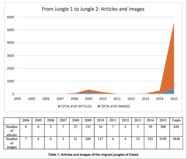 These dehumanizing labels and misleading figures of terror are only a few consequences of the way the media and governments approach the refugee issue. In the graphic below, we see the amount of articles and images produced since 2002 (five years after the first controversial camp, Sangatte, was built) about Calais. We can clearly identify two pick periods in the production of images/articles in 2009 and 2015