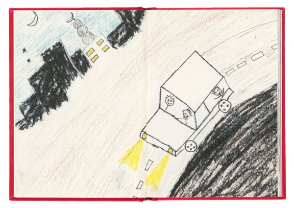 Images tie in with the text, so there is a child’s drawing of a car filled with happy, smiling faces, there is a medical certificate with test results, there are pictures of graves, and there are family photographs mixed with contemporary images, though it’s not always easy to tell which is which. The cracks in the family album, the slippage between past and present, and the cutting across time is evident here.