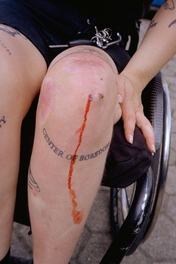 We see Jersø’s knee tattoo. It reads Center of Boredom, a streak of blood streaming across it from a surgical entry point. There’s a Copenhagen City tattoo and a Major Tom tattoo, marks that she decided to have made on a body that is scarred both from her accident and the subsequent medical conditions she suffers.