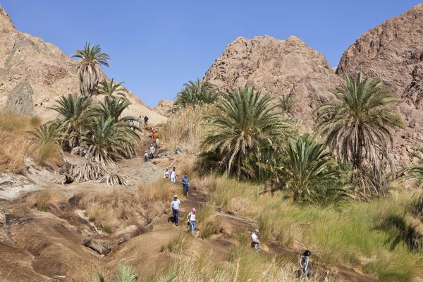 . A group of Russian tourists are taking a break during a quad bike excursion at the Wadi Gunaim Oasis.