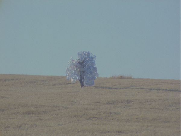 It’s the beginning of the day. A man, all covered in plastic bottles, walks towards the gates of a city. He looks like some sort of mythological creature. The city is Tangier, Morocco, and the man is a bleach seller. This is how the 16mm video, part of Hicham Gardaf’s multimedia body of work In Praise of Slowness, starts.