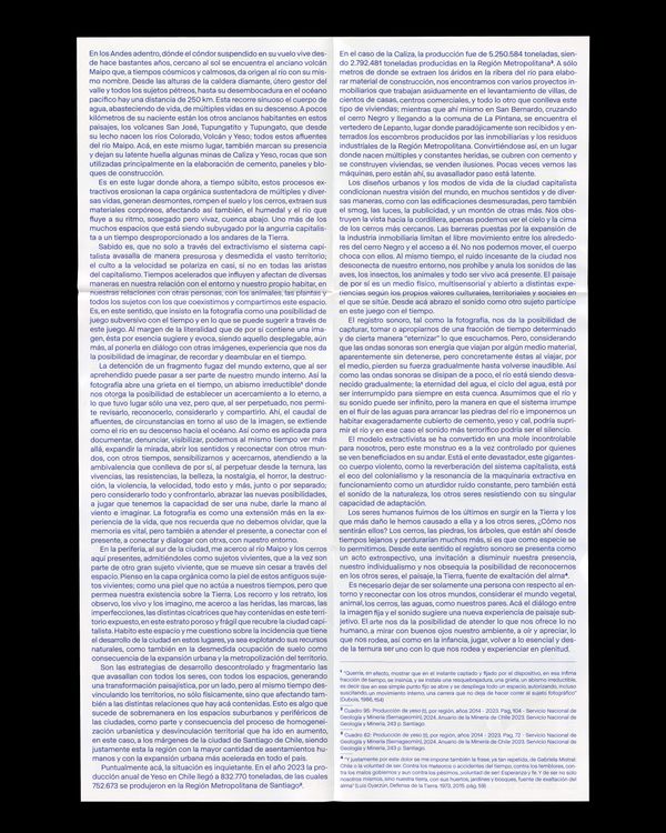 En la memoria del agua viven las piedras es una publicación que se posiciona desde un caracter de investigación situada en el espacio natural para abordar una crítica visual y sensorial sobre el avance voraz del capitalismo tardío sobre el paisaje natural