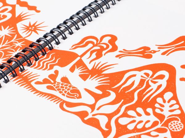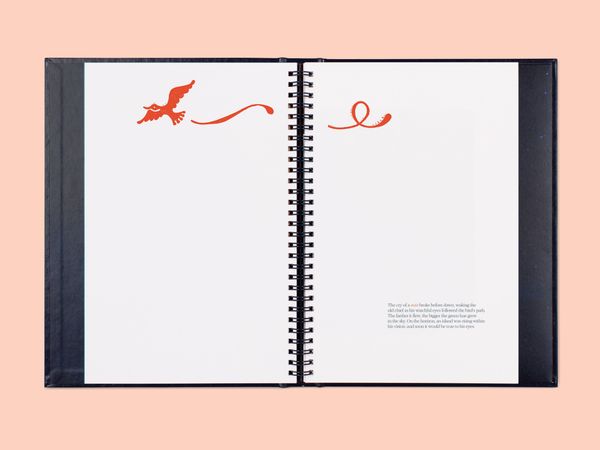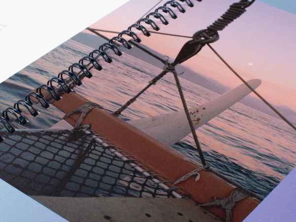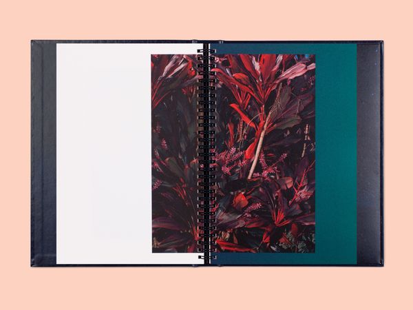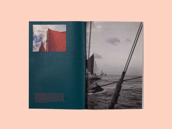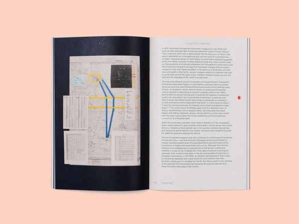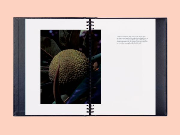 The first book, The Spell, opens with a series of lush photographs that capture life on the open ocean, lulling the reader into a sensory experience. Drawn from ancestral voyaging mythology and the artist’s own visionary dreams, fragments of narrative text ebb and flow through the book, while illustrations by Sophy Hollington serve as visual footnotes. Taking inspiration from nautical logbooks, The Spell is wire-bound into a hardcover case and incorporates luminescent paper to evoke the glistening surface of the ocean.