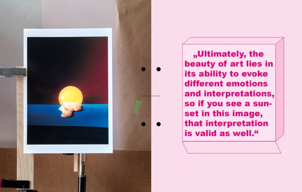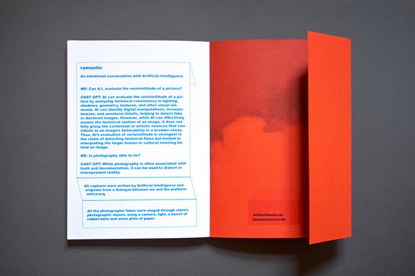 The medium photography is broadly positioned, and many players out of a wide range of aspiration add content to a partly uniform mass of images. Now a new protagonist has entered the scene: Generative A.., which is built around the interface between visuals and words. This is similar to a basic model for understanding we use when we look at a picture: trying to recognise forms and structures and then naming them. This process to connect images and words we have been training since childhood, when we were looking up to clouds in the summer sky, trying to identify animals and heads within them and tell our friends. My project „Romantic" is based on this visuals-words interface as well. It deals with the photographic cliche and the way how pictures from this visual range are read - how much emotion has to be offered in order to make pictures readable beyond their tangible content? Are pictures that can be easily identified as fake still capable of provoking a certain, wrong way to be read, if they are consistent - to a certain extent - with our visual experience? The starting point for this project are simple photographic fakes, staged by classic photographic means - like for example a fake sunset, rebuilt with a rubber ball, or a starry night, mimicked by a print on paper with cut-out holes. The resulting pictures contain disruptions and blurs which make it easy to debunk the content, like for example unrealistic constellations of the stars, apparent assembly of several objective layers or the like. In a second step these motifs are read and described by Artificial Intelligence. Is A.I. able to follow a merely emotionally driven perception of the photographs or will it detect only the real, technical construction of the picture? Will a human viewer behave the same way or will she/he be able to read the set-up in a dialectical way - decode the fake and still understand the emotional assertion? Does A.I., which is trained to deliver expectable, average results, work as the burning glass of the average human perception, does it adopt the pose of an emotionally driven awareness? Finally the whole project was translated into a „paper-machine" based on the simple technique of turning pages, a.k.a. a book.