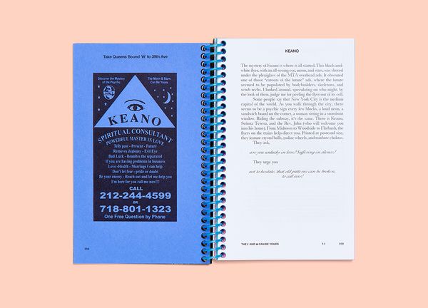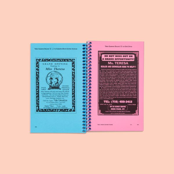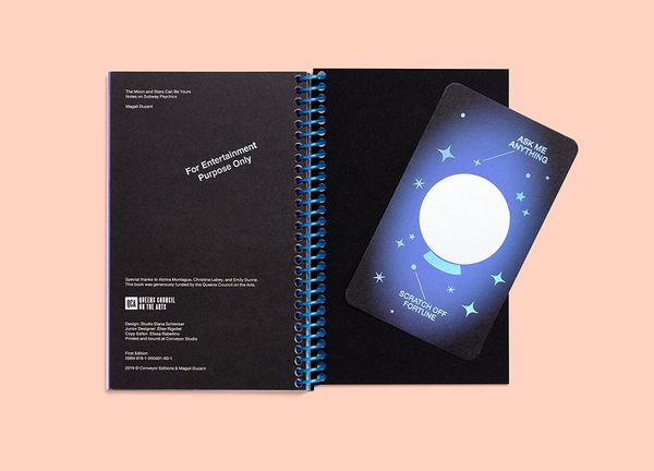The Moon and Stars Can Be Yours: Notes on Subway Psychics includes a holographic cover, a selection of the colorful psychic fliers found on the subway, and in the back of each book, a scratch-off fortune card awaits the reader.