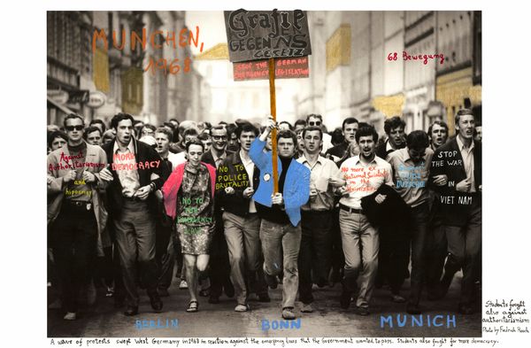 The use of archival images is part of my professional practice as a photographer. It is important that the vieweres are able to read the text. The writing interacts with the image and aggregates meaning. In this case, they bring the issues and ideas of 1968 to discussion. Each image in the installation and each piece of text are different since they are determined by national conditions. But they still have plenty in common as they are all part of the spirit of the zeitgeist.