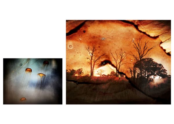 The only way I could combat the frustration of this political impotence, the anxiety of watching the country I love so dearly ablaze, and the horror I felt at the appalling extent of death and suffering amongst the country’s native wildlife was to produce photographic work. The images feature preserved Victorian museum specimens of indigenous wildlife brought back to the UK by Australia’s colonising powers - serving as an ironic counterpoint to the contemporary living creatures we so patently failed to preserve in this instance - and my own archival images from my homeland, which I painted over with oils and inks, stripping them of their original peaceful quality, scratching and reworking them in an attempt at representing both the violent power of fire on that scale and my own fear and anger at such devastation. The intervention of my brushstrokes on the prints became a mirror of human intervention in nature, my own hand attempting to control the uncontrollable. This manipulation of the images is a way of implanting into them my emotional response at the continual destruction of nature whilst simultaneously attempting to find beauty and hope amid the tragedy of these lost places.