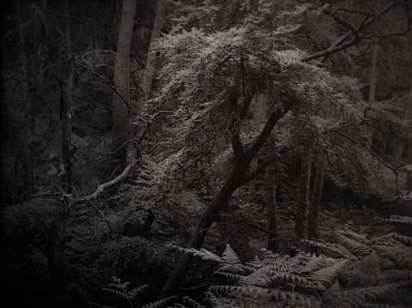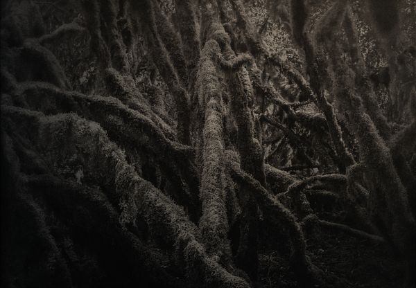 The Piezography printing process on Japanese paper, using inks composed of carbon black pigments, imbues the photographic material with a presence that is both dense and radiant. These prints evoke the early experiments of photography’s pioneers, some of whom sought to capture spectral apparitions. Within the iridescent shimmer and the dense charcoal-black inks of these prints emerges the vibration of an archaic vegetal memory. After all, is not charcoal itself the result of the partial decomposition of organic forest matter—an alchemical transformation spanning millions of years, transmuting vegetal into mineral? The very materiality of these prints, composed of the transmuted dead body of these primeval forests, encloses their spectral memory.