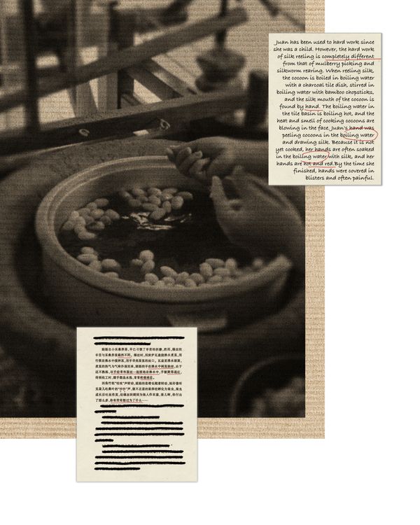 It starts from mulberry silkworm in China, to discuss faith, female labour and culture heritage. Through photography, photo montage and embroidery, to explore the transcendent connection between humans and material life under the industrialisation.