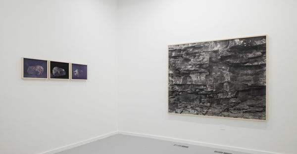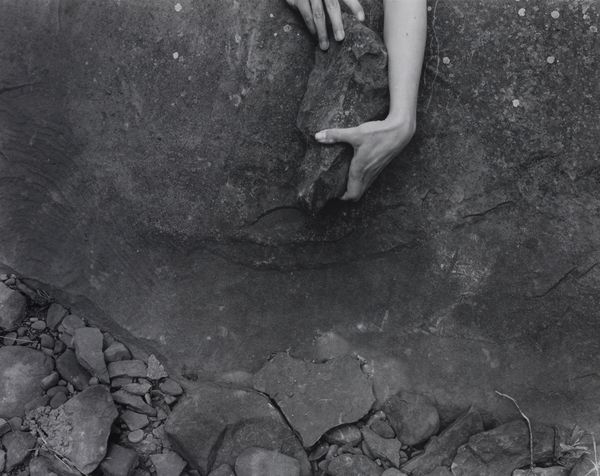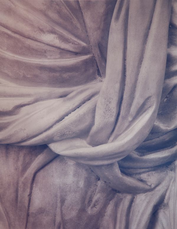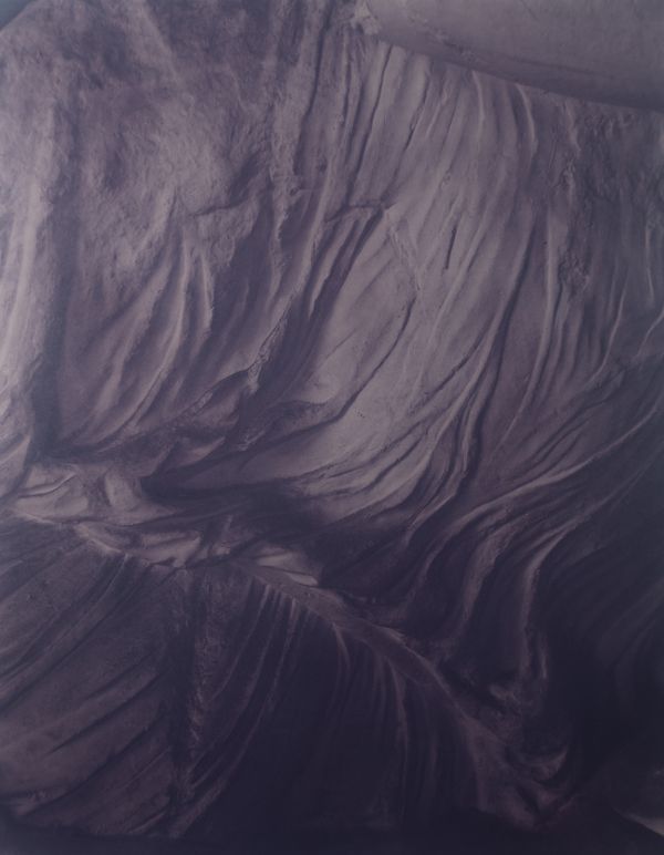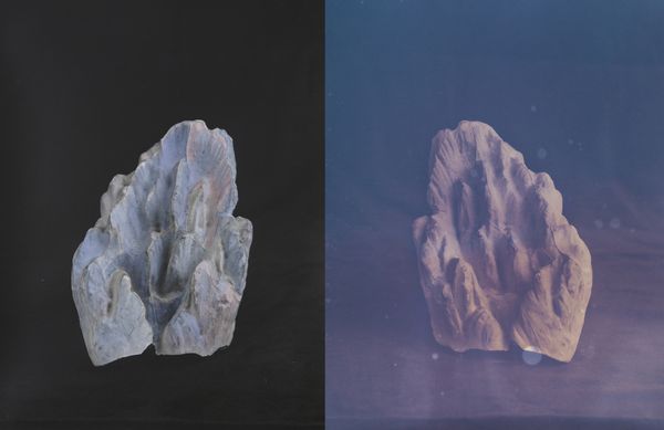 All solid shapes dissolve in light is about the impossible desire to secure things through reproduction, whether it be through pictures, statues, or lineage.  Photographs of supposedly solid subjects such as rock formations, fragmented plaster cast statues, my hands, my mother’s hands, and my plaster cast hands were made by exposing paper dyed with lichen to the sun outdoors.  The exposure of these fading pictures takes weeks to months depending on the time of year, and is as simple as paint turning pale in the sun. The highlights are formed through the breakdown of dye molecules that travel through a positive transparency pressed in contact with the paper under glass.  When the dyed paper has faded enough for the image to form, the transparency is removed to reveal the unfixable image made through its own disappearance.  Each print in the variable editions has unique color and contrast, as the process is capricious. The hands and fragments are printed life size in high detail to accentuate the near presence of the subject, and to therefore also heighten its absence.