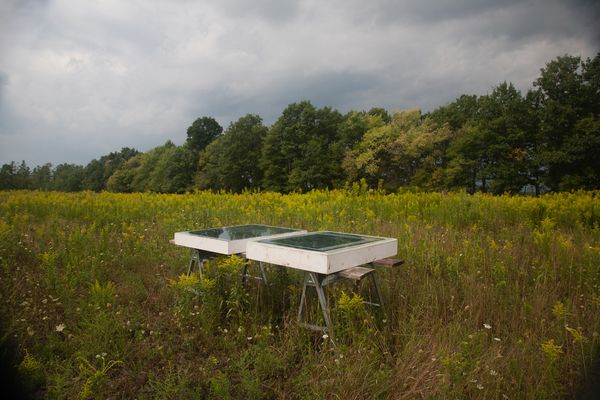 As an experiment in using the subject as the medium, these purple pictures are made by fading lichen dye, chosen because of its inherent connection to the subject matter. Lichen echoes the slowness of the printing process, and grows on rocks.  The resulting images vary in magenta, violet, blue hues and cannot be fixed.  The same light that made the images continues to fade them as they are viewed.  The only way to preserve these images is to keep them hidden.  These fading photographs are presented alongside relatively permanent silver gelatin and inkjet prints to emphasize the constant shifting of all photographs through time and context.  When the image fades away entirely, a pale color will be left on the paper.  I like to think that this ghost image is just as valuable, if not more, than the visible one, because it holds time and incites memory and/or the imagination.  The photograph becomes more substance than image.