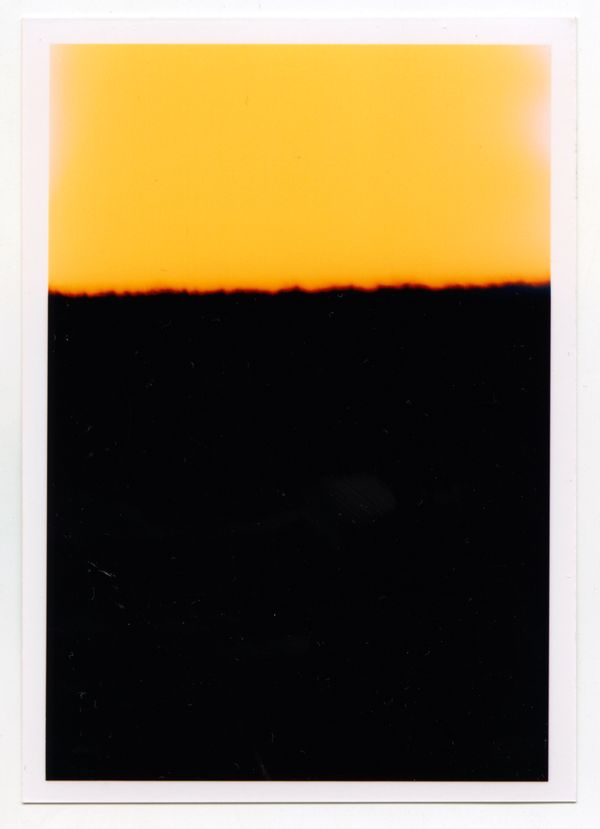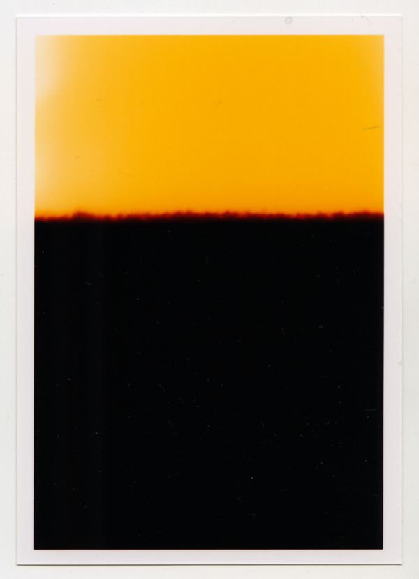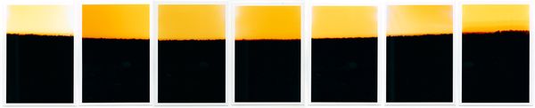 Alternative sunrises I-VII are undeniable not real celestial phenomena, but crops of color negatives from Bettina Koller's private and professional archive: strong enlargements from 35 mm film leaders. The exposed film tongue serves for threading into the camera's spool. After film developing it is often cut off or used for labeling. In Alternative Sunrise the distinctive transition from the exposed to the unexposed part of each film strip represents a new horizon: Installed side by side – the 7 panels appear as Sun pressing down on earth.