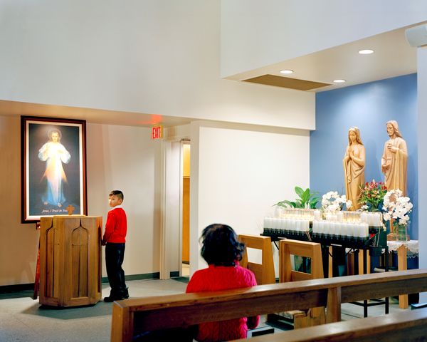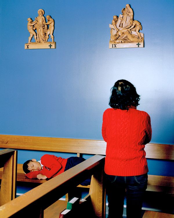 “Am I a Sea” is an autobiographical series exploring my relationship with Roman Catholicism as a queer Filipino man. I use my younger brother as a mirror to reflect the preceriarity of my position in this inescapable relationship fraught with trauma and love provided by the institution and the home. He becomes a stand in to present past personal and collective experiences of immigrant children within the Roman Catholic institution. “Am I a Sea” attempts to call upon the 333 years of western Spanish colonization over the Philippines and image the consequences of intergenerational trauma within the Filipino body. The inability to escape is realized as a consequence of centuries of colonization and familial inheritance. I am interested in the history of the church that served as a tool involved in the colonial mission and now acts as a space for bodies to commune with one another in the diaspora. Playing between the spaces of what is staged and what is documentary, “Am I a Sea” disrupts the gesture within a ritual. This work is an attempt to renavigate and probe the familiar space that is the church in relation to the living post-colonized body.